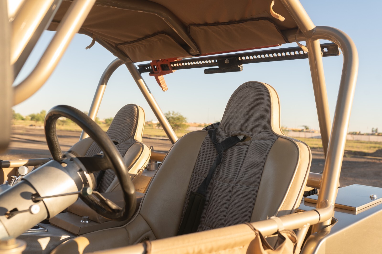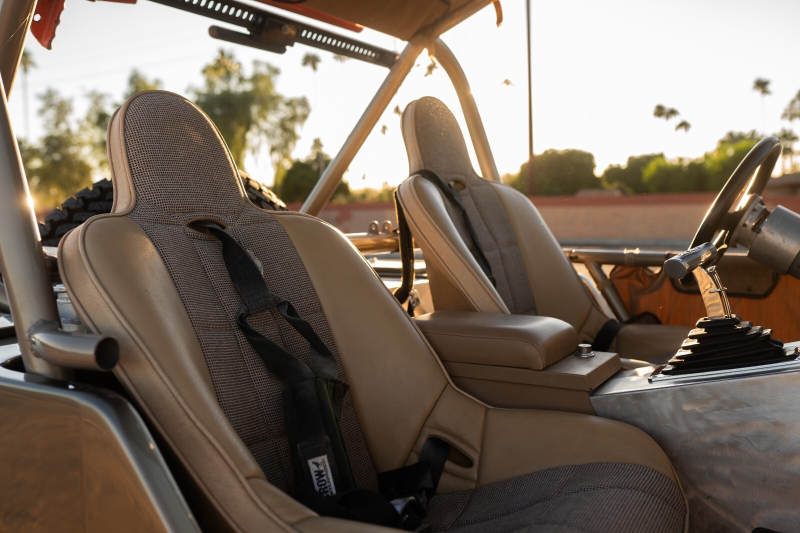 The body showcases a custom Baja fiberglass conversion, giving the truck a wider, more aggressive profile while significantly reducing weight. Paired with a full roll cage, open-air tube doors, and a minimalist interior—this FJ was built with weekend adventures, desert trails, and sunset cruises in mind.