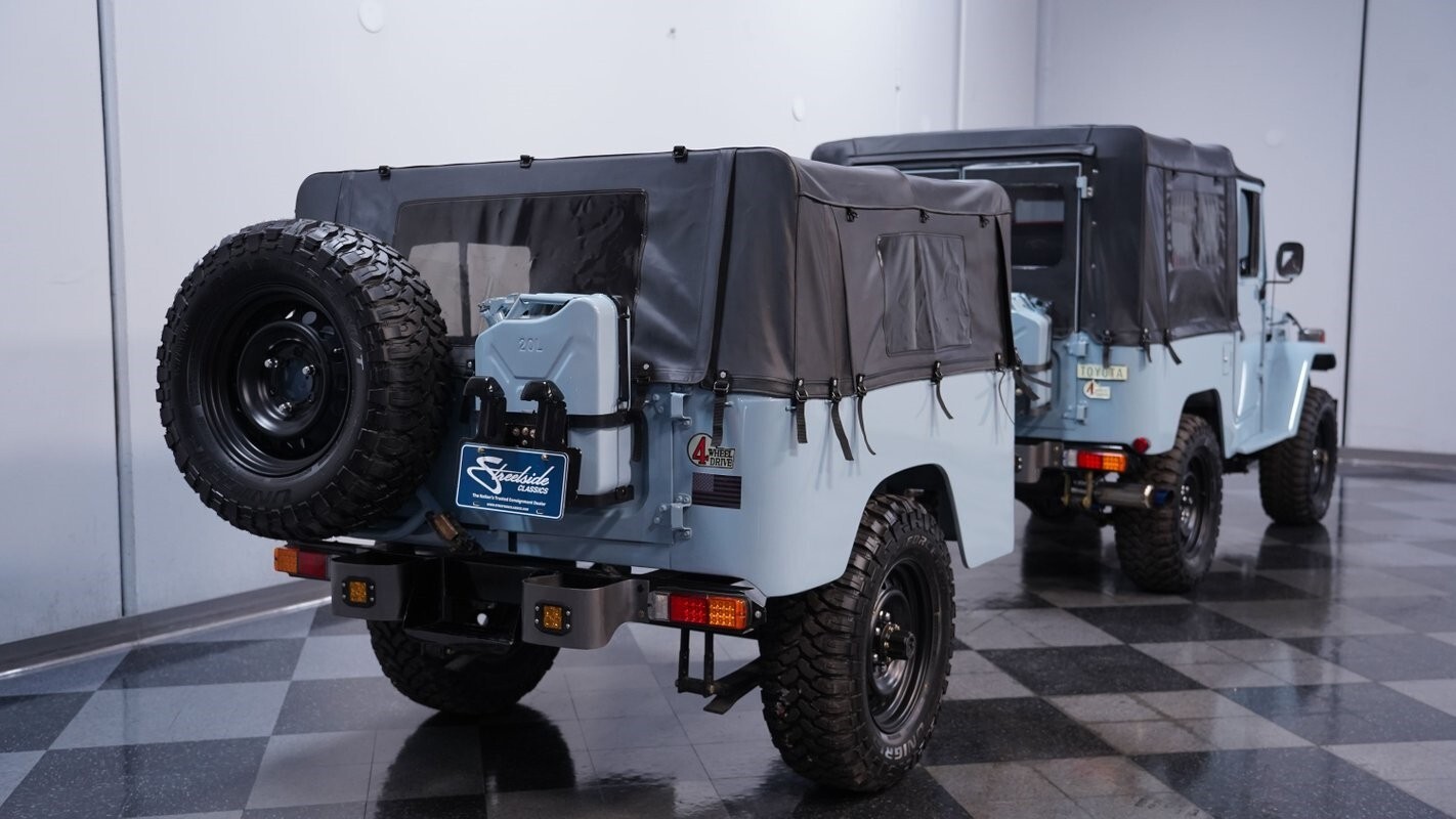 Inside, the Land Cruiser welcomes you with a meticulously restored custom interior featuring brand new vinyl seats that combine comfort with vintage appeal. The center console is equipped with a modern JVC head unit and a touchscreen, blending classic style with contemporary convenience. Power window switches integrated into the console and electric door locks operated via key fob add a touch of modern ease to this rugged classic. Both removable tops are in like-new condition, enhancing versatility and driving pleasure.