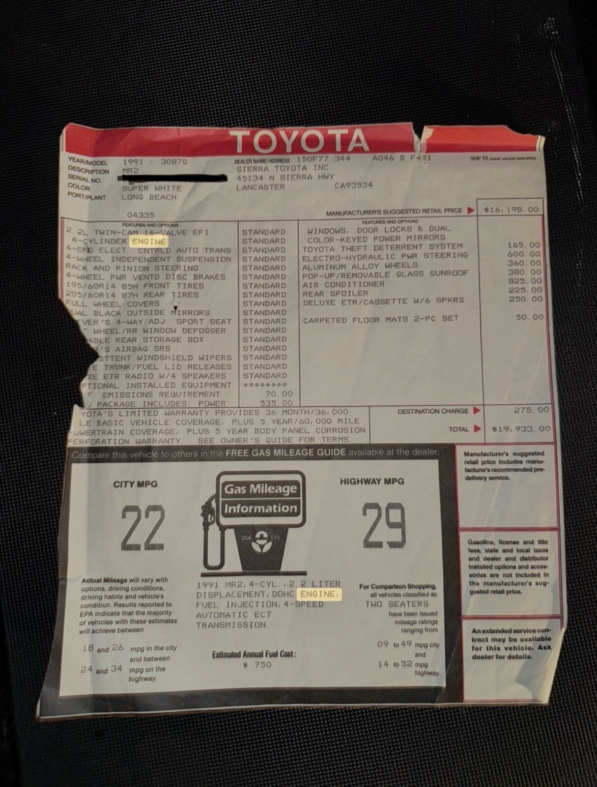 | VIN: | JT2SW21M1M0011933 |