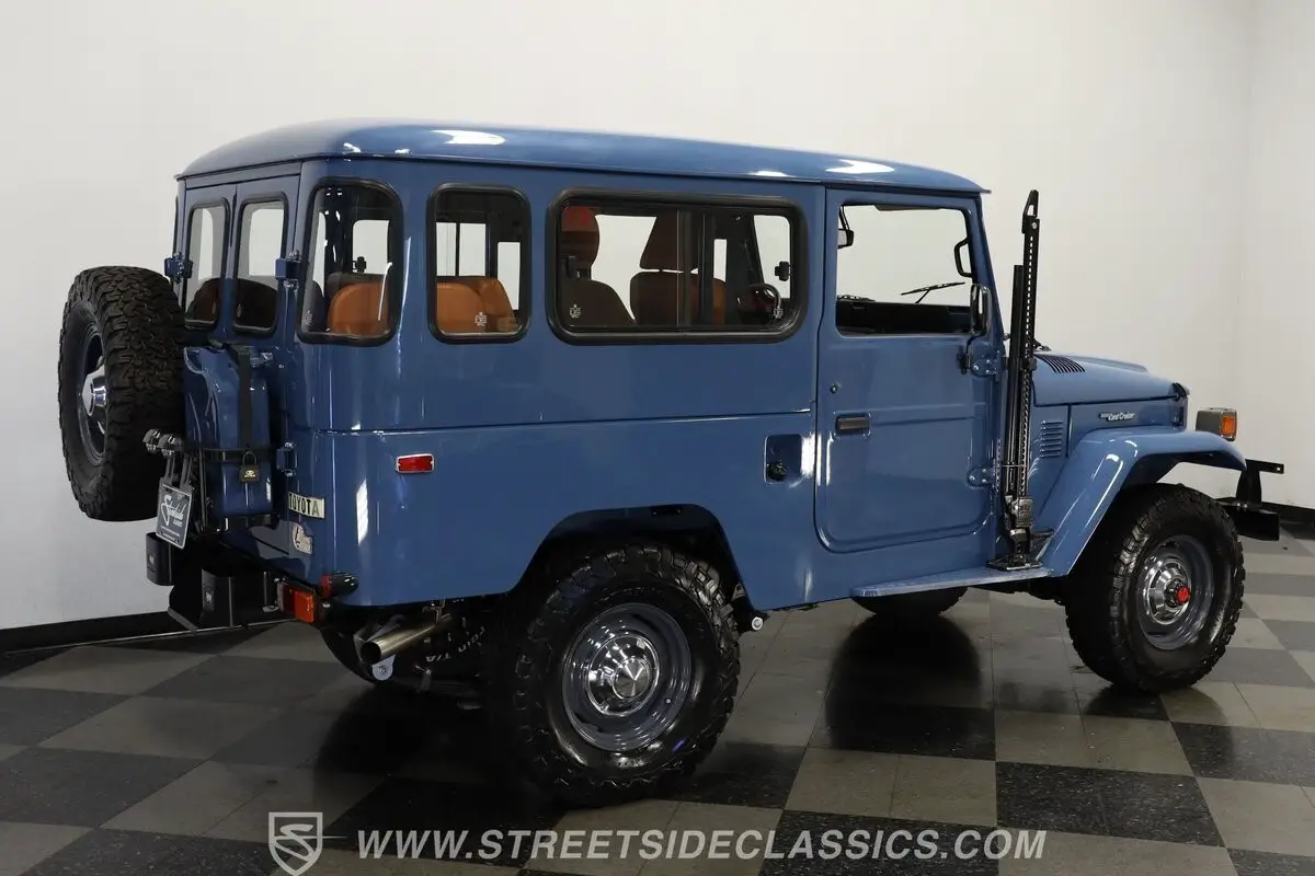 Under the hood, this Land Cruiser houses a robust 4.2L inline six-cylinder engine, paired with a smooth-shifting 5-speed manual transmission. The engine bay shines with fresh blue paint, continuing the exterior's theme, and features a single 2-barrel carburetor, factory-style intake and exhaust manifolds, and an upgraded aluminum radiator to keep things cool. The drivetrain boasts power brakes with front discs, power steering, and an upgraded suspension with Rough Country shocks, delivering a driving experience that is both commanding and comfortable. This truck is as capable on the road as it is off the beaten path.
