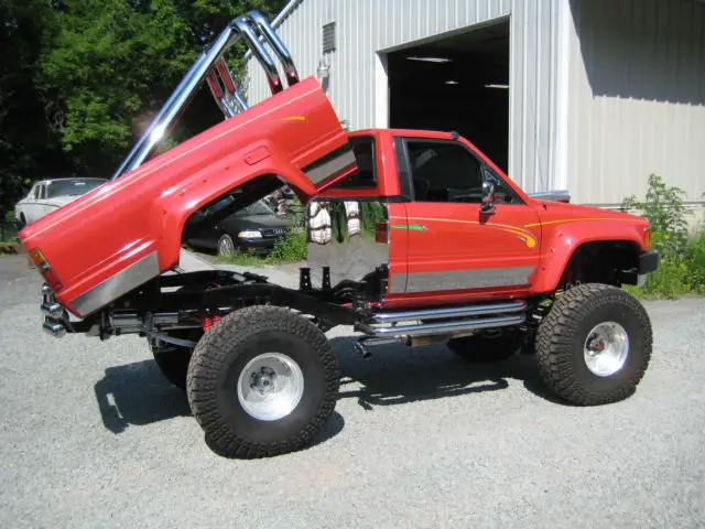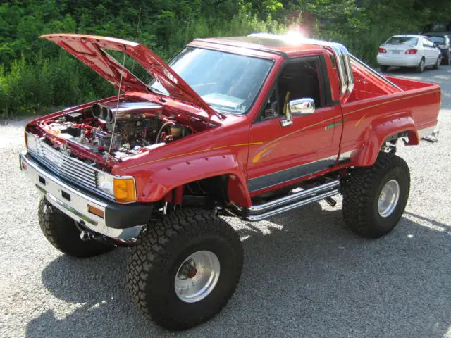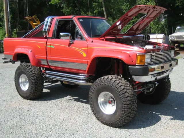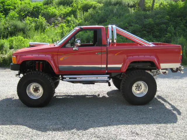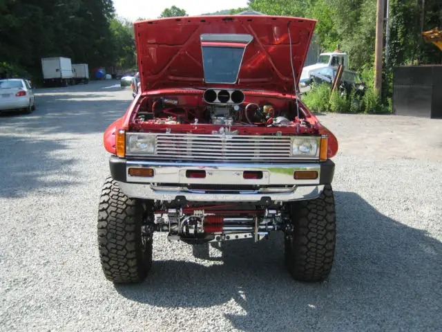 Toyota '84 truck, 4 wheel drive, 350sbc engine, tunnel ram w/(2)8007/390 holley carbs., crane roller rockers, 202 angle plug dart heads, msd ignition, 350 turbo trans w/GM transfer case, Pete Jackson gear drive, 8 qt. pan, diff. housings-springs-shocks and most parts underneath are chrome plated. B-COOL aluminum radiator with puller and pusher electric fans, custom seats w/ 5 point harness's, top can be removed by 4 snap clips, professional custom made transfer case shifter with heim adjustable links, (2) russel 7.5 gal.fuel cells out of a drag boat, Box dumps, has cross over steering w/IFX box, truck is very stable, drives and handles excellent, runs on pump gas, Any questions call or text Mike at; 570-233-3681