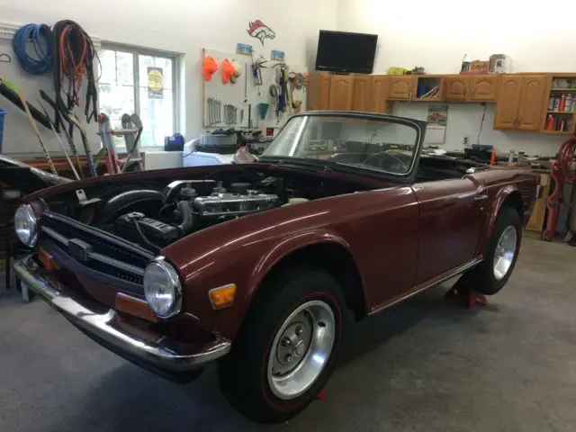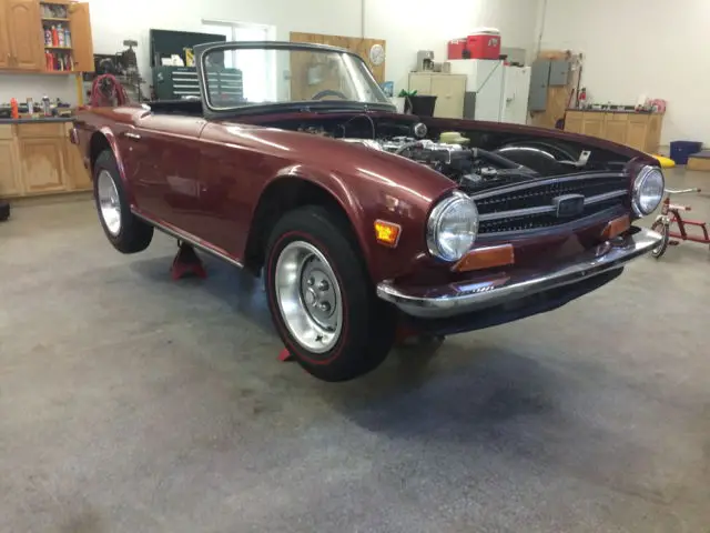 I took this TR6 in on trade at my dealership. Took a short spin in it before I accepted it and it ran good, tranny and clutch were ok. Owner said motor was rebuilt at one point and it's seems to have been. I pulled the valve cover off and it had no sludge ect., it was very clean. Also the compression was 140-150ish in all cylinders. The dash/gauges are taken out but included, he was going to put new wood in. Interior is taken apart but it looks like it's all there. The paint is not very good, and has peeled off the hood. It doesn't have much rust but there is a hole on the floor behind driver's seat. I have a lot more pictures I can send of the underneath, trunk, doors, etc.It does have a new canvas top and dash pad and a few other various parts.