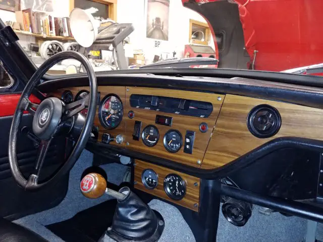The dashboard was replaced last month with a solid walnut dash with a matching radio delete plate that includes NOS Smiths clock and NOS Smiths oil pressure gauge. The clock is not connected as I use a battery cut off switch and it stays switched off. The oil pressure gauge was a gift from a well-meaning friend but is an electric sensor type from a Jaguar and is not connected. I have been running a Summit hydraulic gauge and recorded between 50-60 psi when warm.