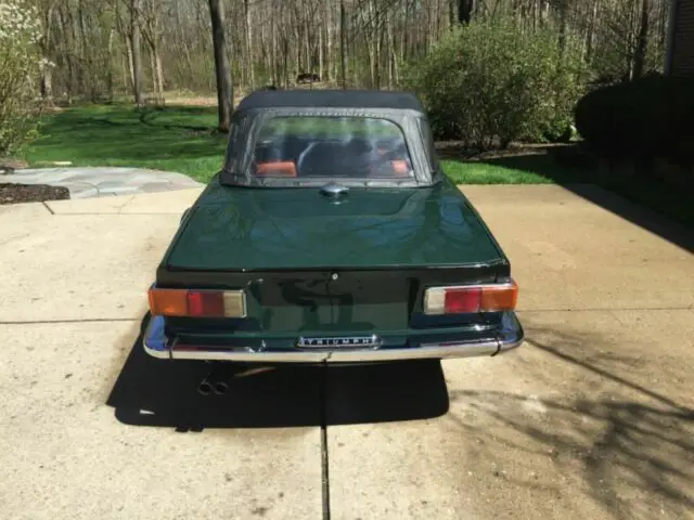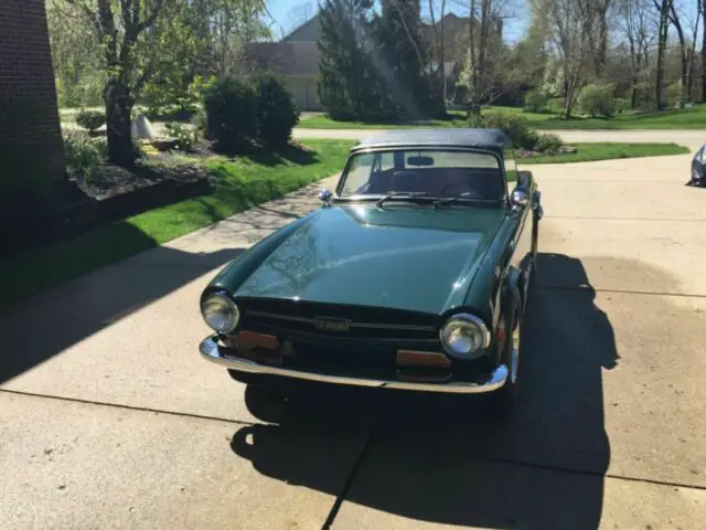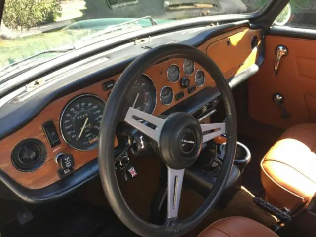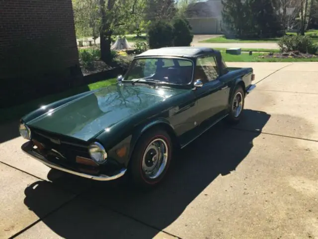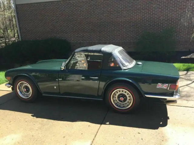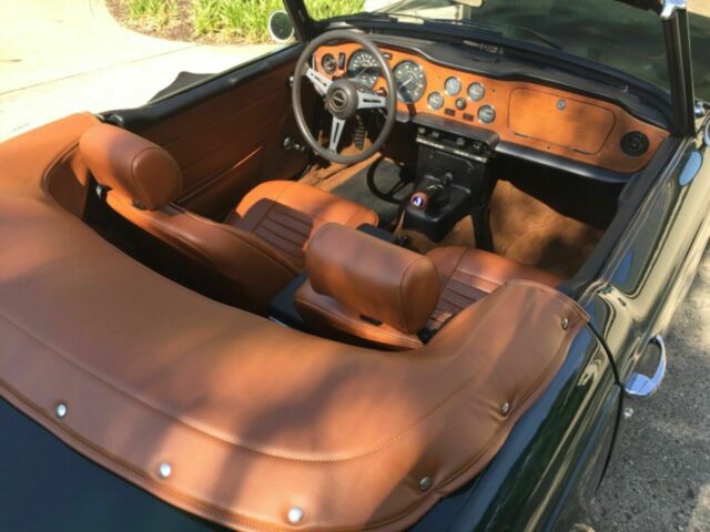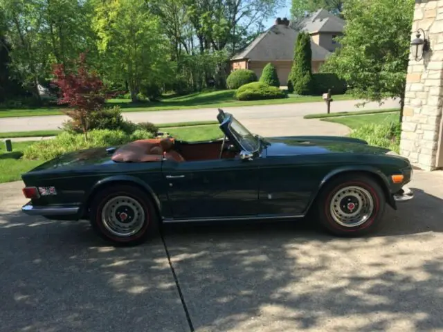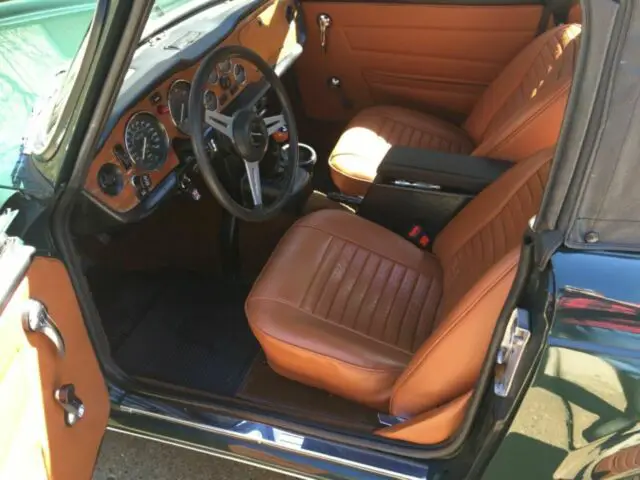 1973 TR6..originally a California car..no rust..gorgeous British Racing Green exterior..new tan interior including carpet..new ‘custom’ boot top to match interior..new black convertible top..5(inc spare) new redline tires..New alternator..new Hayden engine cooling fan..new finger grip door top pads..new ignition coil..stainless steel exhaust..new front disk brakes..newly aligned..newly tuned..new interior cover..new window washing components..new rocker panel chrome strips..new stainless steel TR6 threshold plates..new rubber floor mats..fire extinguisher..1973 owners manual..receipts for all parts purchased within the last three years..