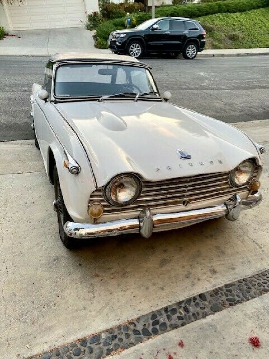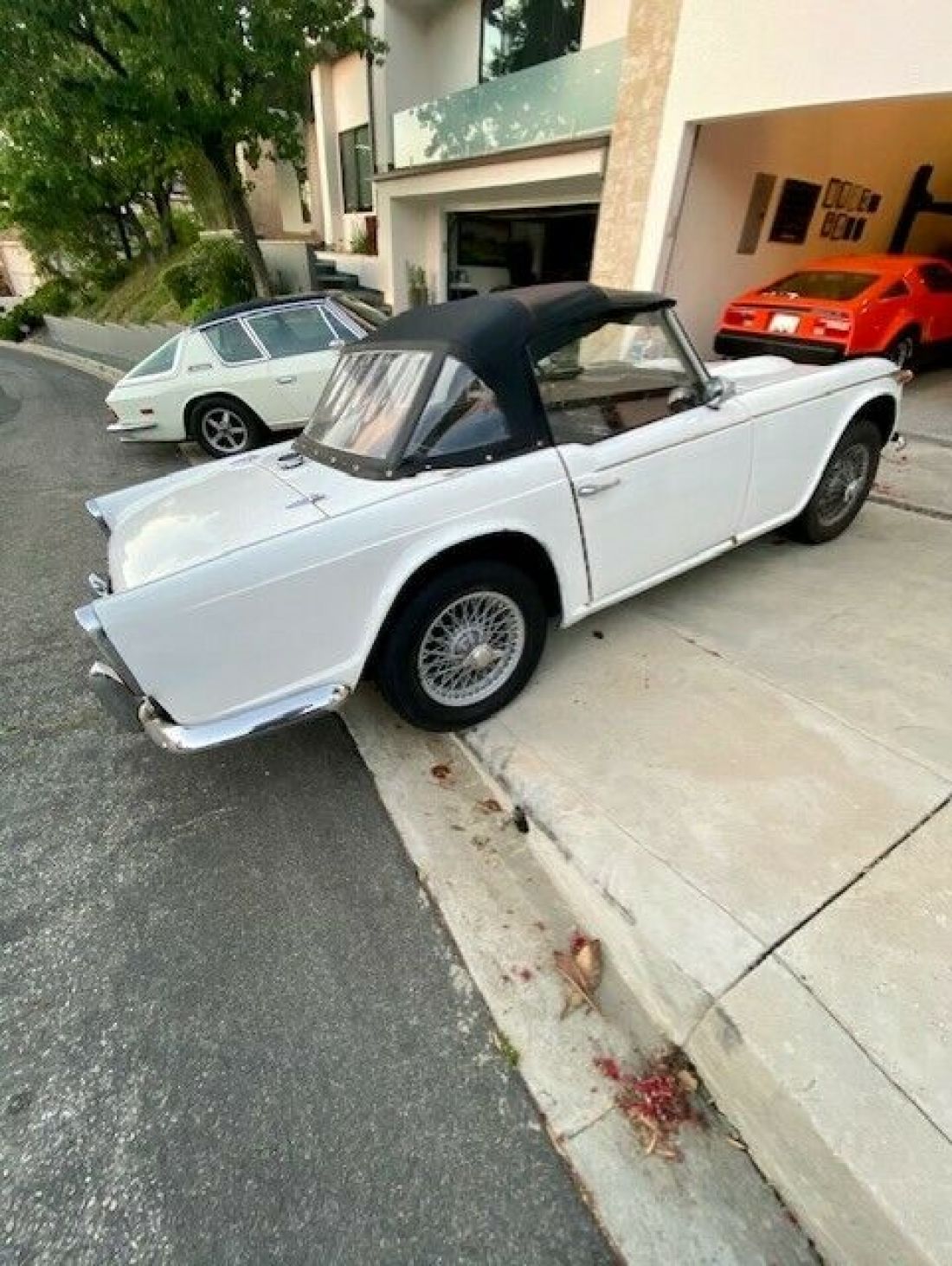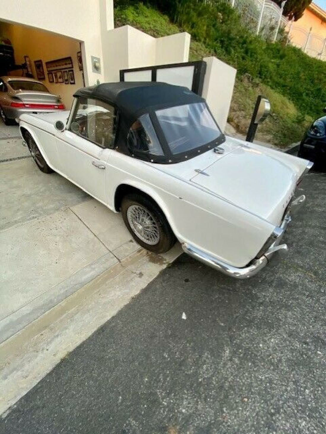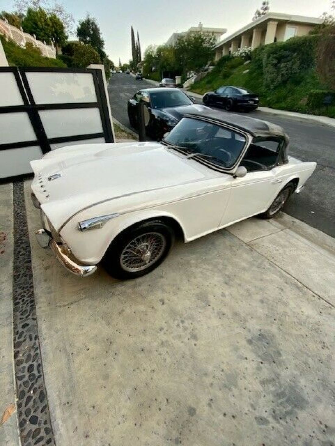 1967 TRIUMPH TR4 with rare overdrive option. The car runs and drives well. The engine is strong and transmission and clutch operate well. The engine does not smoke and the car starts running immediately upon turning the ignition on. Car is white over black, numbers matching, and can be driven and fixed up as you go or is an excellent candidate for a ground-up restoration. The car has a clean title. The top has no rips or tears. The car is an original survivor. The car is sold as-is. Please phone or text on (310)990-8772.