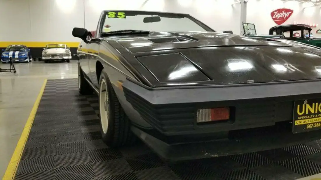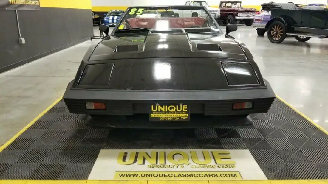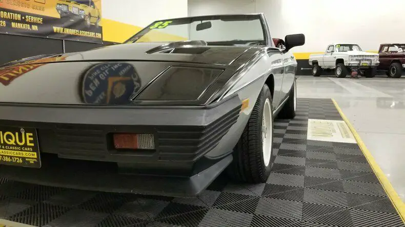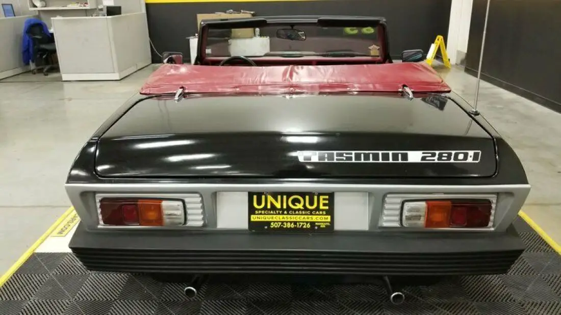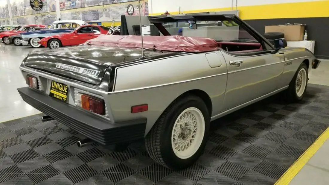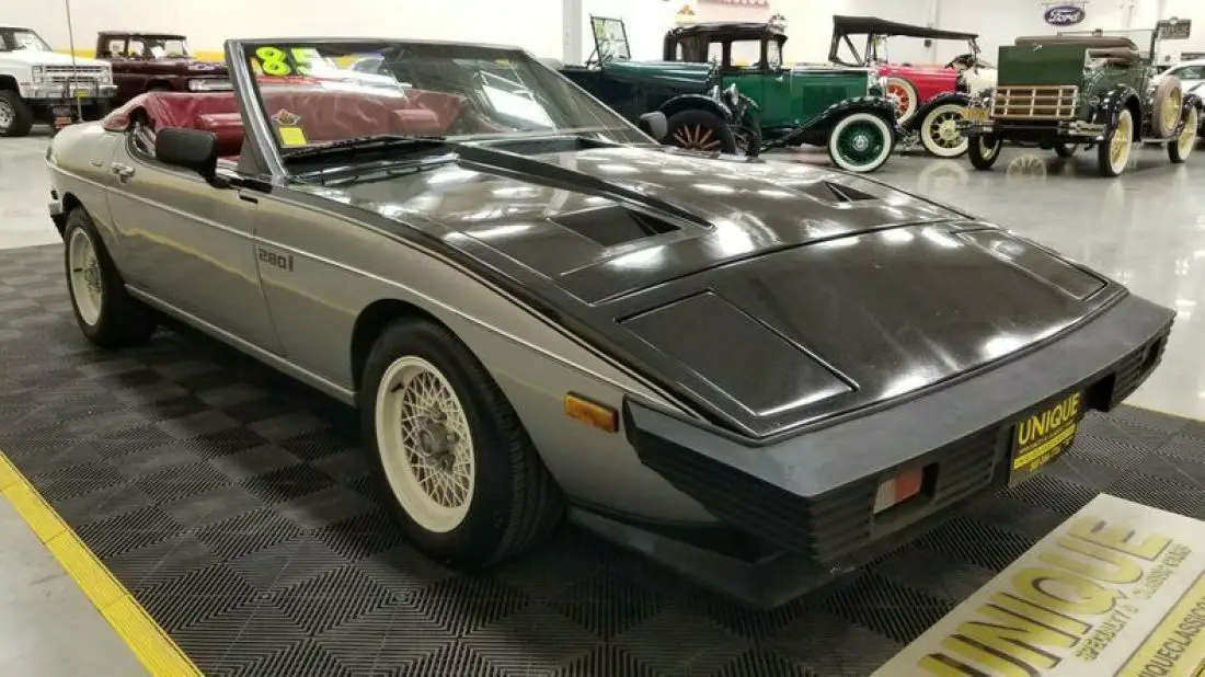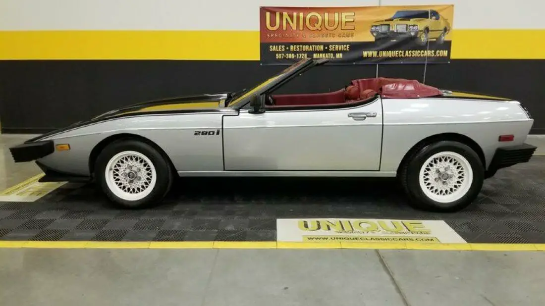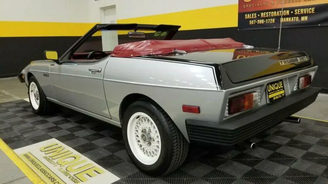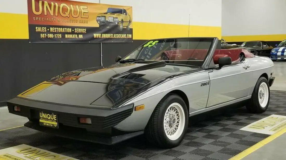 1985 TVR 280i Convertible finished in Silver and Black paint. Paint does show its age and has speckling throughout. Roughly 500 of these were imported stateside throughout the years. This has a unique convertible roof that can be converted into a targa roof via removable roof panel. This is equipped with 4-wheel disc brakes. When this was repainted, things got into the clear/paint has a speckled look. Hood and trunk struts need to be replaced. 2.8L Ford clone V6 powering this TVR, that is paired with a 4-speed manual transmission.Equipped with a BOSCH fuel injection system installed also. Red vinyl bucket seat interior. This car has been in long term storage, may need some TLC. Headlamps are inop, can be raised manually. Tachometer, oil pressure, windows, radio, and voltmeter works correctly. Temp gauge and odometer are inop as well. Driver's side door handle does not open, can be opened from the inside.