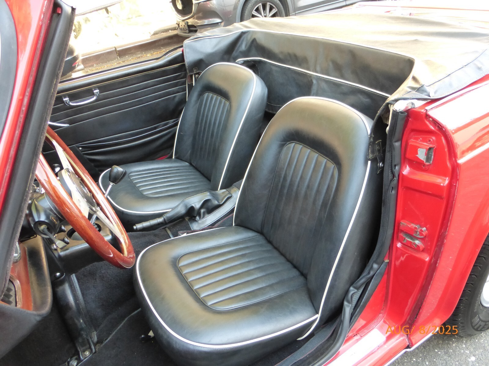 1966 Triumph TR4A that is presentable as it is. The car is in red with a black interior. The convertible top is black and it has the desirable upgrades of sporty alloy wheels and a wooden steering wheel. Car was extensively restored about 20 years ago and still presents well. Paint is nice all around with just a few spots of bubbling. All the chrome is good. Interior is nice and clean. Seats, carpets and door cards are are presentable. Wood on the dash and the dash pad are in good condition. Mechanics are in good working order - engine starts easily and runs smooth. Transmission shifts easily. Brakes and clutch feel good. Trunk and spare tire area are clean. Underside is nice. Frame is straight. Support support cross-section has been repaired. Floors are intact and solid. The car appears to be free of serious rust. Convertible top is usable - there are no rips or tears in the canvas. The two side windows are loose and detached and will need to be attended to. The rear two quarter panels are fiberglass. Car comes with a spare wheel, jack, boot cover, manual and some extra parts. Overall this is a very nice and presentable TR4 that is ready to be enjoyed.More pictures and videos are available on our website. Visit us at Merit Cars.