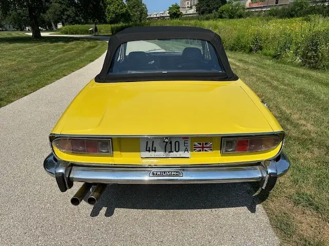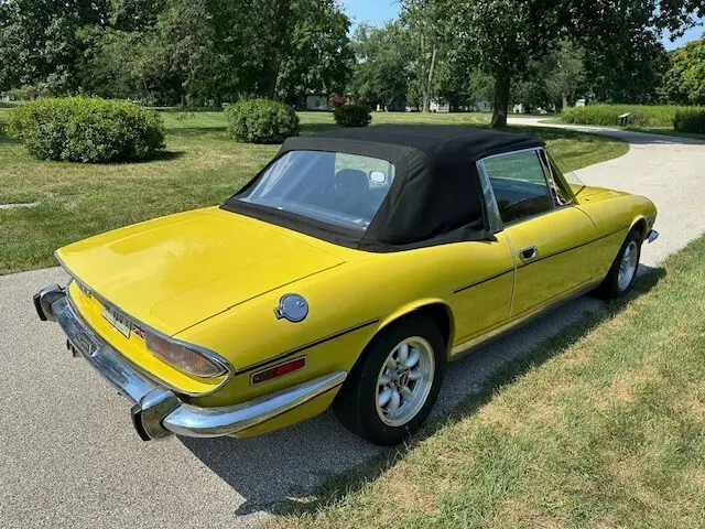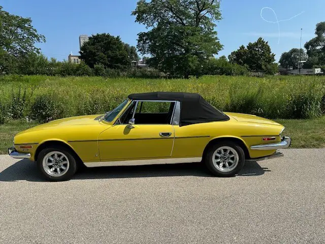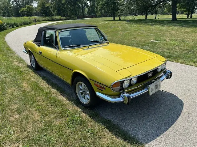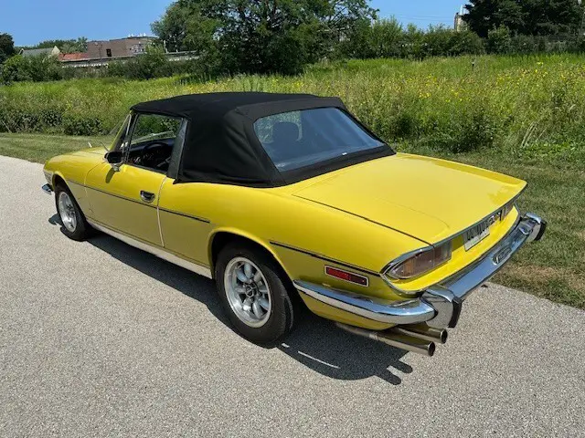 This is a 1973 Triumph Stag Mark II with custom Mimosa Yellow paint, a Chevrolet 350 CID 5.7L 325 HP V8 engine, Chevrolet turbo 700 automatic trans, custom BMW disc brakes up front and custom differential to handle all that horsepower. It has a custom stainless steel dual exhaust and a new mohair convertible top from Stag Hood Factory in England. Originally designed by Giovanni Michelotti for Triumph, it now has more than double the orginal horsepower - while retaining the original looks and feel of the classic British roadster experience. There is no work left to do on this car that I know of - simply buy it and drive worry-free. Car comes with all receipts for any work done in the past 7 years, which is how long I've owned it. No overheating problems and I believe I am the fourth owner. Odometer shows 10,227 miles, which I suspect is the mileage since the new gauges were installed approx 2009.