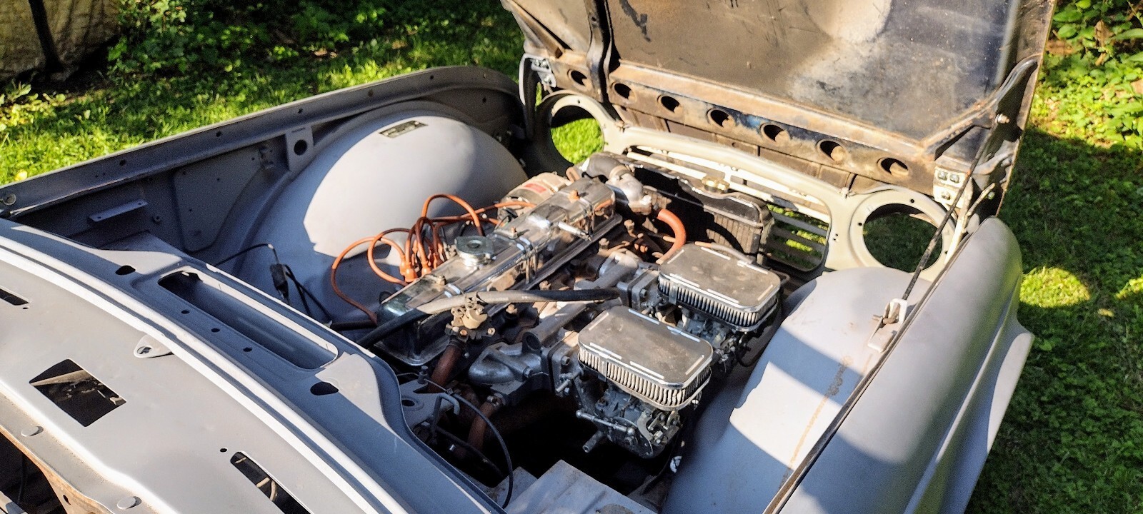 The frame off restoration of the chassis is complete. The motor was rebuilt by the previous owner to 20 over and a medium hot cam installed, as per the previous owner, but never run. On completion of the rolling chassis, I ran up the motor for 10 minutes to make sure it was OK and it held 60 pounds of pressure, tho it will need to be fine tuned and the Weber carburetors need tuning also. 4 new tires and one extra painted rim.