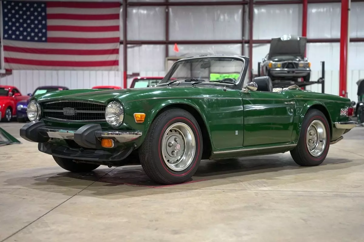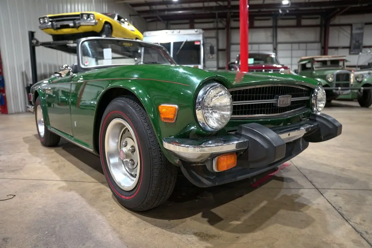 GR Auto Gallery is excited to present this 1976 Triumph TR6, finished in the iconic British Racing Green over a black leather interior. The exterior captures everything people love about classic British roadsters, from its long hood and squared-off Karmann-styled rear end to the chrome bumpers and red-trimmed tires. Its clean lines and purposeful stance make it instantly recognizable as one of the most beloved sports cars of the 1970s.