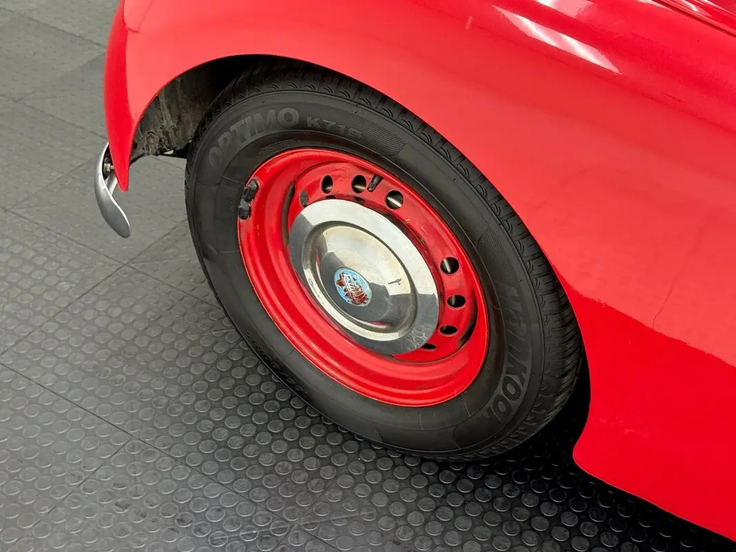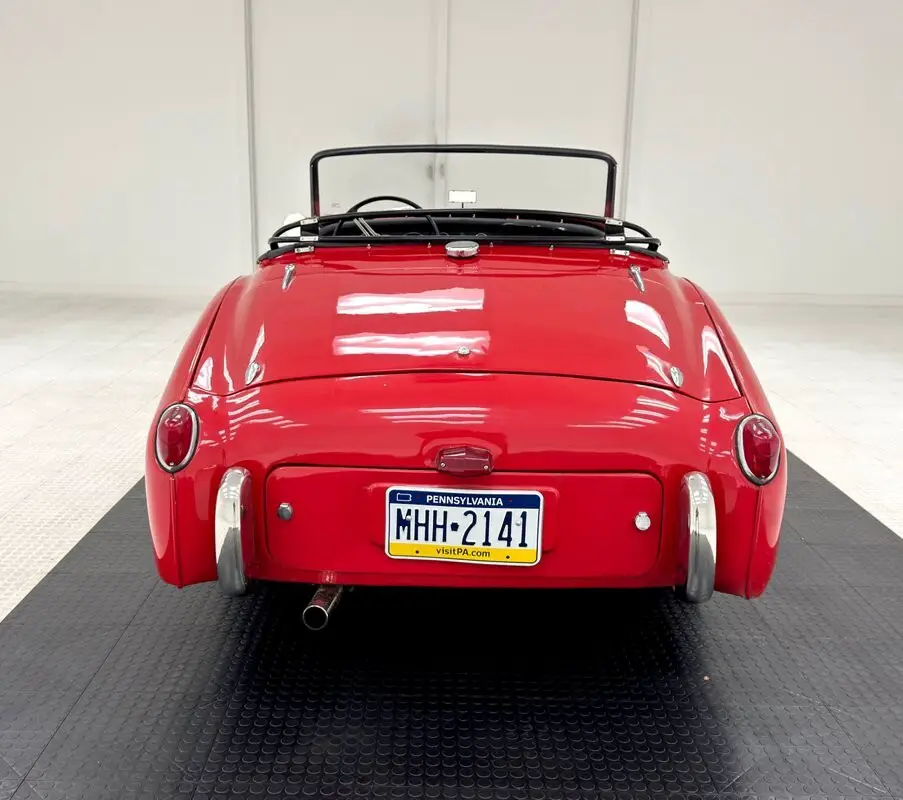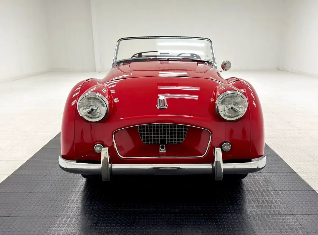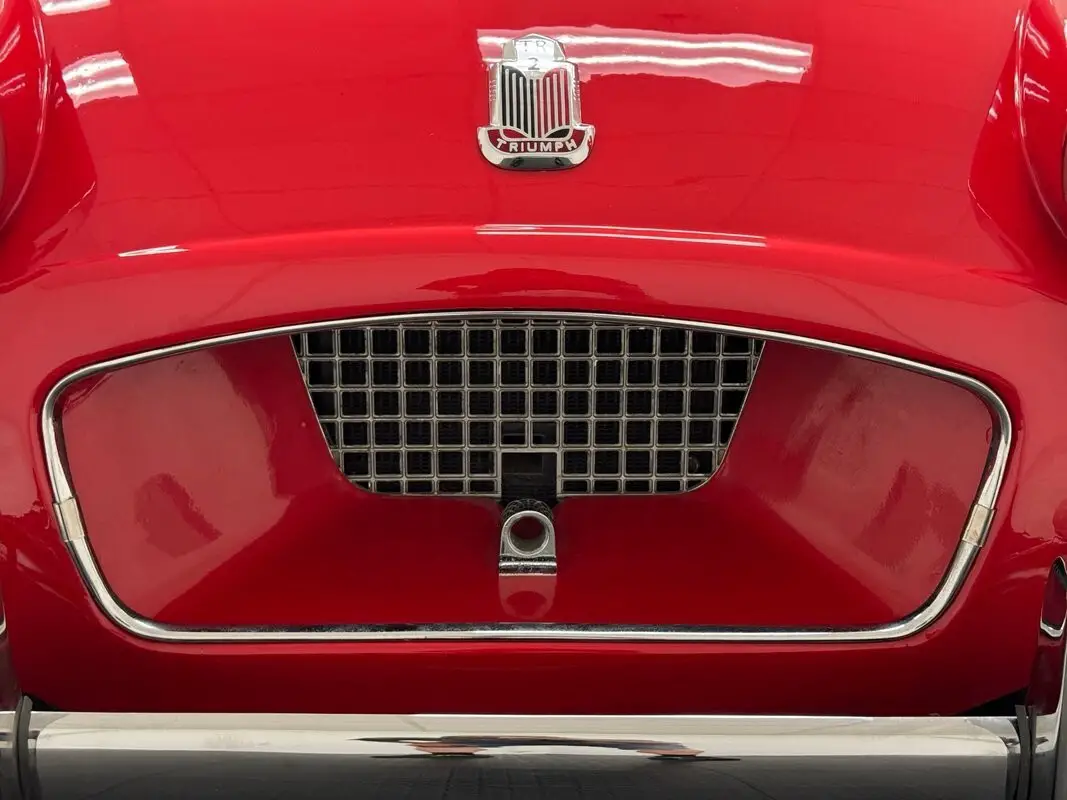 There are two colors that rise to the top of desirability for roadster, British Racing Green and red, in this case, a bright Cherry Red that adorns this classic and makes it an instant head turner. When you do turn your head, you might not recognize that face, unique to early Triumphs and presenting with a wide eyed, open mouthed face, pleasingly cartoonish and welcoming. From there, things sweep rearward including the dramatic front fender that is articulated as it dips all the way through the door at a point when the top of the door is about 2 feet from the ground. The rear fender mirrors the angles and the windscreen rakes at a dramatic angle, rare at a time when even roadsters kept a more upright posture. The 15-inch red wheels carry some of the only contrasting material with polished hubcaps that pick up on the metal gravel guards, chrome bumpers and bumperettes. The paint is in good condition with imperfections noted with paint runs, uneven filler on the bottom edge, minor bubbles, chips, and scratches.