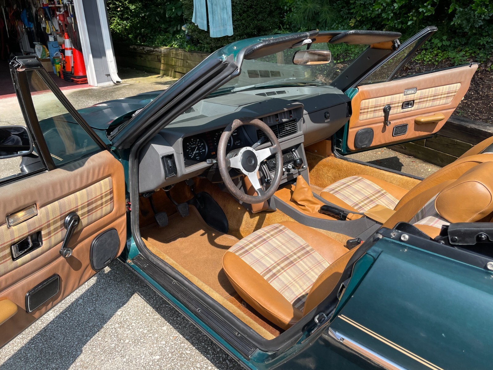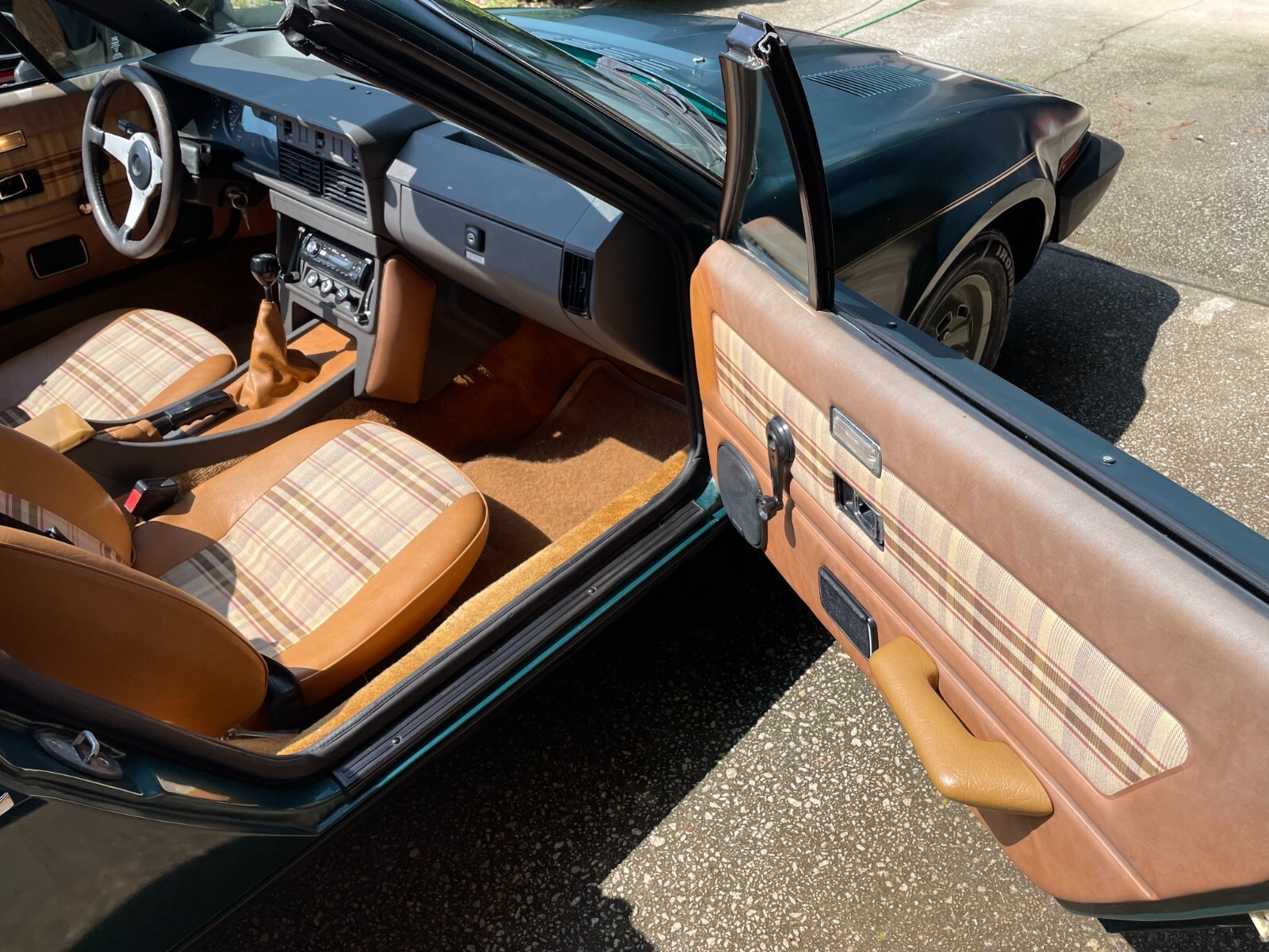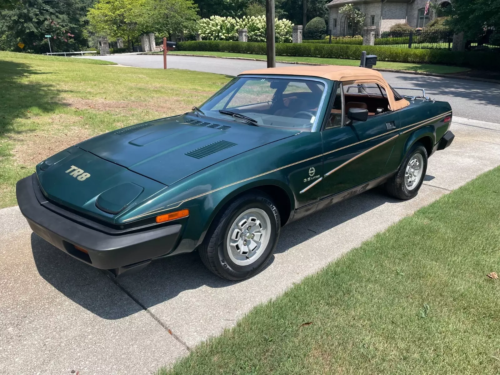 1980 Triumph TR8 Convertible finished in Poseidon Green Metallic with Tan Plaid interior. This rust free example with 32,398 miles (original speedometer was replaced on 7/17/82 showing 8442 miles plus 23,956 now on the replacement) spent the majority of its life in storage, in Texas and is mostly original. The body is straight with no signs of body filler and features a chrome and stainless luggage rack. There are several small scratches and two small dings on the left side and one 6” scratch on the right front fender arch. The paint is faded and shows signs of age. The interior features the original tan Tartan seats and door panels in excellent condition with slight fading on the top surfaces of the door cards. The dash top is in original condition and is entirely without cracks. After removing the original top and frame, the frame was stripped, repainted and fitted with new webbing and felt prior to installing a new premium tan Robbins convertible top. The original black top boot is also included. The clock and gas gauge are not working. A replacement AM/FM Blue tooth radio was installed. The original spare tire and wheel, which have never been on the ground, as well as the original jack, crank and lug wrench are also included. In preparation for sale a major service/update was performed which included replacement of the rear shock absorbers with KYB gas filled units as well as KYB front strut inserts. The entire ignition system was replaced including spark plugs (Champion N12Y), spark plug wires, distributor cap and rotor, ignition coil and a Pertronix electronic ignitor (LU 281) replaced the original problematic Lucas amplifier. Both air filters were replaced. The engine oil was drained and refilled with Castrol GTX 20W50 conventional motor oil and the filter was replaced with a Fram tough guard filter. Power steering system was drained, flushed and refilled with Penzoil power steering fluid and conditioner. Cooling system, which has an upgraded high performance all aluminum radiator was flushed and new anti-freeze/coolant installed. The brake and hydraulic clutch systems were flushed, and brake fluid was replaced with Valvoline synthetic DOT 3-4 fluid. The shifter mounting bushings were replaced. The manual 5 speed transmission was drained and refilled with 2 quarts of GM synthetic synchromesh manual transmission fluid and shifts smoothly. The differential was drained and refilled with Valvoline 75-90w gear lube. The vehicle starts, runs, drives and stops great and is a blast to drive!. The receiver/dryer for the AC system was replaced and the system was evacuated and recharged with R12 Freon. The original Catalytic converters were removed. The original document packet with Owner’s manual and maintenance manual is also included. Originally sold on 9/13/81 and then resold on 4/21/82 to the second owner who kept a meticulous record of all repairs and maintenance, including gasoline purchases with dates, mileage and cost per gallon. The journal is included with the sale. This excellent “daily driver” quality vehicle will be sold with a clean Georgia title and Bill of Sale.