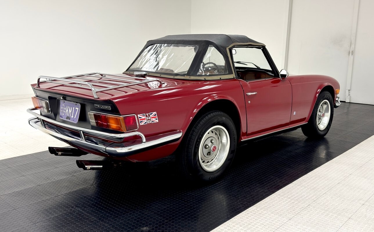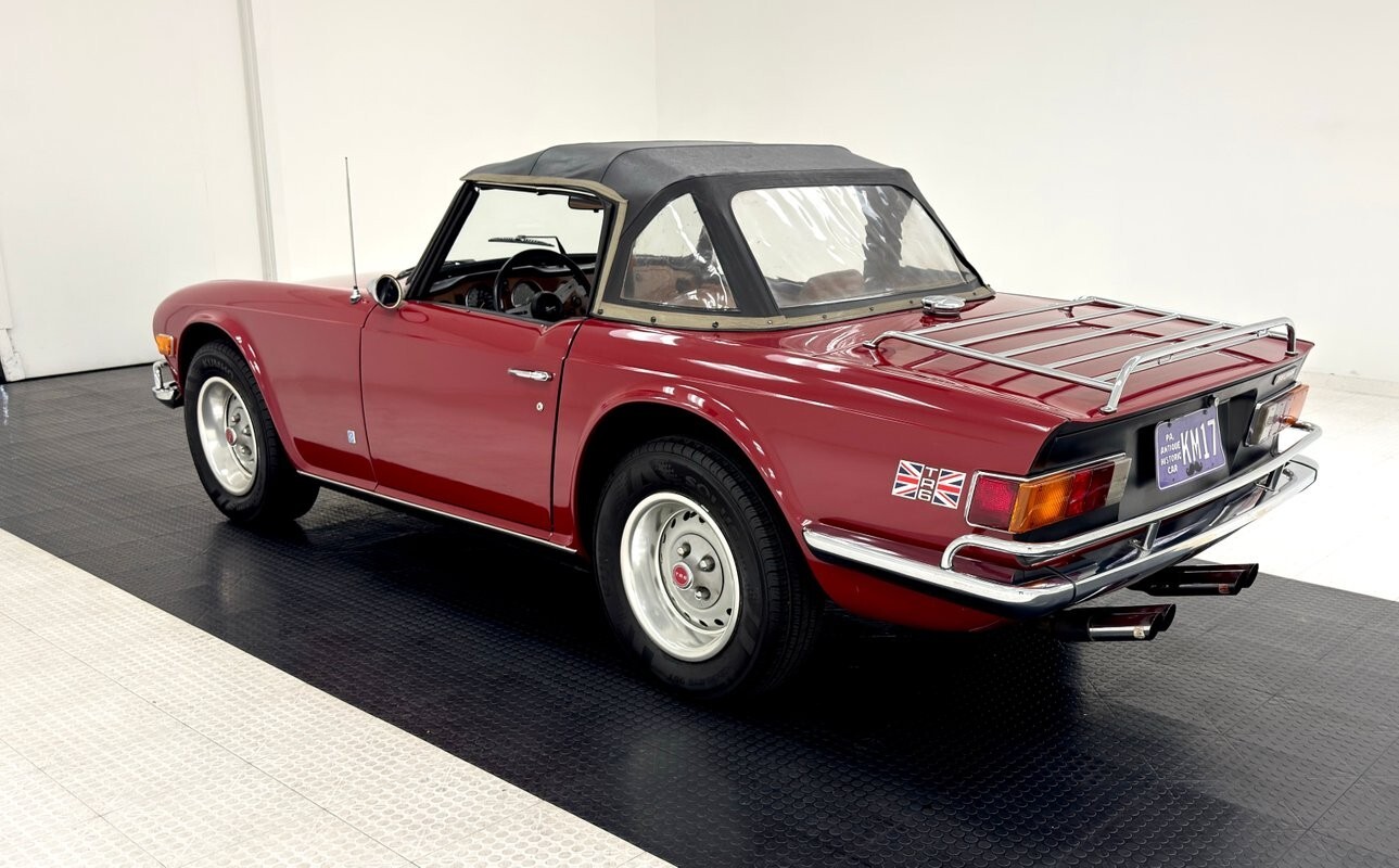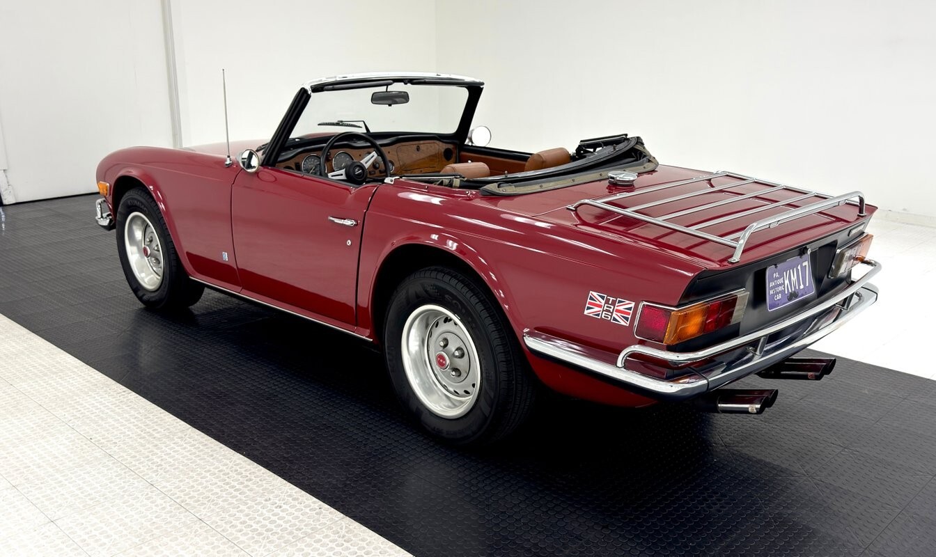 The most muscular looking of Triumphs to come along, they look great in just about any color and this example is festooned in Damson Red paint, sandwiched by the black of the canvas top and of course, tire below. Those tires are mounted on 15-inch wheels with TR6 on the center cap, and they have a date code of early 2022. The rear panel is also black which highlights the multi-hued tail lights that wrap the corners. Both front and rear bumpers have tubular bumper guards, a feature we rarely see and apparently a dealer option back in the day. Out back, the Union Jack is on the fenders and twin dual exhaust rises from beneath the bumper and a luggage rack is provided above, and all the chrome is in very nice condition. Imperfections include some cracking in the paint, some paint runs, and a scuff.