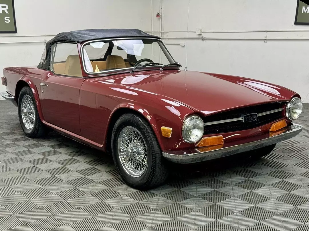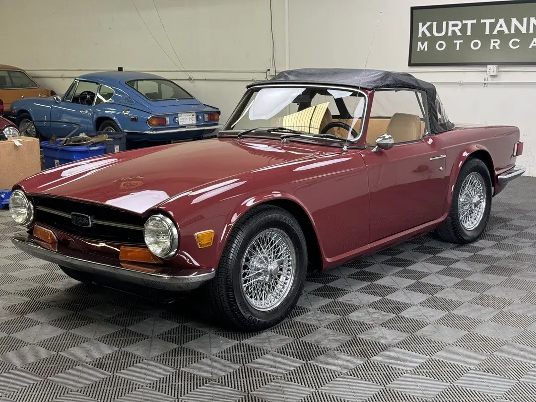 1972 TRIUMPH TR6 CONVERTIBLE. DAMSON RED WITH BISCUIT INTERIOR, BLACK TOP AND TONNEAU COVER. 4-SPEED, 72-SPOKE CHROME WIRE WHEELS. EXTENSIVE MECHANICAL AND COSMETIC RESTORATION. SUPER CAR.