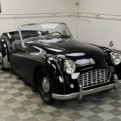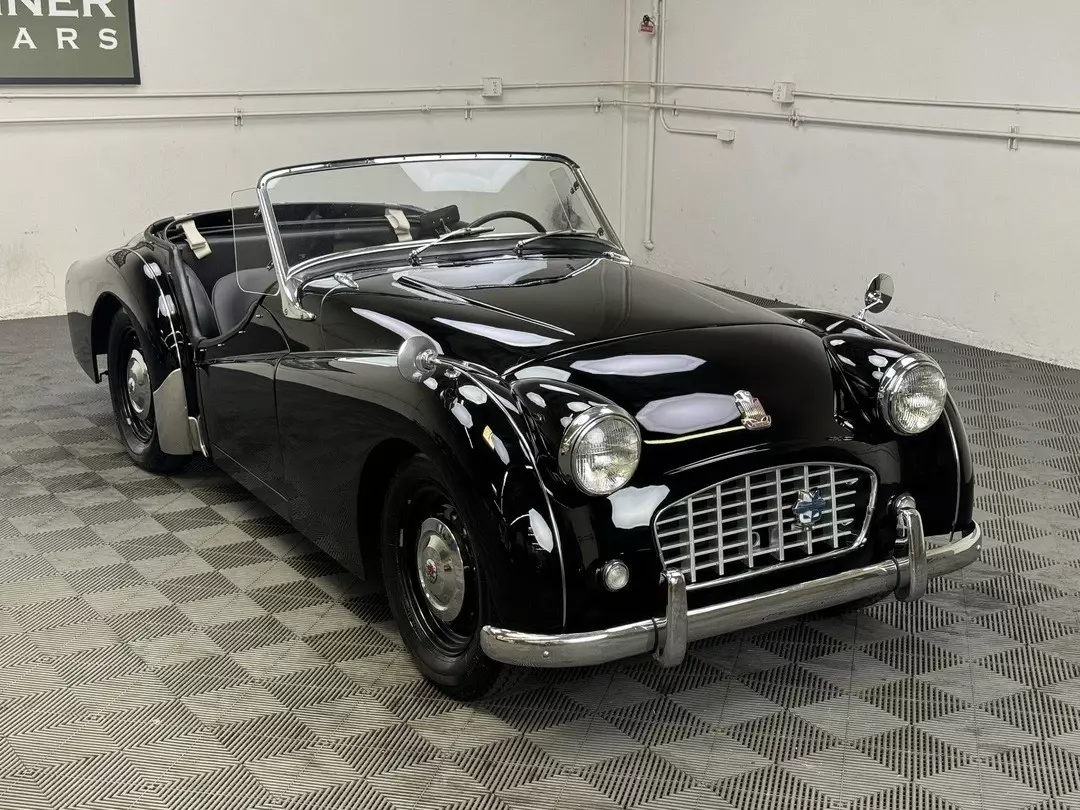1957 TRIUMPH TR3 SMALL MOUTH ROADSTER. BLACK WITH BLACK LEATHER TRIM. NEW BLACK TOP, TONNEAU, SIDECURTAIN SET. 4-SPEED, DISC WHEELS. EXCEPTIONAL, WELL PRESERVED, RESTORED WEST COAST CAR SHOWING 16,522 MILES.