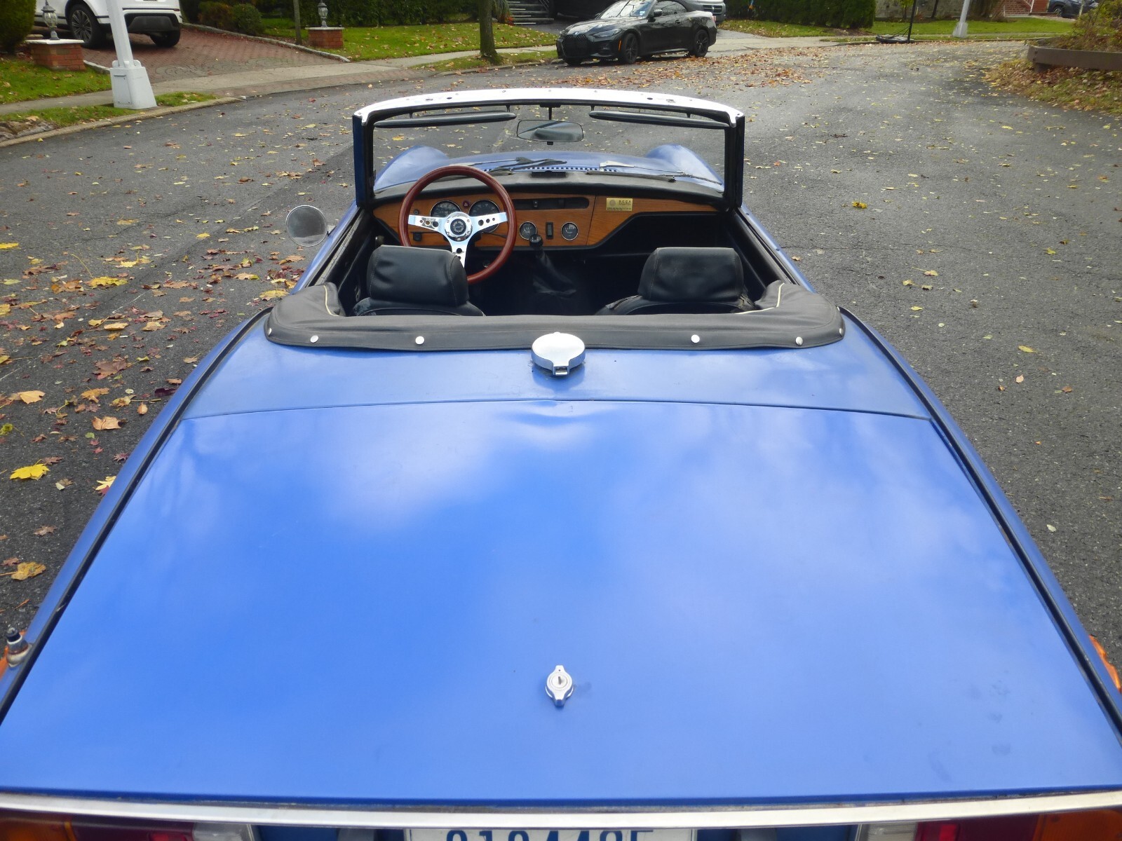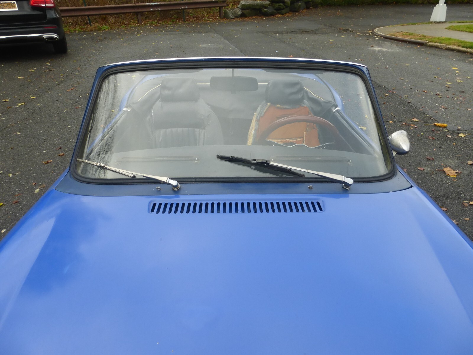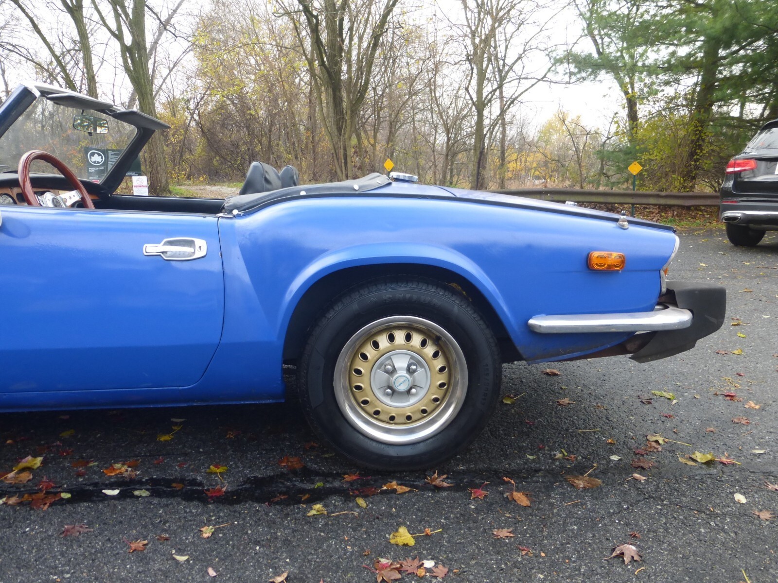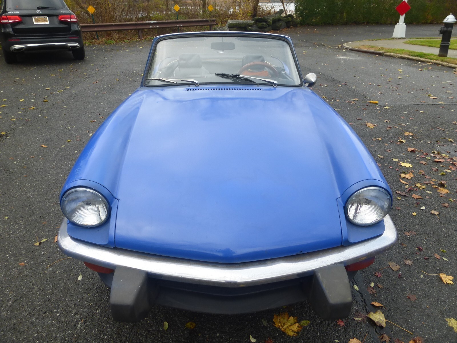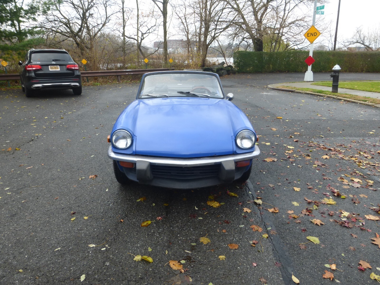 1975 Triumph Spitfire 1500 that can be made into a driver. The car is in blue primer with a black interior and it has a white convertible top. It has the desirable option of overdrive transmission. The car was originally Delft Blue from the factory (code 136) and is now in blue primer. Interior is black vinyl (code 11) and is showing age. Mechanics are in working order – engine runs well and the car drives decent. Trunk is clean. Underside shows rust on the driver’s side floor pan. Frame appears to be straight and solid. Convertible top is in usable condition. Car comes with a spare wheel, jack and some extra parts.More pictures and videos are available on our website. Visit us at Merit Cars.