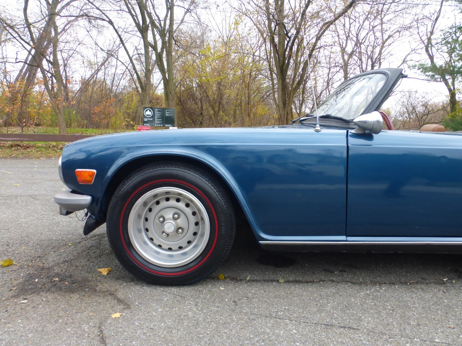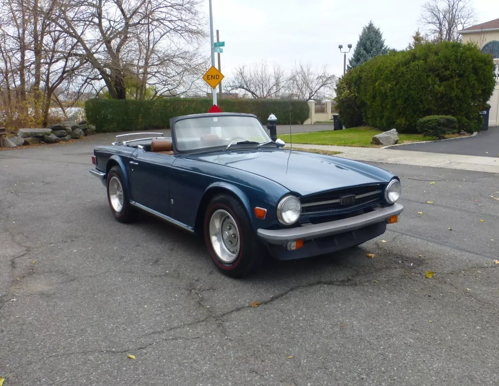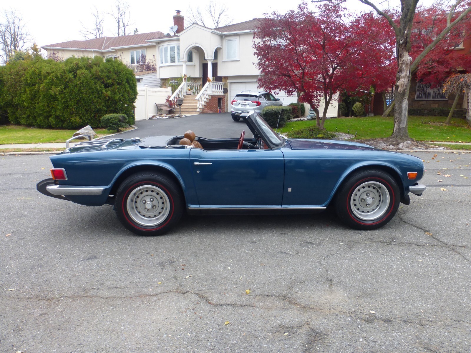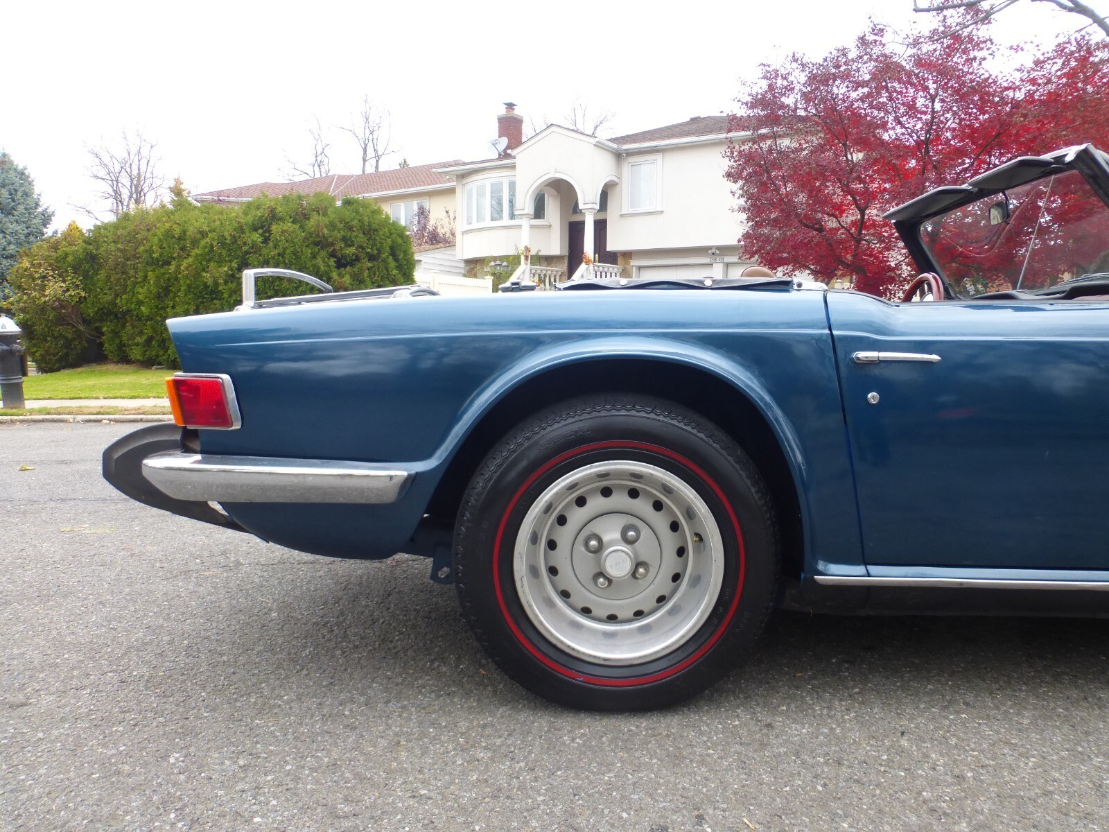 1975 Triumph TR6 that can be used as a driver. The car is in blue with a brown interior (originally French blue with a black interior) and it has the Michelin red-line tires. It has the rare options of factory hardtop and air-conditioning. It is a good driver quality car. Paint is decent all around with no major flaws. Chrome is showing some aging. All the glass is good. Interior is in good condition – seats are usable and the carpets are clean. Mechanics are in good working condition – engine starts easily and runs strong. Clutch, transmission and brakes are working well. Trunk and spare tire area are solid. Underside is nice – frame is straight and solid and the floors are in good condition with just one small area of rust. Hardtop is in good condition. Car comes with a boot cover, spare wheel, luggage rack and some extra parts.More pictures and videos are available on our website. Visit us at Merit Cars.