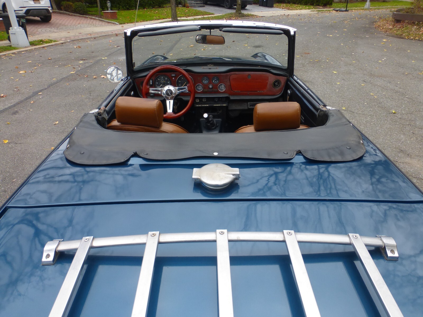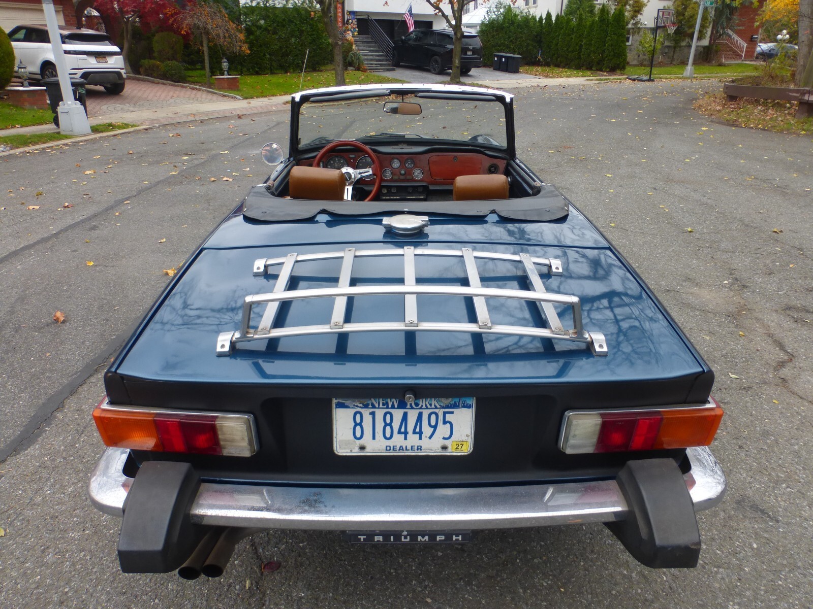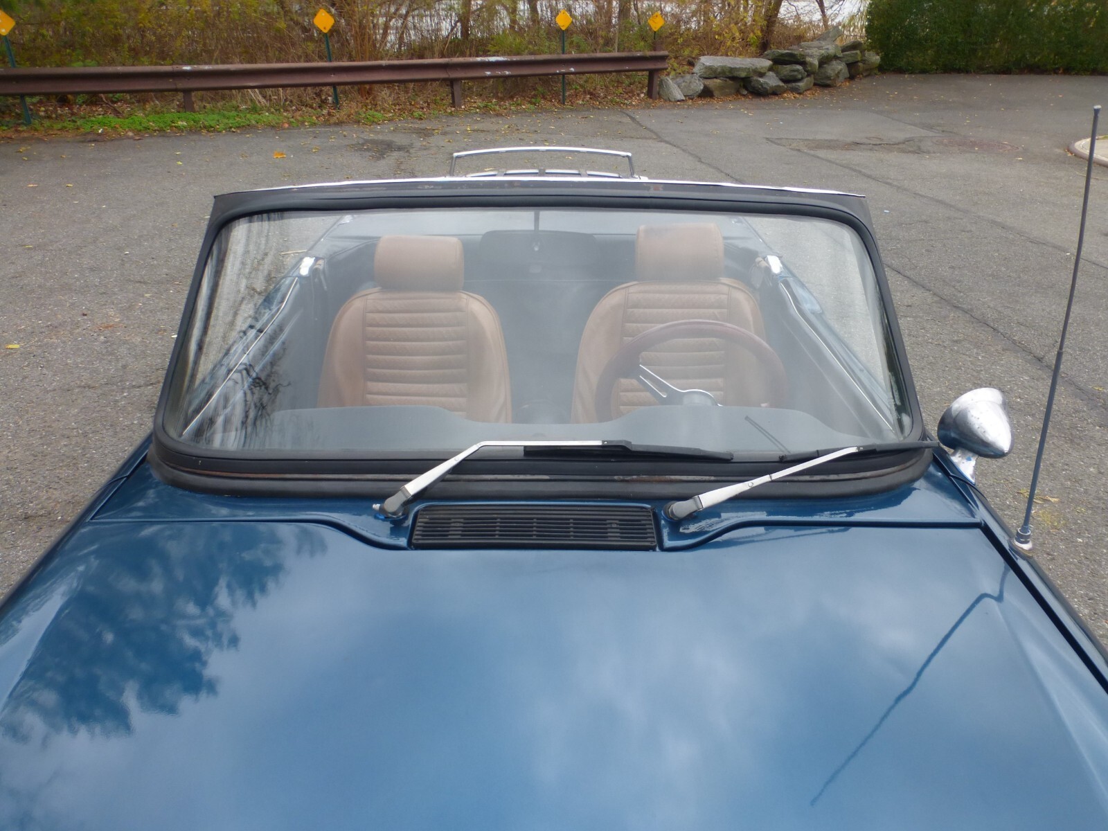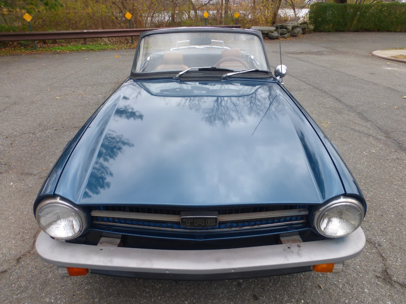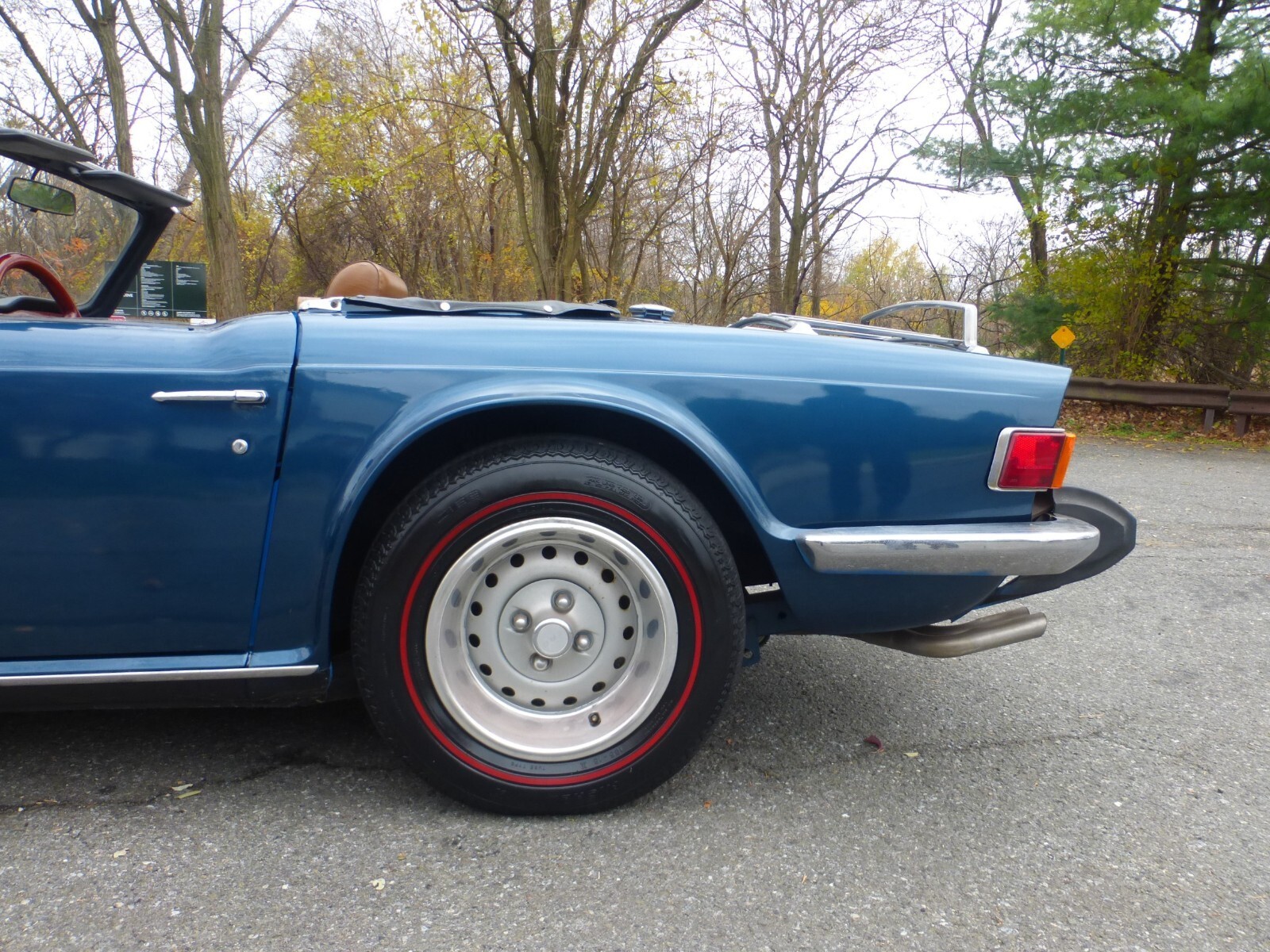 1975 Triumph TR6 that can be used as a driver. The car is in blue with a brown interior (originally French blue with a black interior) and it has the Michelin red-line tires. It has the rare options of factory hardtop and air-conditioning. It is a good driver quality car. Paint is decent all around with no major flaws. Chrome is showing some aging. All the glass is good. Interior is in good condition – seats are usable and the carpets are clean. Mechanics are in good working condition – engine starts easily and runs strong. Clutch, transmission and brakes are working well. Trunk and spare tire area are solid. Underside is nice – frame is straight and solid and the floors are in good condition with just one small area of rust. Hardtop is in good condition. Car comes with a boot cover, spare wheel, luggage rack and some extra parts.More pictures and videos are available on our website. Visit us at Merit Cars.