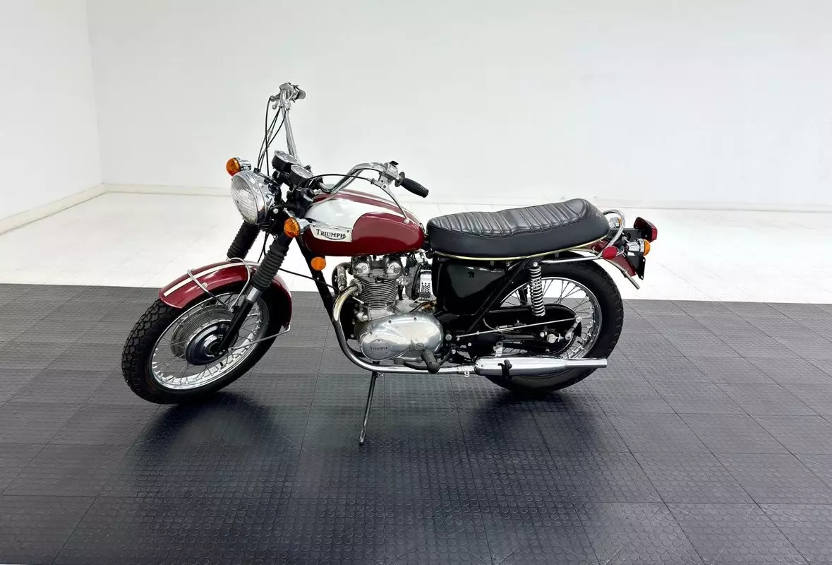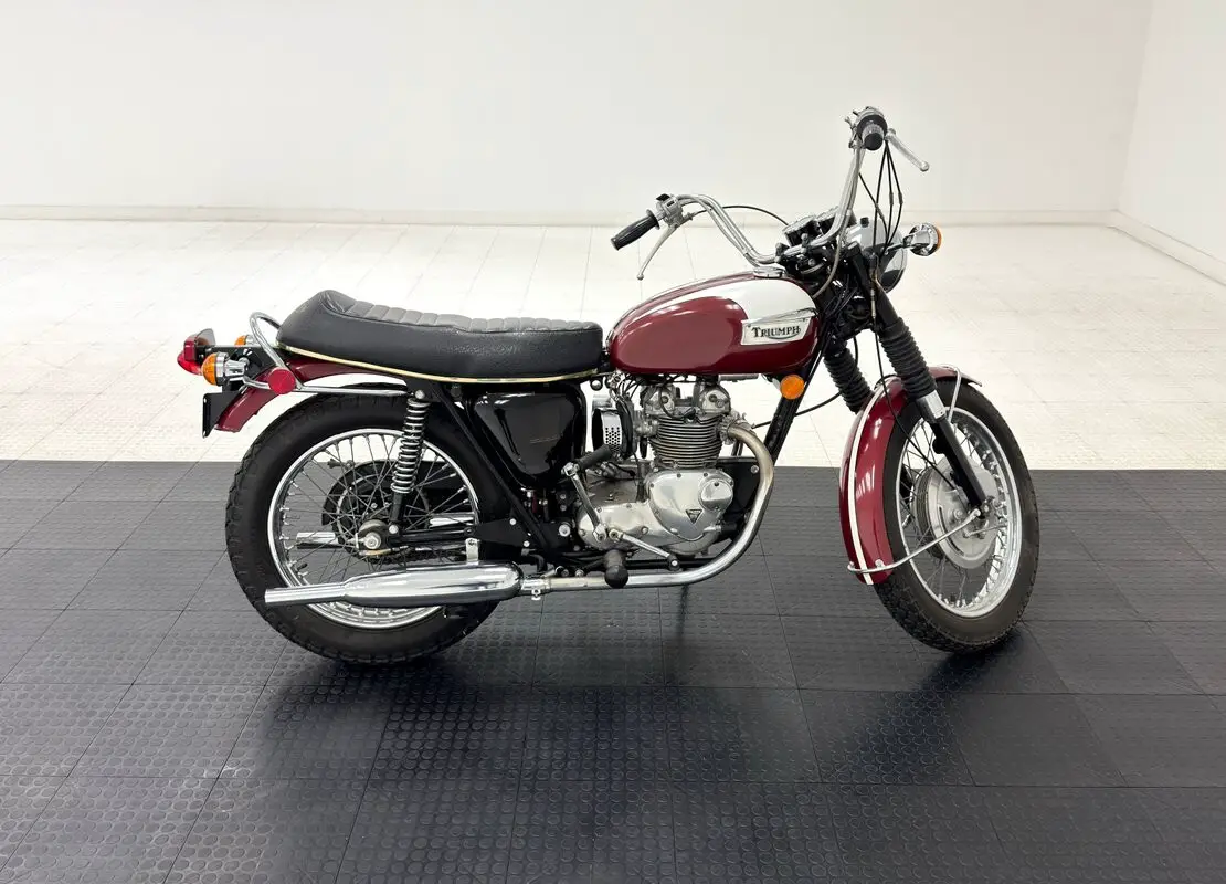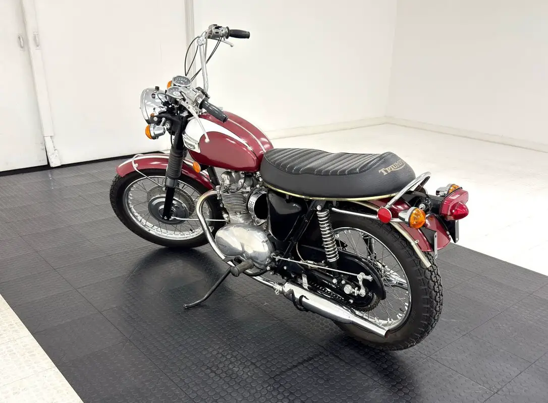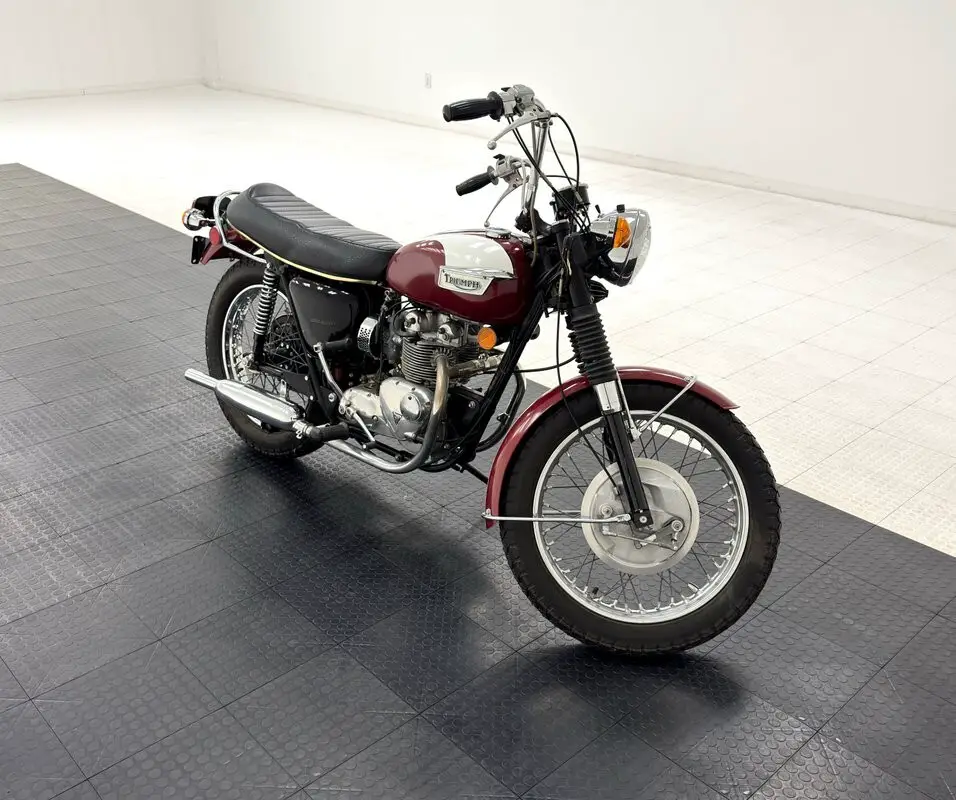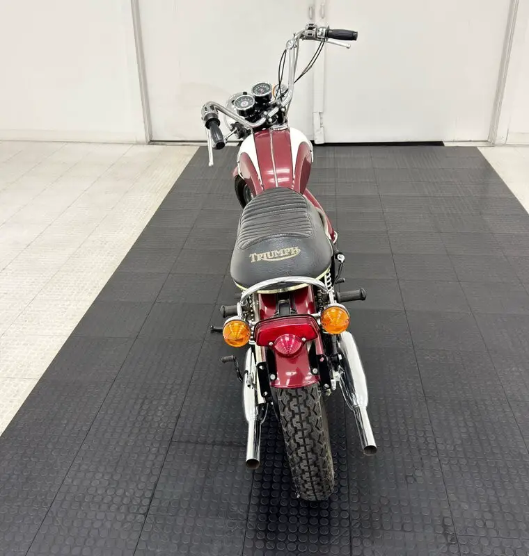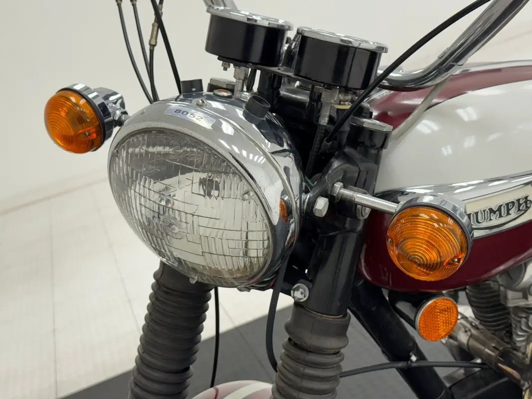Painted components here are Cherry Red accented by white stripes on the fenders and on the tank, characteristic streaking scallops begin at the Triumph emblem and come to a point at the seat. The single stage paint is in very nice condition as are the tank badges, bordered in chrome. The black vinyl seat has a border as well, this one on the lower edge and this one in gold. Both the headlight and tail light are flanked with marker lights and also reflectors mounted to the side of the bike. Chrome wire wheels, 19-inch front and 18-inch rear, are accompanied by other chrome goodies including the dual exhaust, rear shock coils, upright handlebars, and of course, the headlight housing.