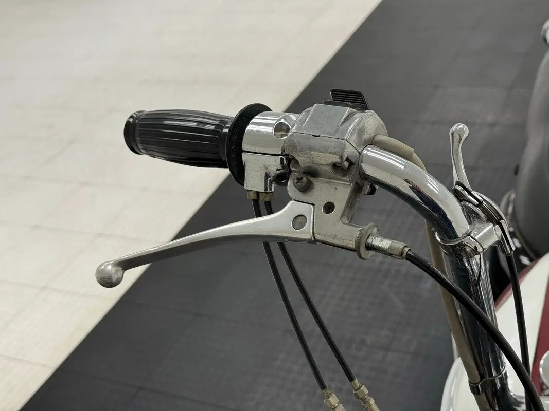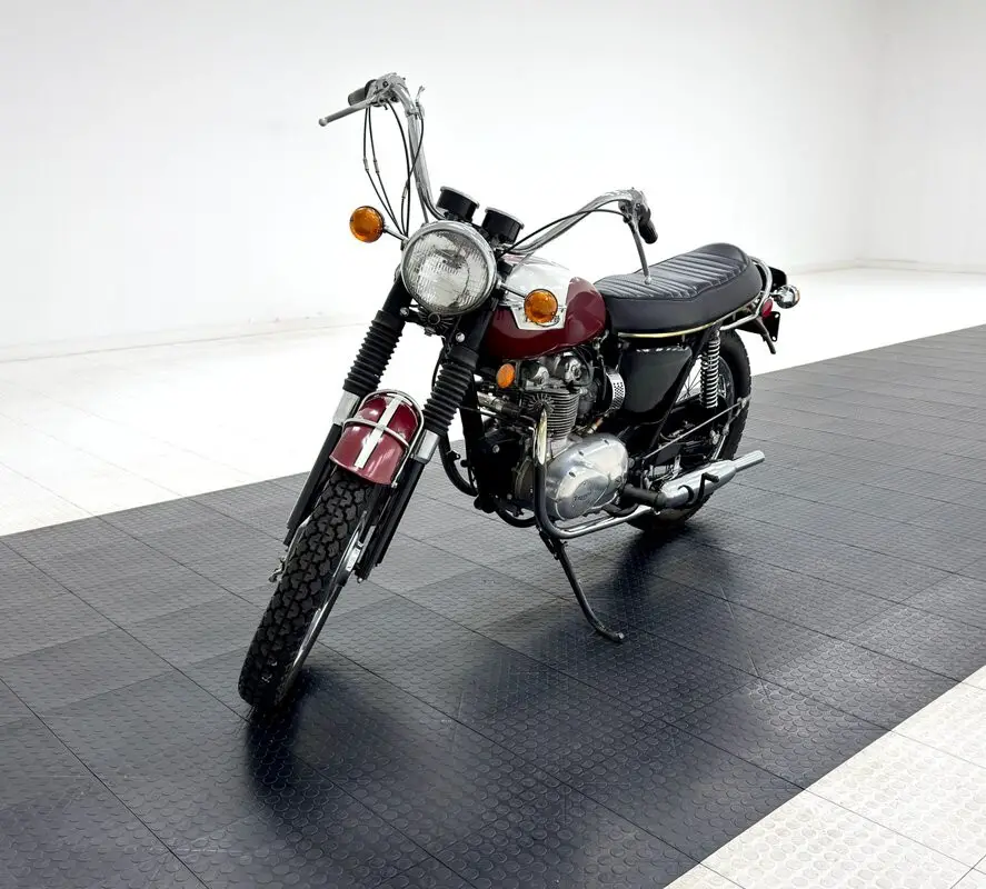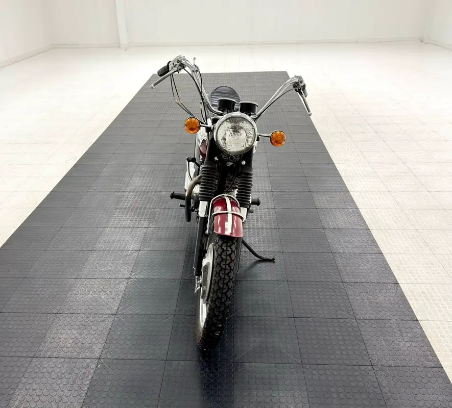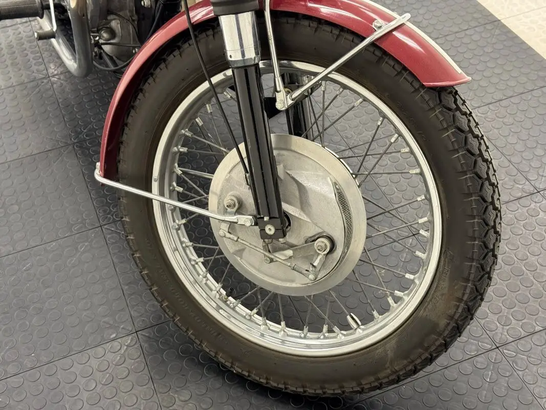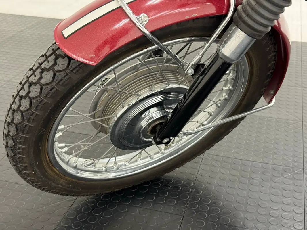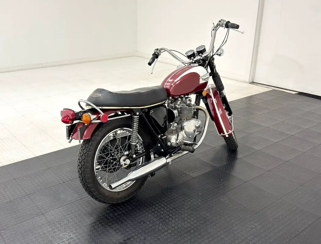 Painted components here are Cherry Red accented by white stripes on the fenders and on the tank, characteristic streaking scallops begin at the Triumph emblem and come to a point at the seat. The single stage paint is in very nice condition as are the tank badges, bordered in chrome. The black vinyl seat has a border as well, this one on the lower edge and this one in gold. Both the headlight and tail light are flanked with marker lights and also reflectors mounted to the side of the bike. Chrome wire wheels, 19-inch front and 18-inch rear, are accompanied by other chrome goodies including the dual exhaust, rear shock coils, upright handlebars, and of course, the headlight housing.