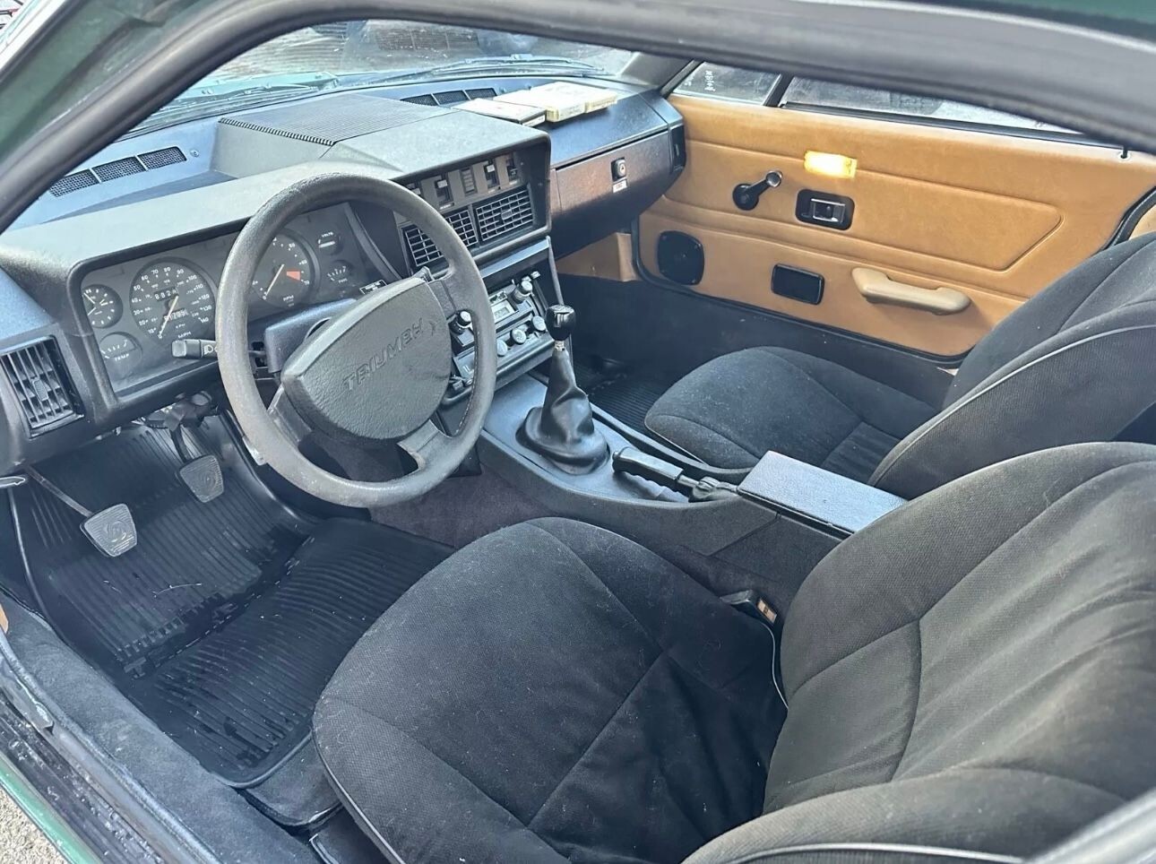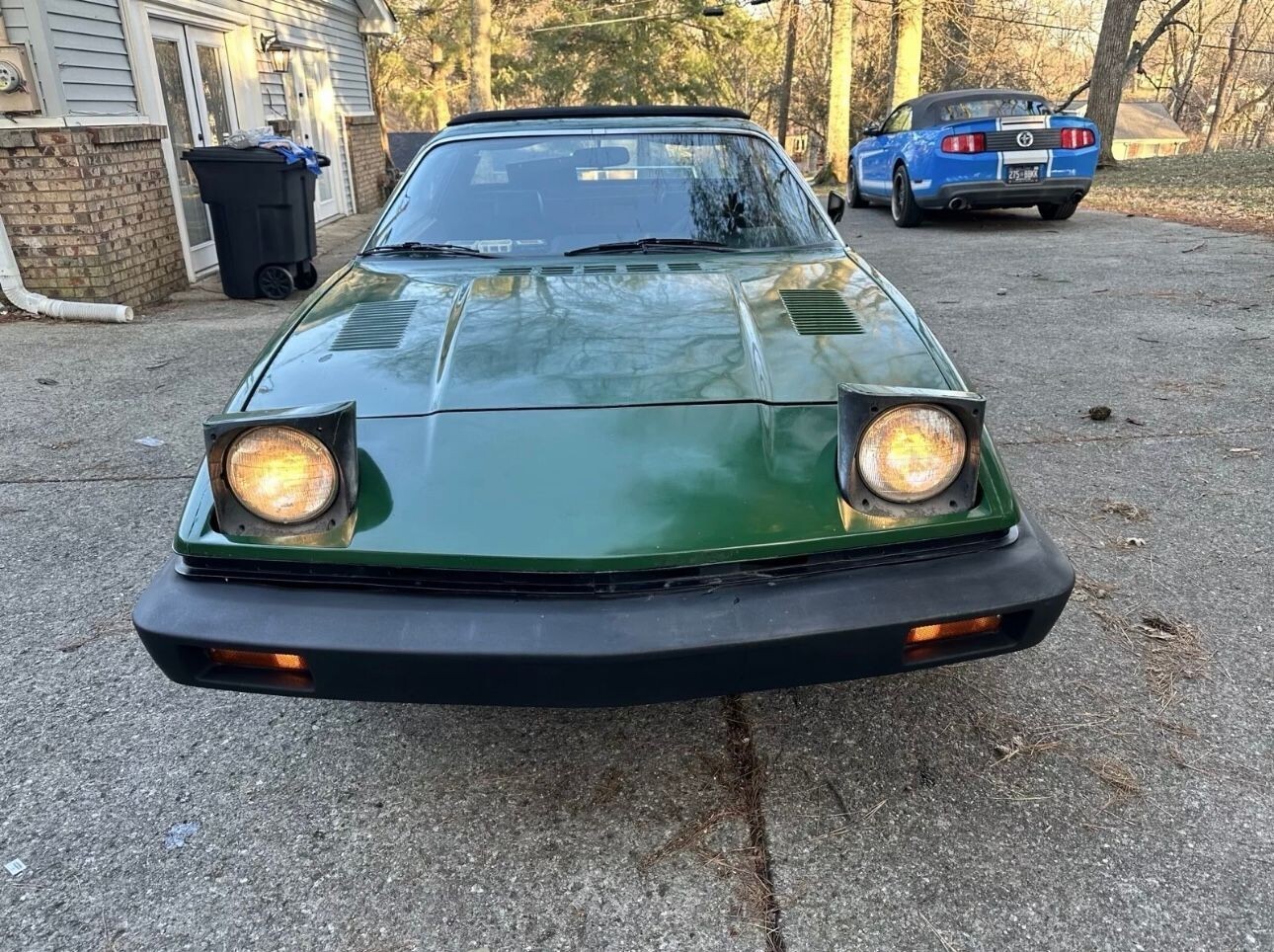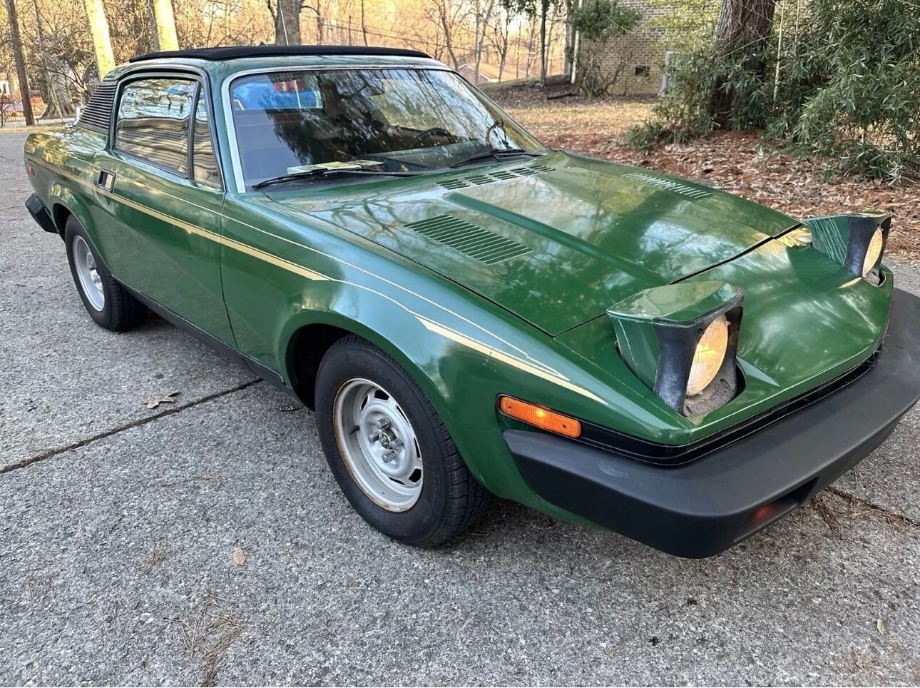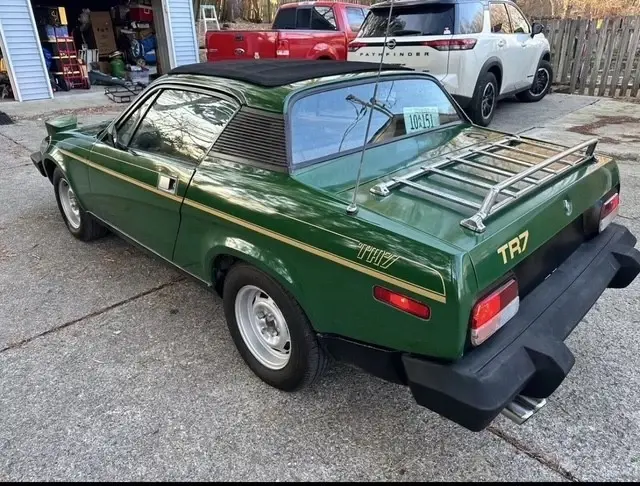 For sale: Third-owner ‘77 Triumph TR7, British Racing Green with gold stripes—original paint, scratches from fifty years of charm, not abuse. Sat in a private collection for two decades, so it’s barely broken in at sixty-one thousand. Four-cylinder runs well with fresh tune up parts and new hoses but balancing the dual Strombergs,is beyond me. four-speed shifts well, rare canvas Sunroof with no leaks, A/C works just needs a charge to get really cold, factory eight-track works great. Solid car, original 1977 factory manual and original hubcaps included. NO SECURE PAYMENT,