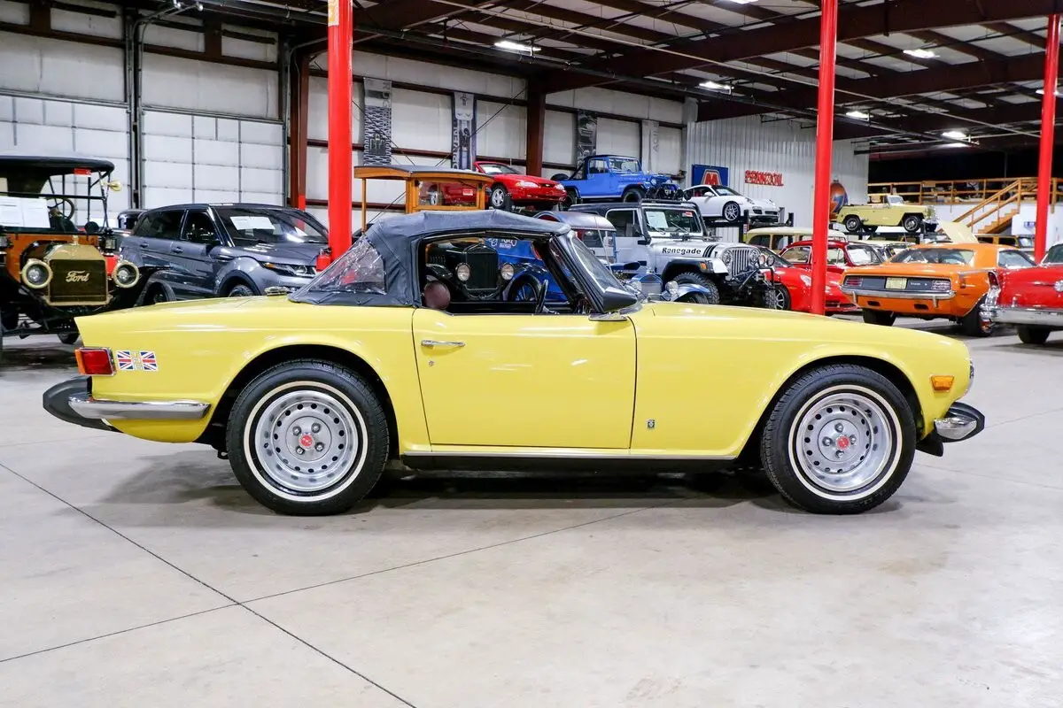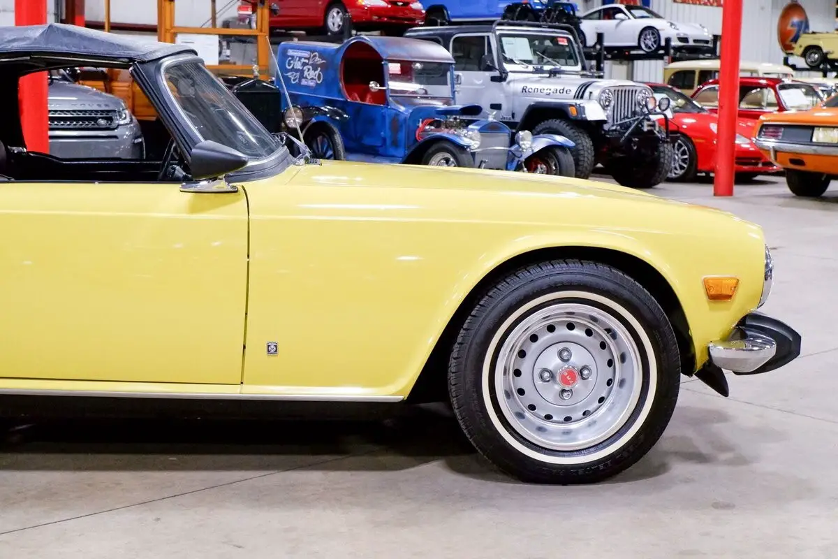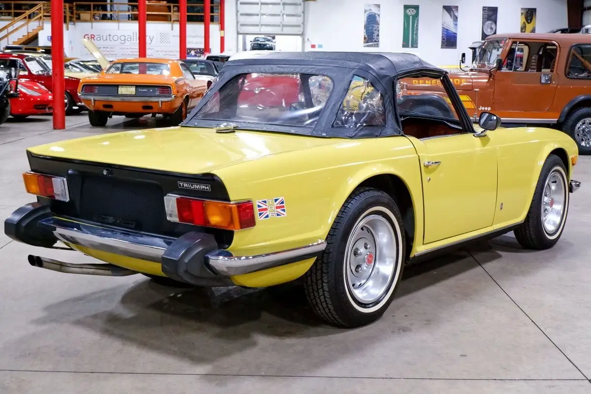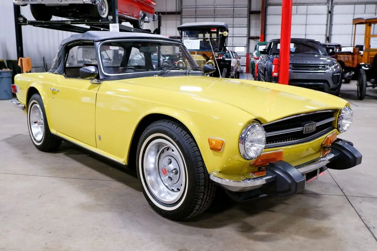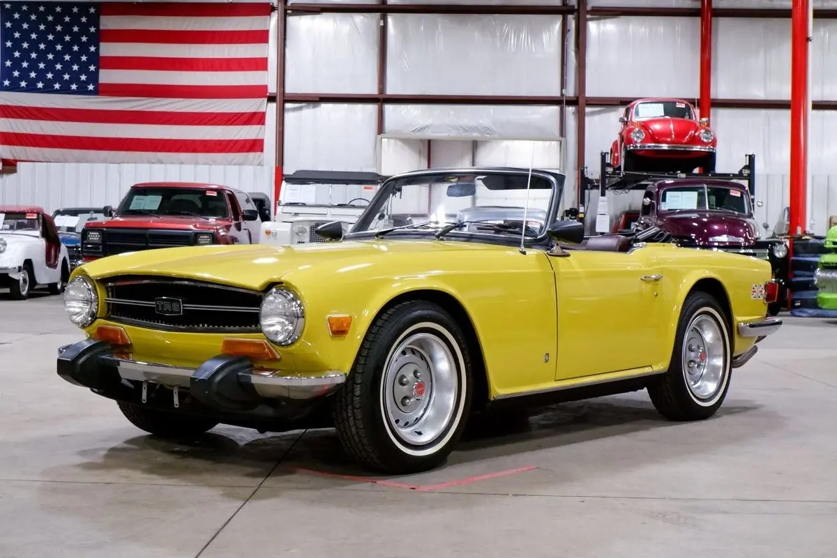 GR Auto Gallery is pleased to present this exceptional 1976 Triumph TR6, a stunning example of British motoring heritage. Finished in striking Mimosa Yellow, this immaculate roadster is complemented by a clean interior and a matching convertible top that is in excellent condition and operates flawlessly. Inside, the Dark Cherry leather seats are beautifully preserved, and the wood dash remains in outstanding condition, adding to the car's classic charm.