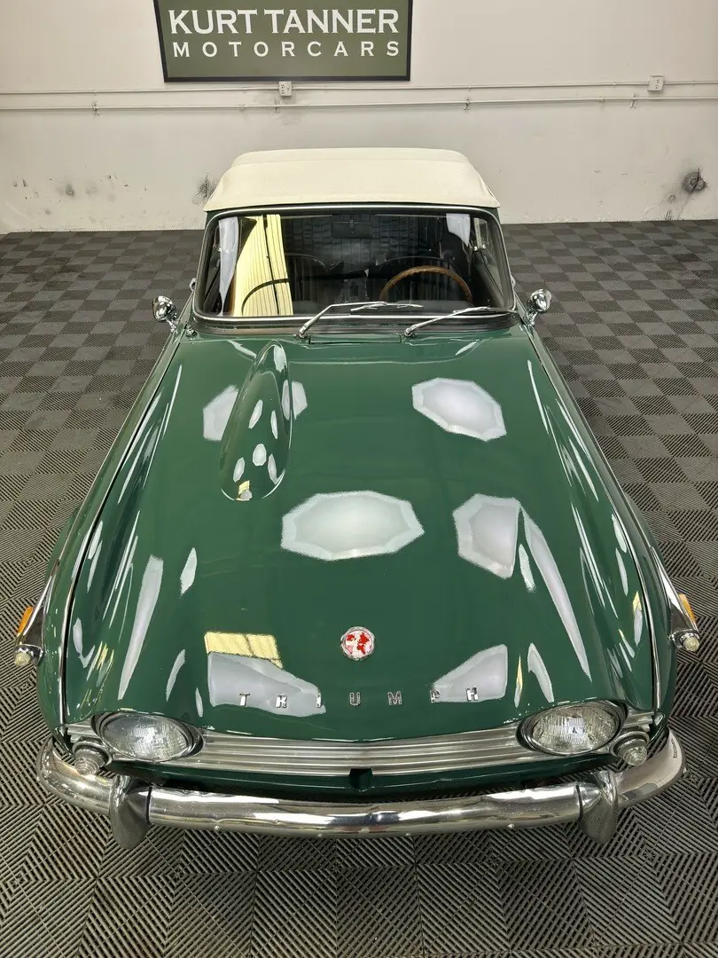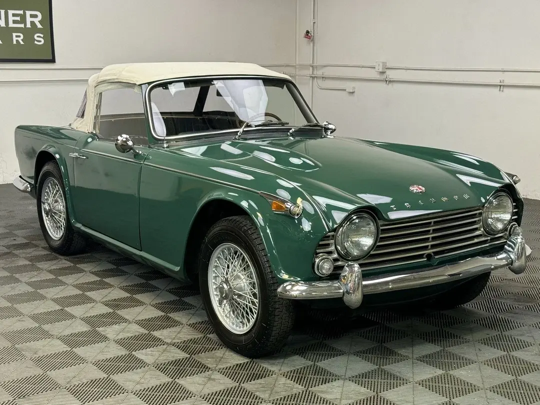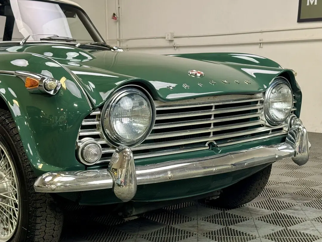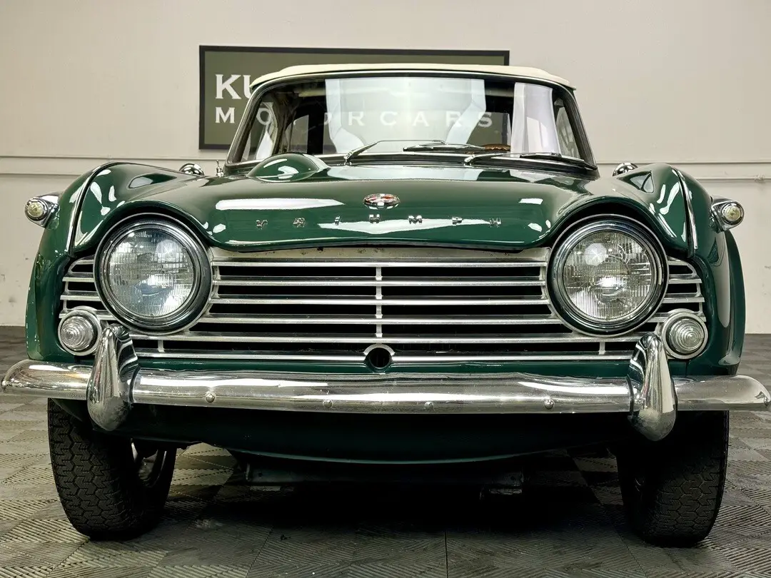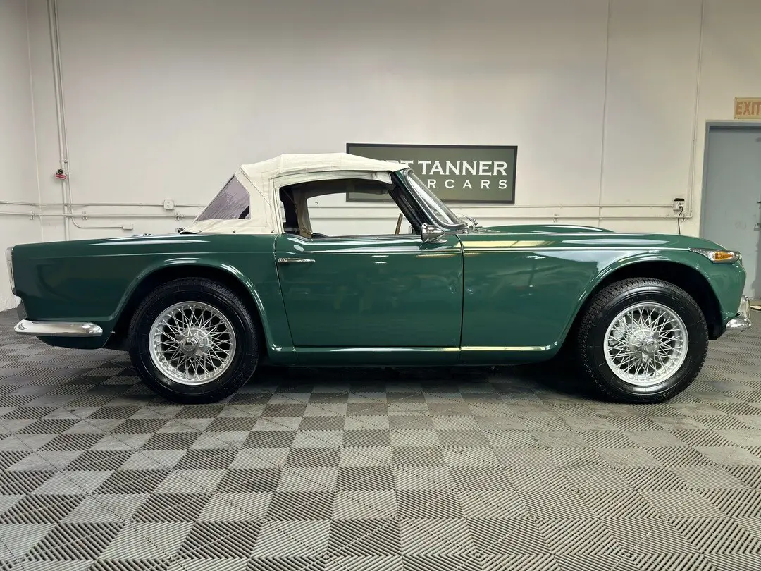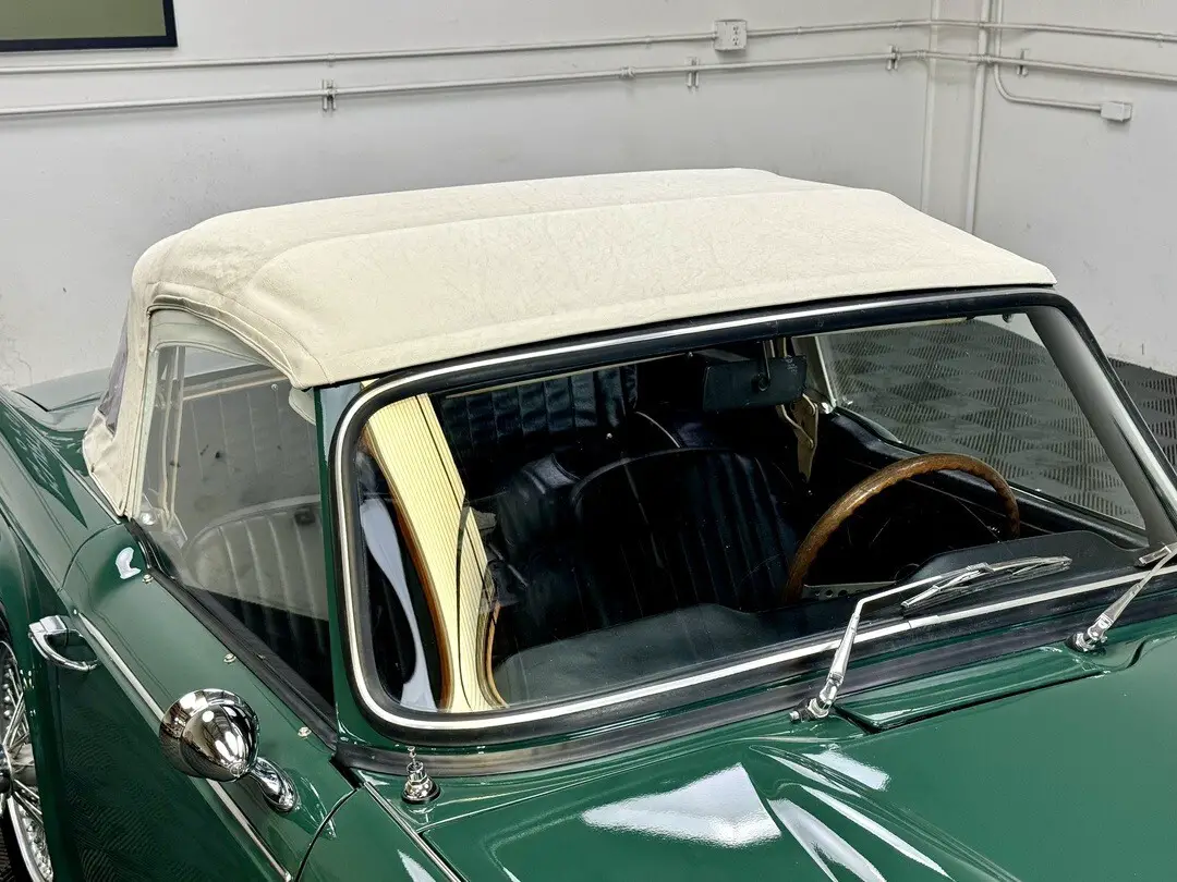 1967 TRIUMPH TR4A IRS CONVERTIBLE. TRIUMPH RACING GREEN WITH BLACK TRIM AND BOOT, CREAM TOP. 4-SPEED, 60-SPOKE WIRE WHEELS. MICHELIN ZX's. PERIOD WOOD/ALLOY STEERING WHEEL. BULLET MIRRORS. LOVELY RESTORED CAR IN PERFECT COLORS. 87,239 MILES.