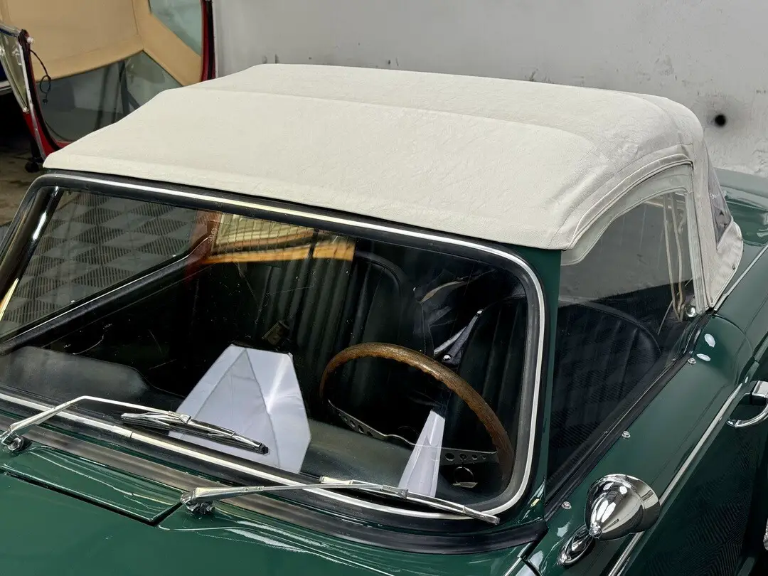 -Newer interior with retrimmed seats, newer carpet kit, original panel kit, excellent dashboard, original top boot, newer cream soft top, dealer optional wood steering wheel.