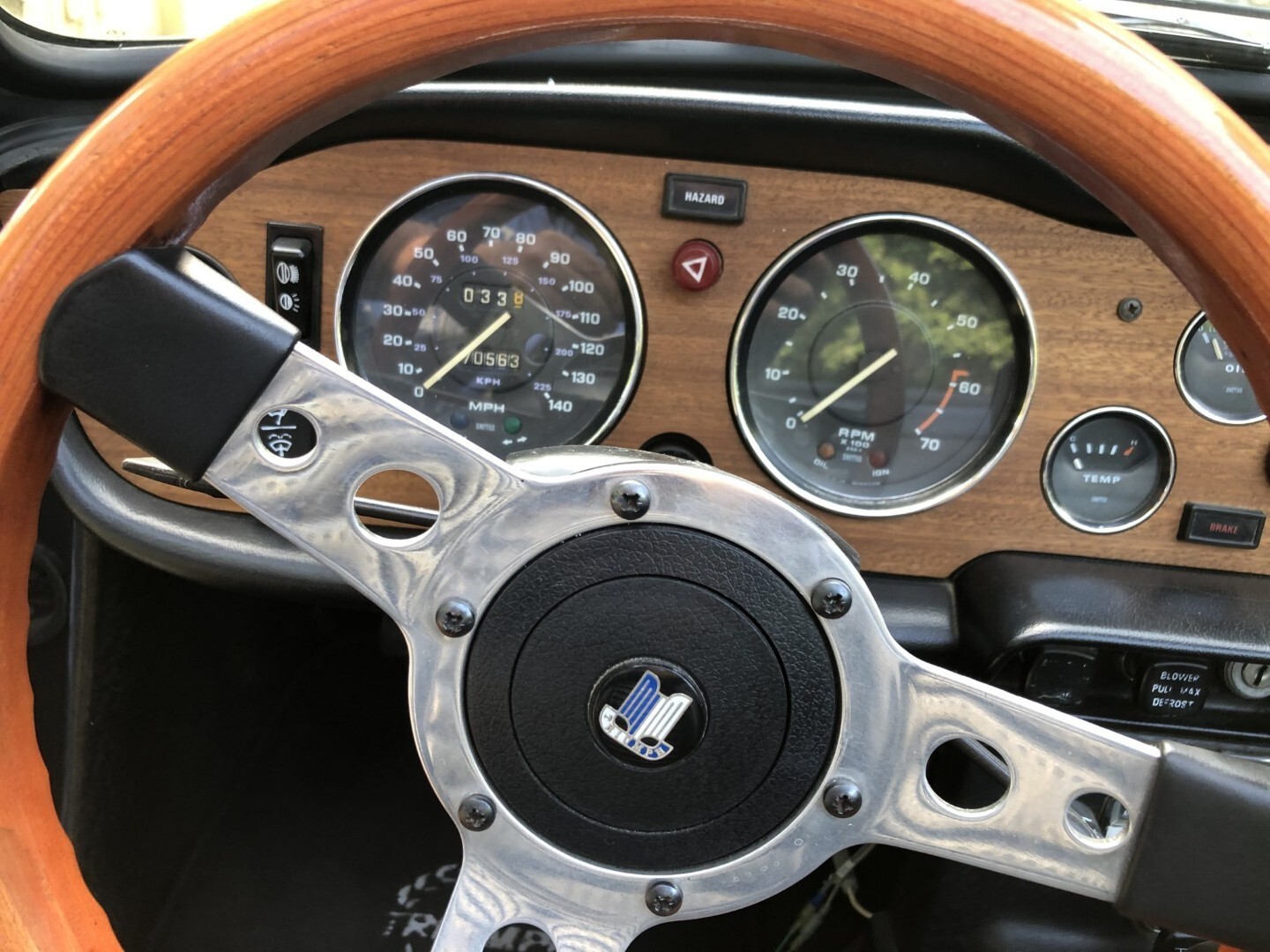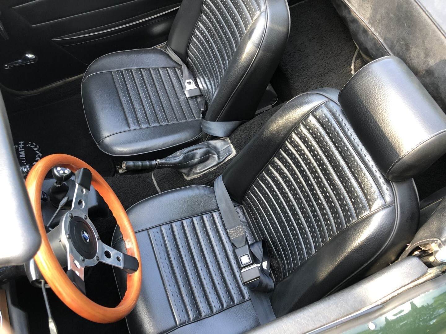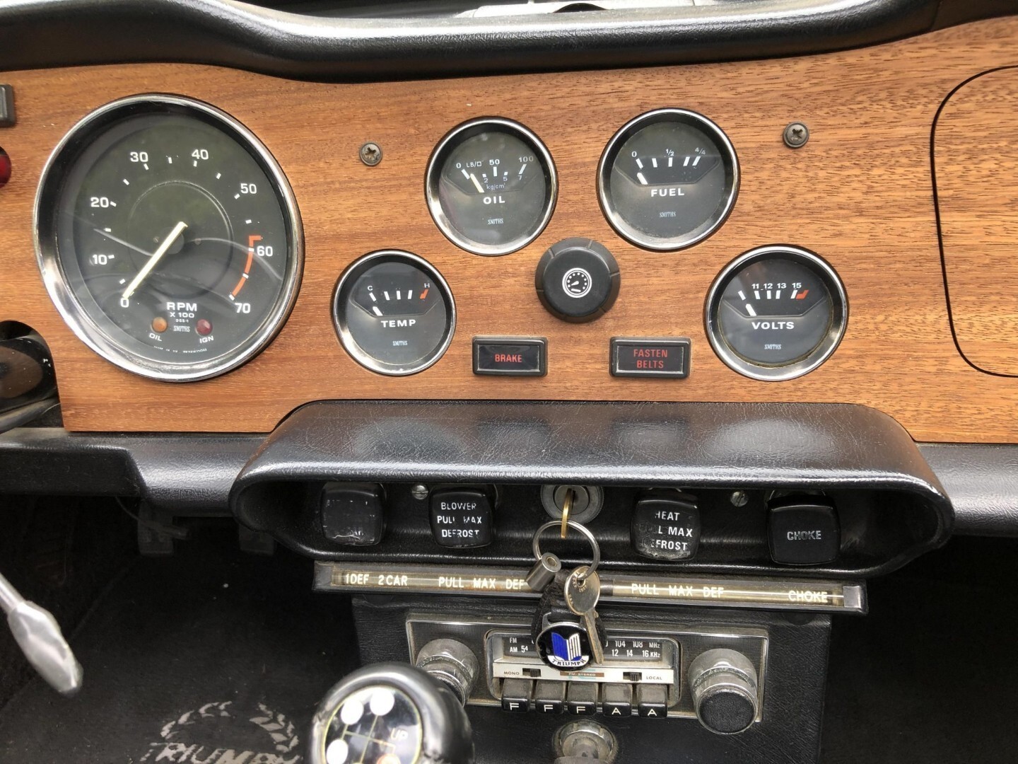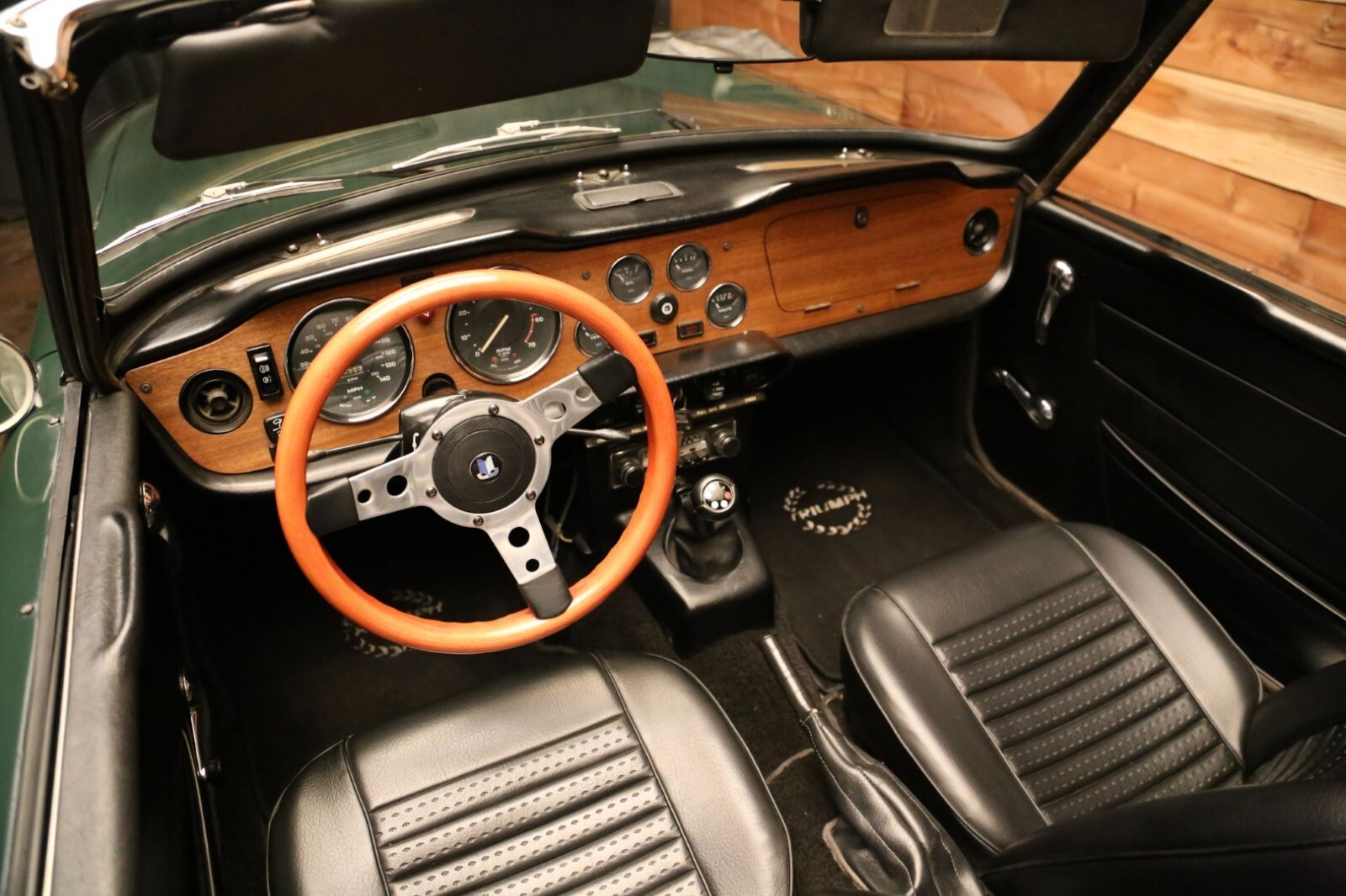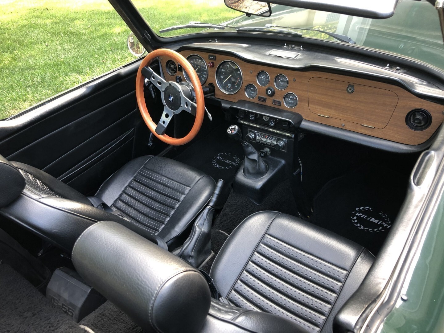 The cabin features seats fitted with replacement foam cushions and reupholstered in black vinyl, with matching upholstery extending to the door panels. The dashboard is accented with replacement wood trim, and amenities include Triumph-logo floor mats, a heater, and an AM/FM stereo. A wood-rimmed steering wheel fronts Smiths instrumentation including a 140-mph speedometer, a 7k-rpm tachometer, and gauges for coolant temperature, oil pressure, fuel level, and voltage. The five-digit odometer shows under 71k miles, approximately 6k of which were added during previous ownership.