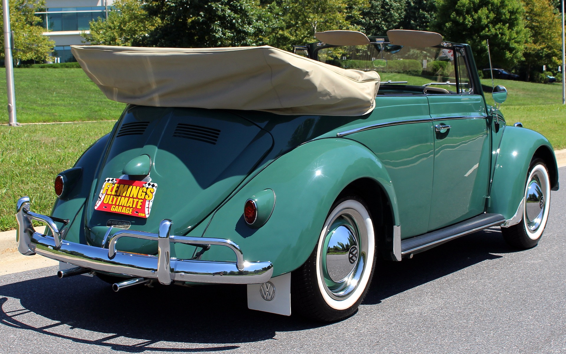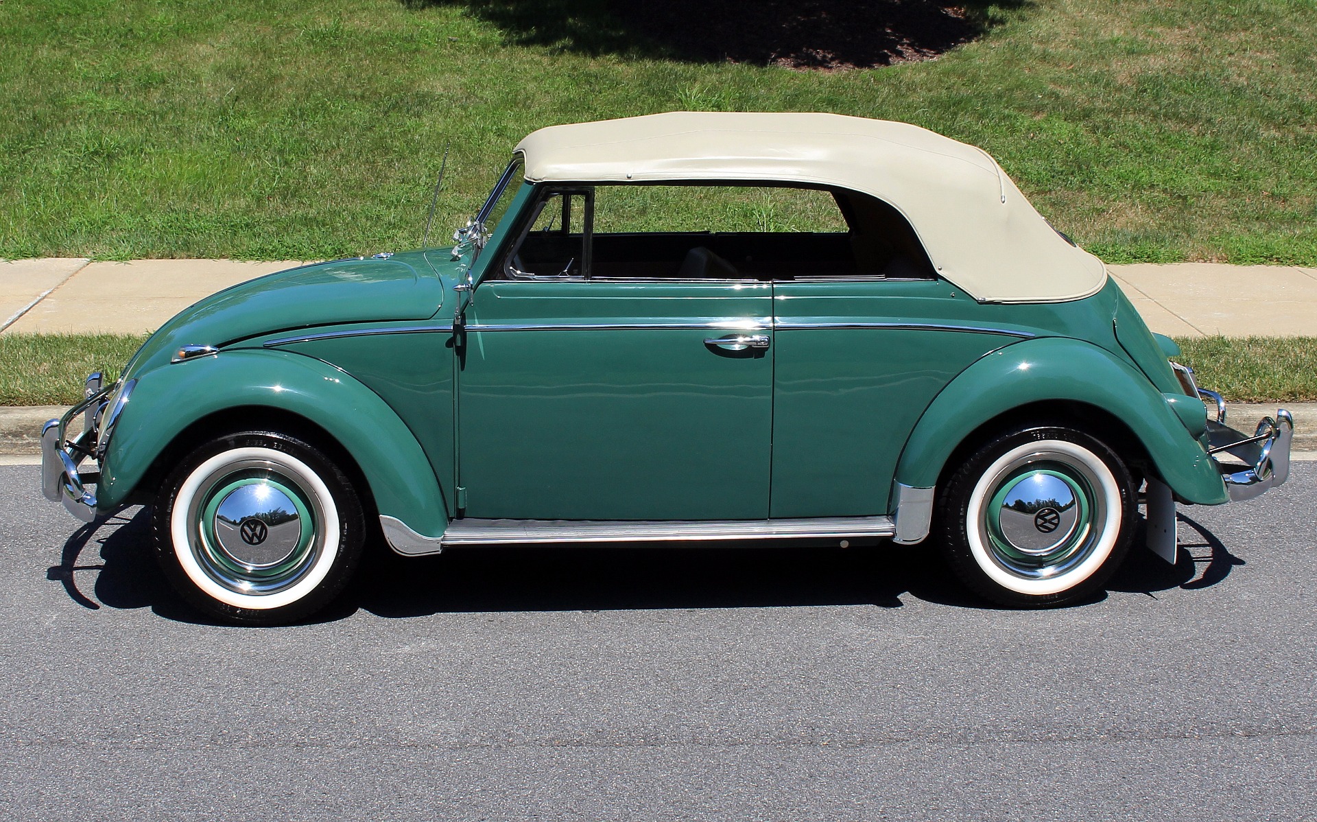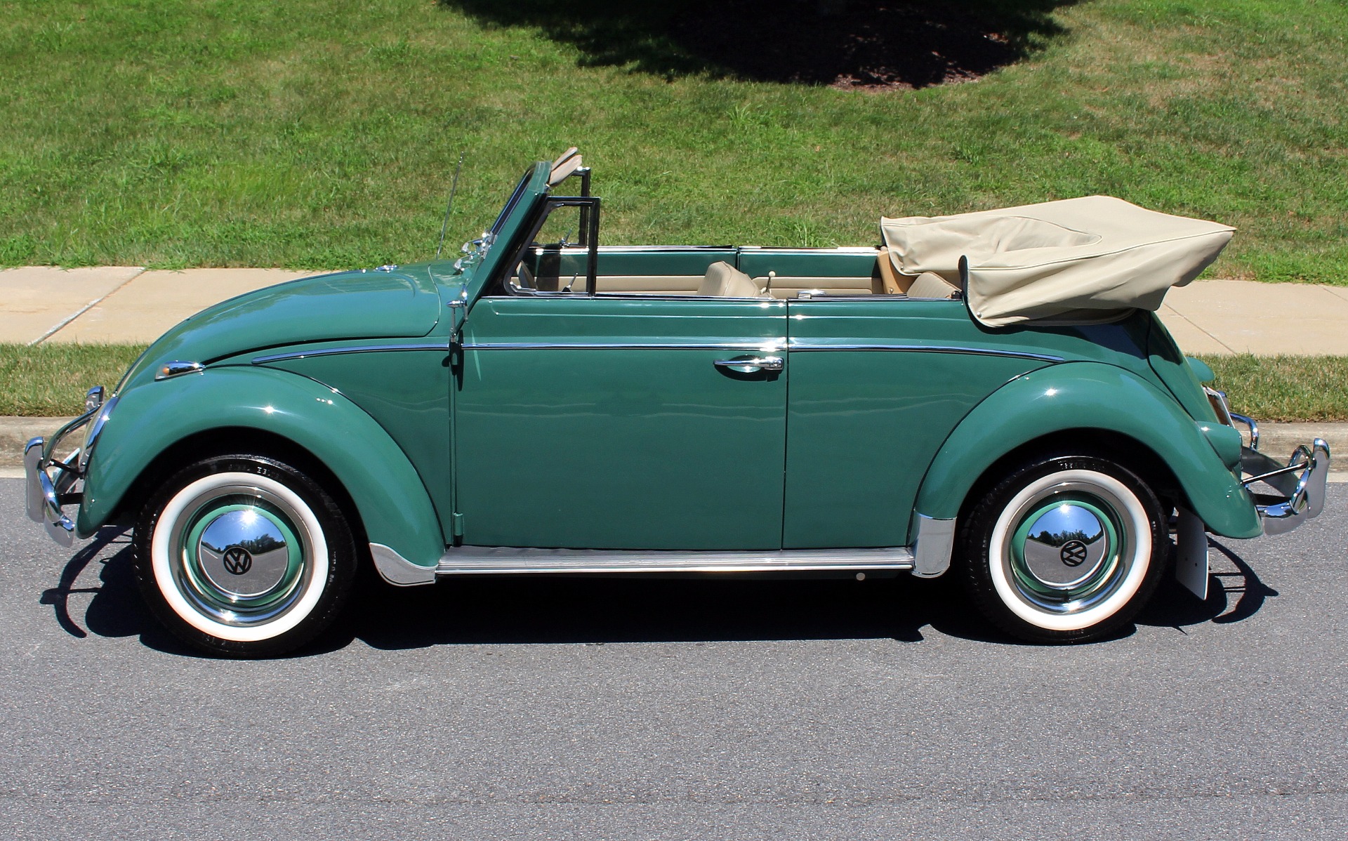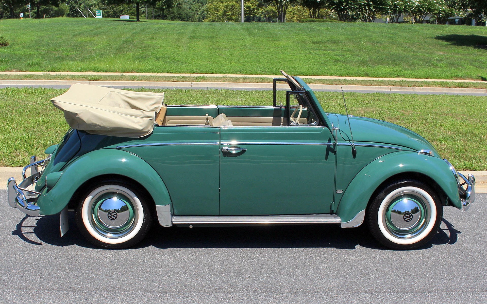 60 V.W BEETLE CABRIOLET Beautiful, No-Expense-Spared($60K reportedly spent), Rotisserie restoration of this iconic beach cruiser (Look underneath this car!!)) Rebuilt original famous VW 1200cc virtually Indestructible aluminum 4 cylinder, Freshly rebuilt 4 speed synchromesh trans, 4 wheel fully independent suspension, Mirror finish Ceramic Green paint, professionally show waxed and detailed, New Stone Beige convertible top w/matching boot, All new Stone Beige bucket seat interior and correct matching square weave carpeting, Restored dash with original 80 MPH Speedo, Original Becker AM/FM radio, All new Chrome & Stainless trim, Period correct Volkswagen Moon disc wheels with Wide White-line tires, Great sounding, factory dual exhaust system, Nice enough to show or just drive this collector quality, fully restored classic bug! Any car that makes you smile like this when you see it needs to be in your life ( just sayin)
