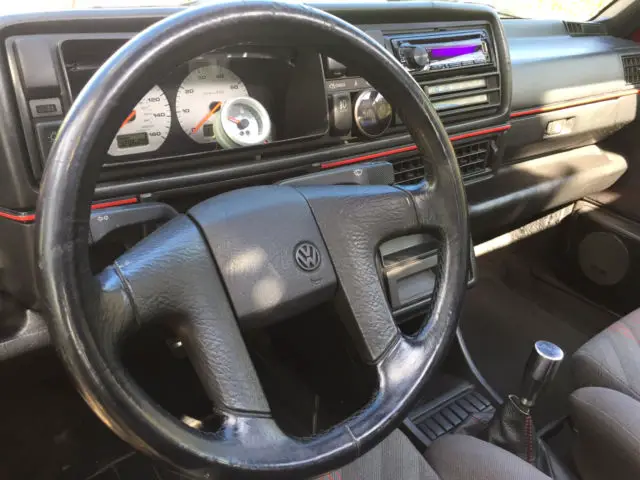 Interior: The inside of this car is very complete and well kept for a 92' though it will need a headliner, however overall its in great shape including the seats and almost all the little interior bits and pieces are intact which is very rare for an MK2(speaker grills,Buttons,trim, Door panel,handles ect..99% of the stuff is there and in great shape). Most importantly, It has a clean smoke free cabin, WORKING SUNROOF, working Mk3 Dash Cluster showing 129K (exempt) w/Engine light on which should be expected due to all the performance upgrades, Nice complete dash with a few expected cracks but looks great! Upgrades include Kenwood CD w/ipod connect and New Kenwood 6x9, Corrado steering wheel, Cluster mounted boost gauge, Innovate Motorsport Air Fuel gauge (digital), New GTI red stick shift boot cover in leather, and stainless shift knob. I would rate this interior way above average!