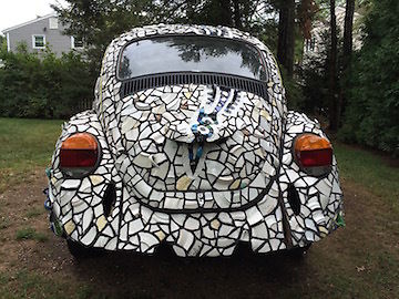 Artist created VW Bug mosaic. Project took 6 months to complete. Can be used in front of gallery or large lawn ornament.