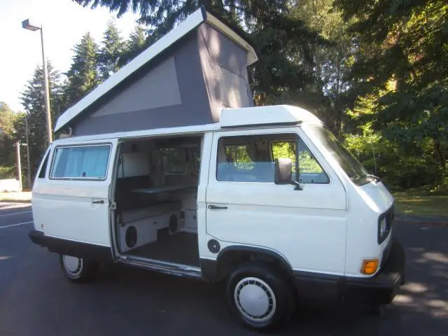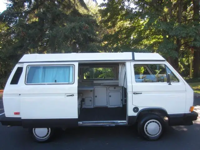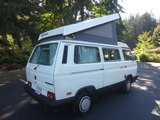 VW CAMPER VANS ARE SHOWN BY APPOINTMENT ONLY. PLEASE EMAIL OR CALL 425-453-8005 TO MAKE AN APPOINTMENT. We are almost done with this nice 1988 Westfalia camper van and you can reserve it now with a $500 deposit. Our reconditioning included the following: -Full mechanical inspection and service (New ball joints, new cv axles, new tie rod ends, oil change, tune-up, etc.) -New exhaust from Go Westy -New fuel lines, fuel tank reseal and rebuilt fuel injectors -New stainless steel coolant lines -New radiator -New 3 window poptop tent -New Sewfine front carpet kit -Go Westy style body texture coating -Complete 2 stage paint with clear coat -Go Westy All Weather Mats -Camper console with 4 cupholders! -and More! This Westy runs great and shifts smoothly. It is ready for your local camping trips or cross country adventures. Clean title and Carfax. WE FINANCE VW CAMPER VANS! Apply online or over the phone to be approved quickly. We welcome your trades. A fully reconditioned Westy at this price will sell quickly! Call today to reserve this camper! VW CAMPER VANS ARE SHOWN BY APPOINTMENT ONLY. PLEASE EMAIL OR CALL 425-453-8005 TO MAKE AN APPOINTMENT. -- INSTALLED FEATURES: Power brakes, Power steering, Paint: metallic, Clock, Gauge: tachometer, Side mirror adjustments: power, Front seat type: bucket, Third seat, Upholstery: cloth, Power door locks, Tire type, Wheel diameter: 14 inch, Wheels: alloy, Front wipers: intermittent, Rear wiper, Tinted glass, Window defogger: rear
