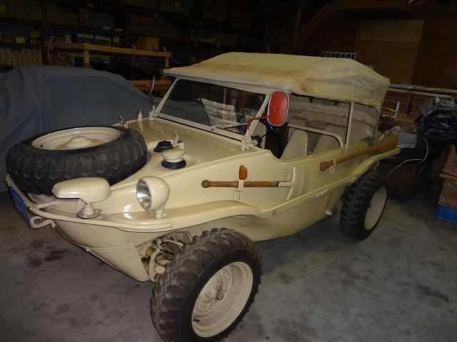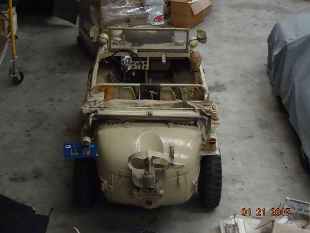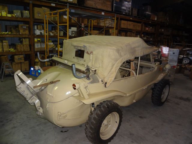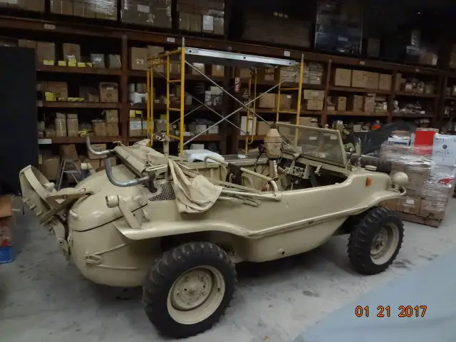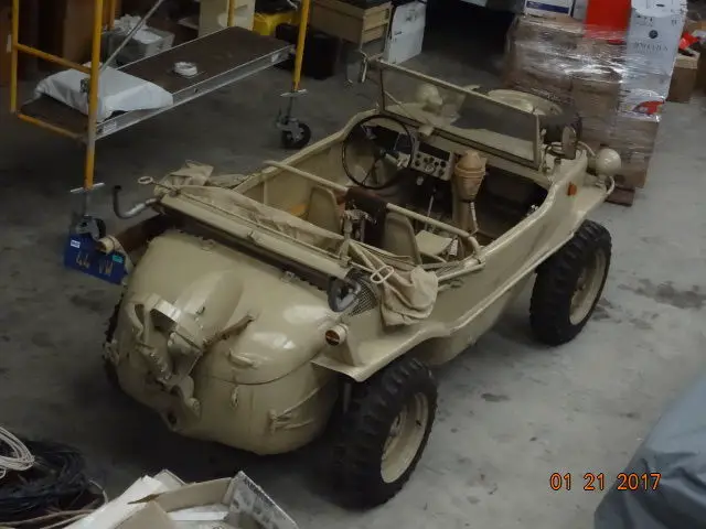 1944 Volkswagen Schwimmwagen type 166 for sale by owner. Less than 100 miles since restoration. Needs freshening up. Ran great when I parked it in the warehouse a year ago. Needs fluids changed and a 6 volt battery to run. Comes with some spare parts and trim including a spare transmission and propeller out drive. Photos and documents of restoration done in Germany.CA license plate 44 VW Registration status - non - op. No delinquent DMV fees due.