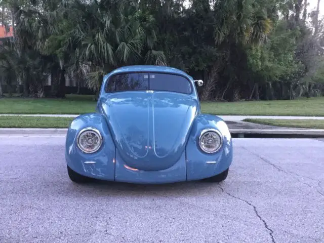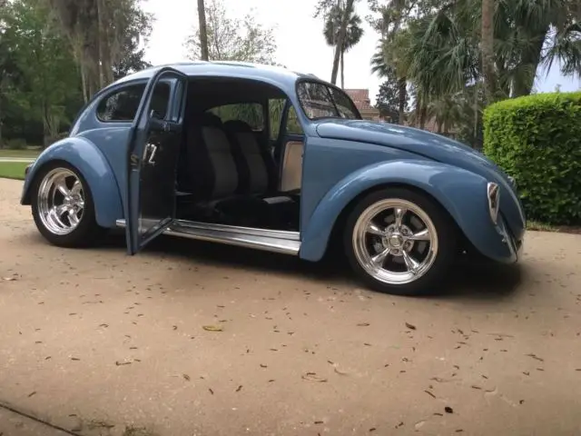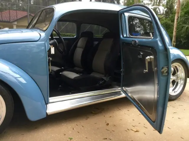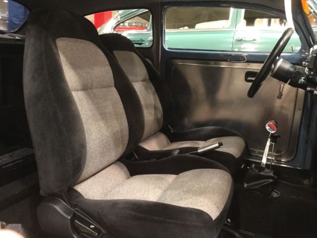 Talk about HOT! How about this 1974 BUG? The epitome of cool is this 1974 slammed and chopped VW with tinted glass, suicide doors, yep suicide doors along with a dropped suspension wide tires and a hot stance. It has a beautiful Gulf Blue paint finish with just enough accents to make a real head-turner. To absolutely blow you away is the extra ordinary sound system powered by 3000 watts using not one-but two big Crunch amplifiers. The sound jumps through two Planet Audio 10's in a ported box with two 6X9 power base and two pioneer 6X9's on top. To make this a stand-out Hot-Bug is the 1600CC air-cooled motor with duel Webber Carburetors mated to smooth running 4-speed manual transmission. Professionally restored and modified no expense was spared. It took 2 VW's, this original one, and a donor VW to use in chopping the top and adding suicide doors. This car has a modified and lowered suspension that handles the wider five lug wheels with Creative Car Craft fenders and mini tub wheel wells. The front brakes are Karman Ghia discs/rotors. A modified interior includes a custom steering column, custom shifter. Ultra-Lite Tach and Speedo Gauges that are illuminated in blue. Stainless interior door panels, matching blue dash with gray and black cloth seats an carpeted floor.