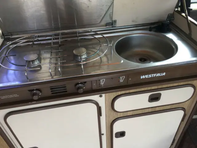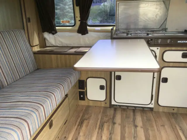 It is equipped with all the standard Westfalia gea, stov, fridg, upper and lower beds . canvas is in good shape .Front seats swivel around . The upper bunk could use a little airing out and a cleaning . I don't think the top has been up in many years . It does have new tires .