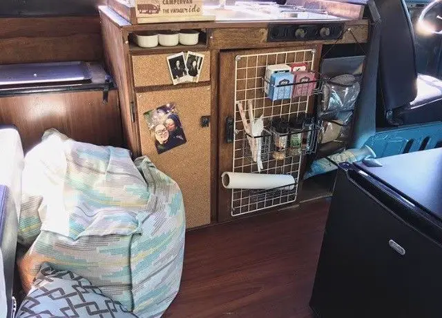 Interior has an aftermarket frig we purchased at walmart.