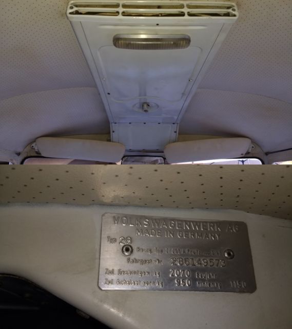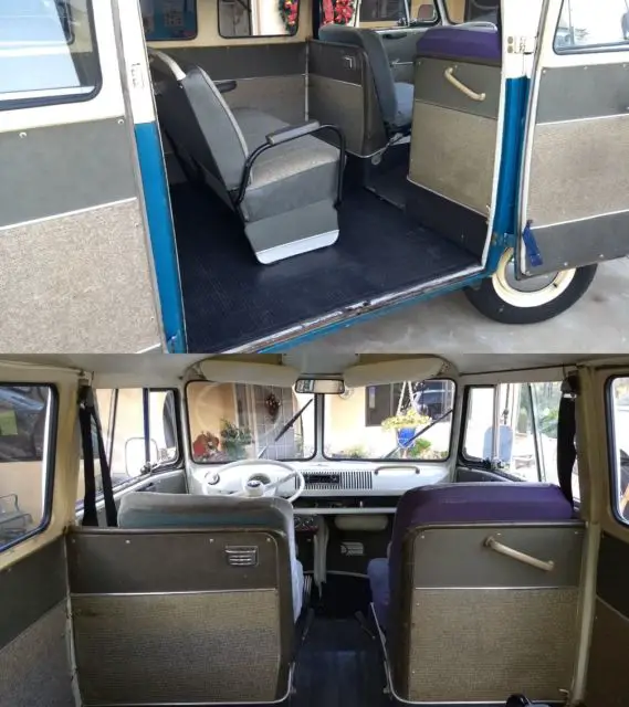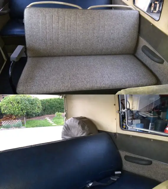 Upholstery is in fair to good shape but is not original and does not match, except for the 3/4 middle bench seat which is completely original. Headliner is original and only has a few minor cuts and aging discoloration. Visors are original and in good shape. Interior middle side door handles are not original VW. Spare tire cover is original and in good condition. Rubber floor mats are all original and include the inserts to cover anchors for the middle seat when not being used.