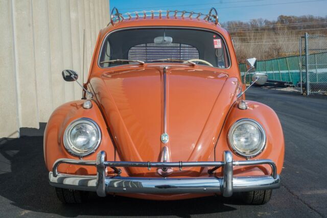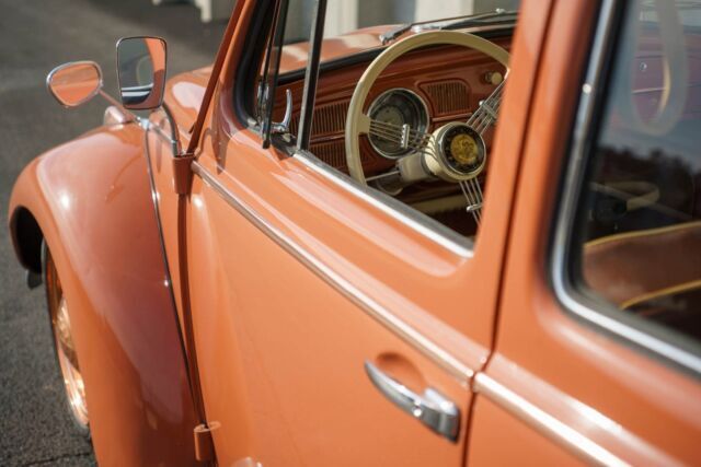 The previous owner bought the car in January 2021. Subsequent work included, installing a four-inch narrower front beam, 15-inch copper-plated steel wheels, Hella headlights, a banjo-style steering wheel, a body-color, window-mounted Thermador car cooler, fender-mounted swan-neck mirrors, rear window louvers and a Vintage Speed pine-and-metal roof rack. There're also chrome bumpers with overriders and a flagpole holder. The engine bay is extremely tidy while the front trunk or frunk is in good order and comes with a spare whitewall tire, wheel and factory VW hubcap.