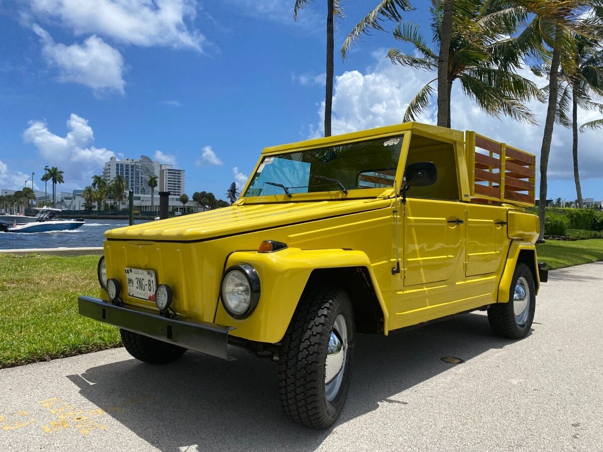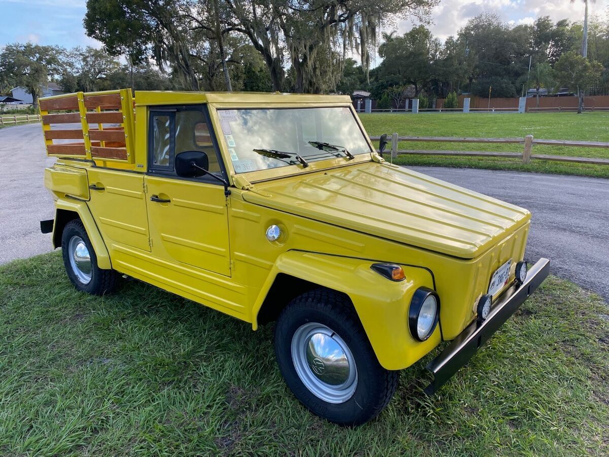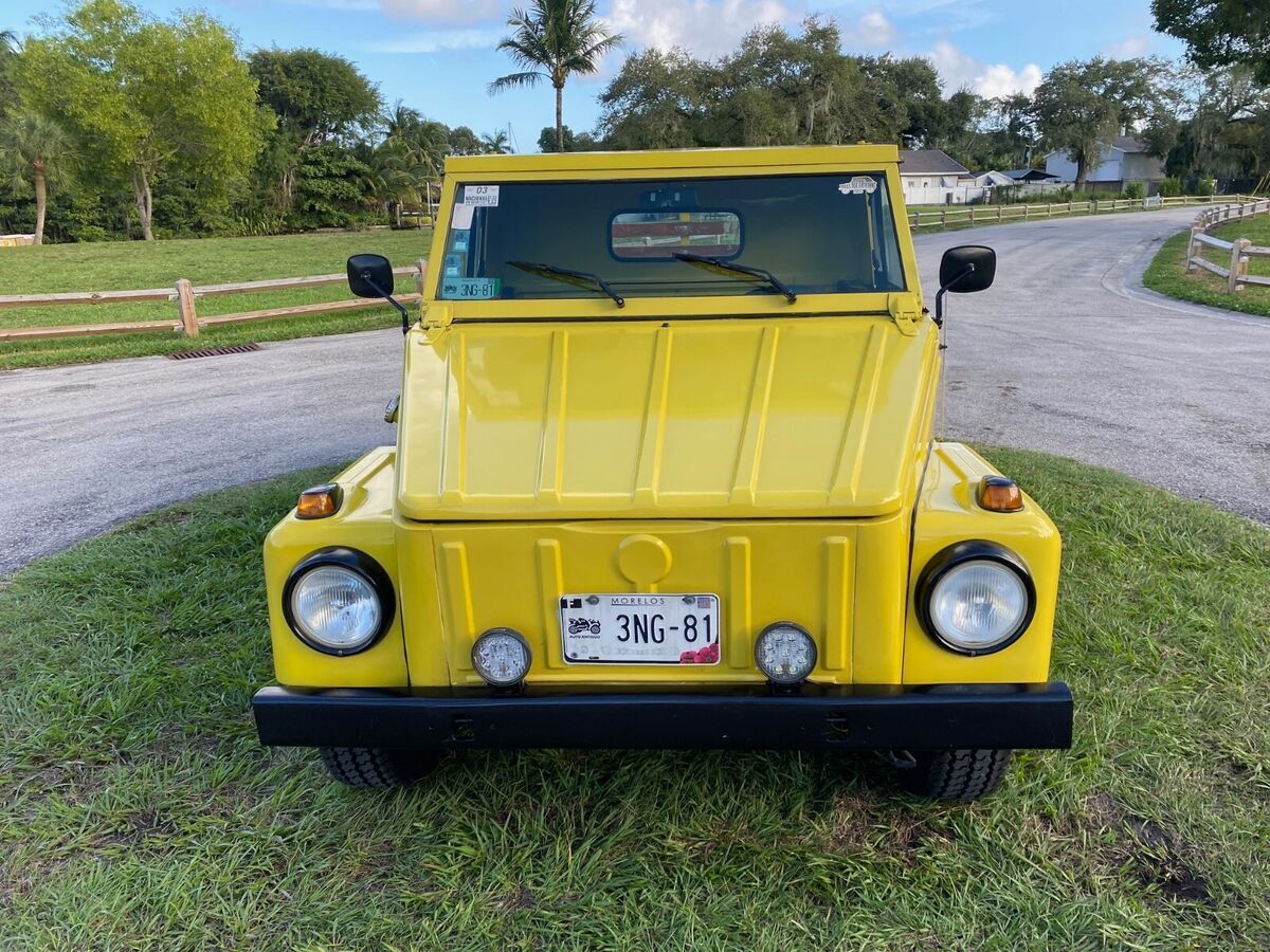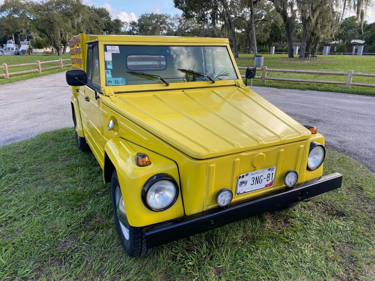 This 1976 Volkswagen Type 181 is a Mexican-market pickup example that is said to have been purchased new by the a state government in Mexico, and it was acquired by me in February 2022 and subsequently imported to the US. Refurbishment work completed under prior ownership included repainting the body in yellow and installing a 1.8-liter flat-four paired with a four-speed manual transaxle. The seats are upholstered in black vinyl, and additional equipment includes black-painted bumpers, 14″ steel wheels, side curtains, three-point seat belts, and steel bed stakes with wood slats. This Type 181 pickup is offered with import documents and a clean Florida title in the seller’s name.