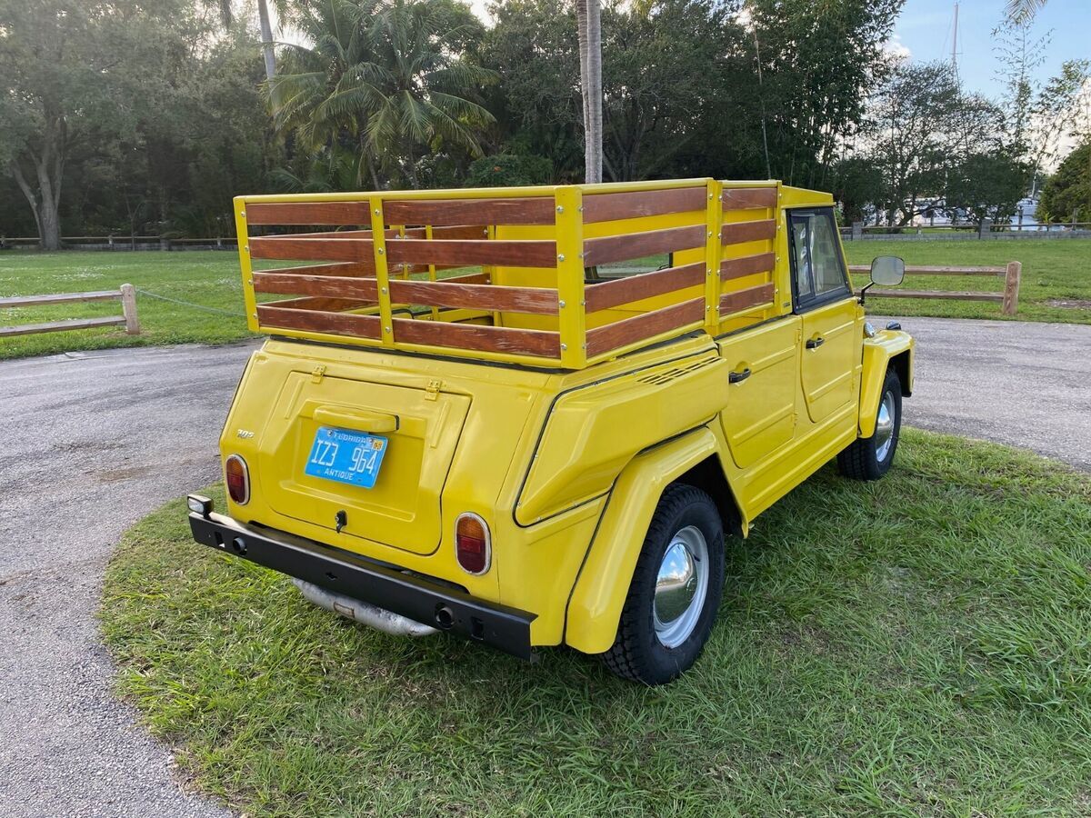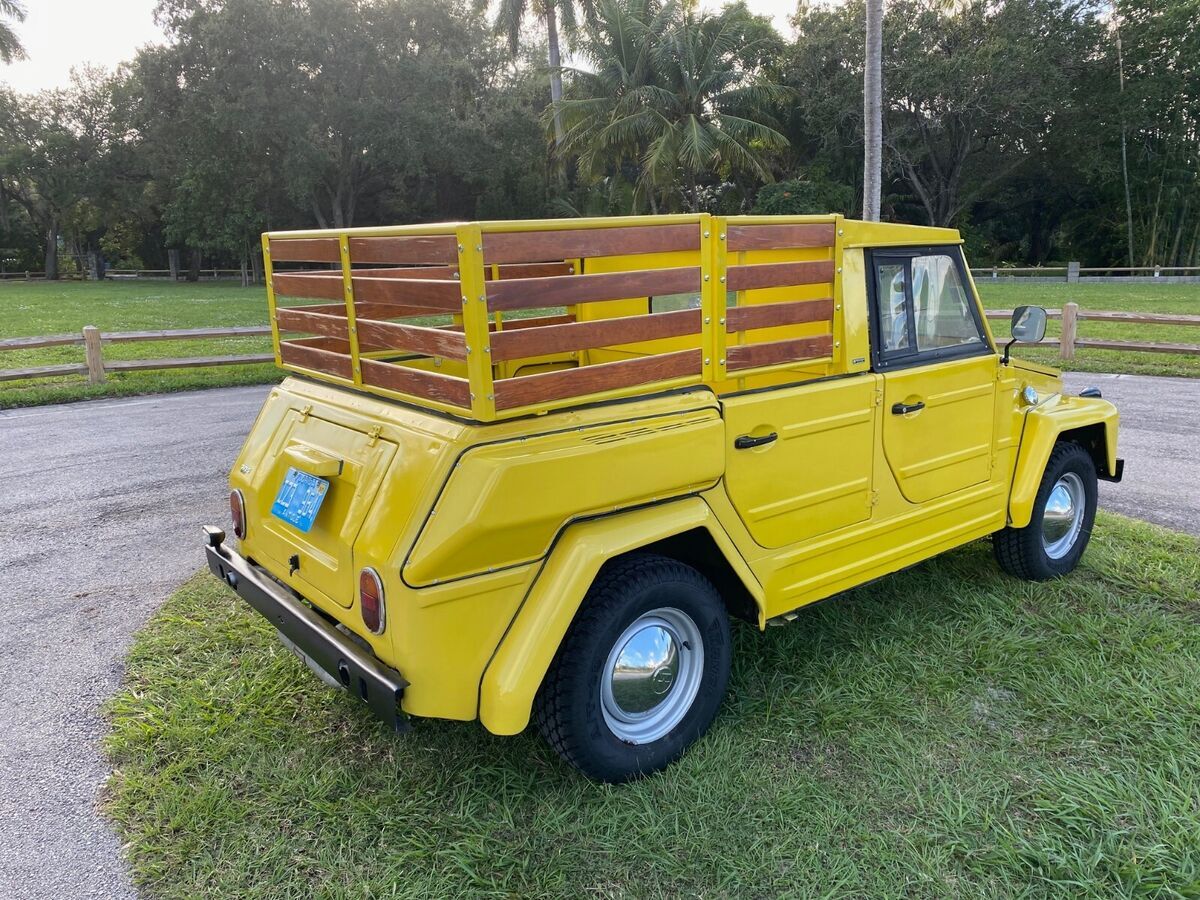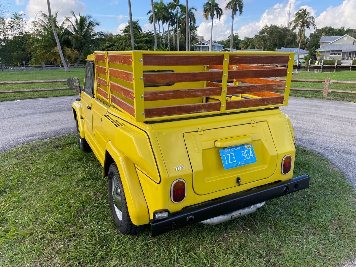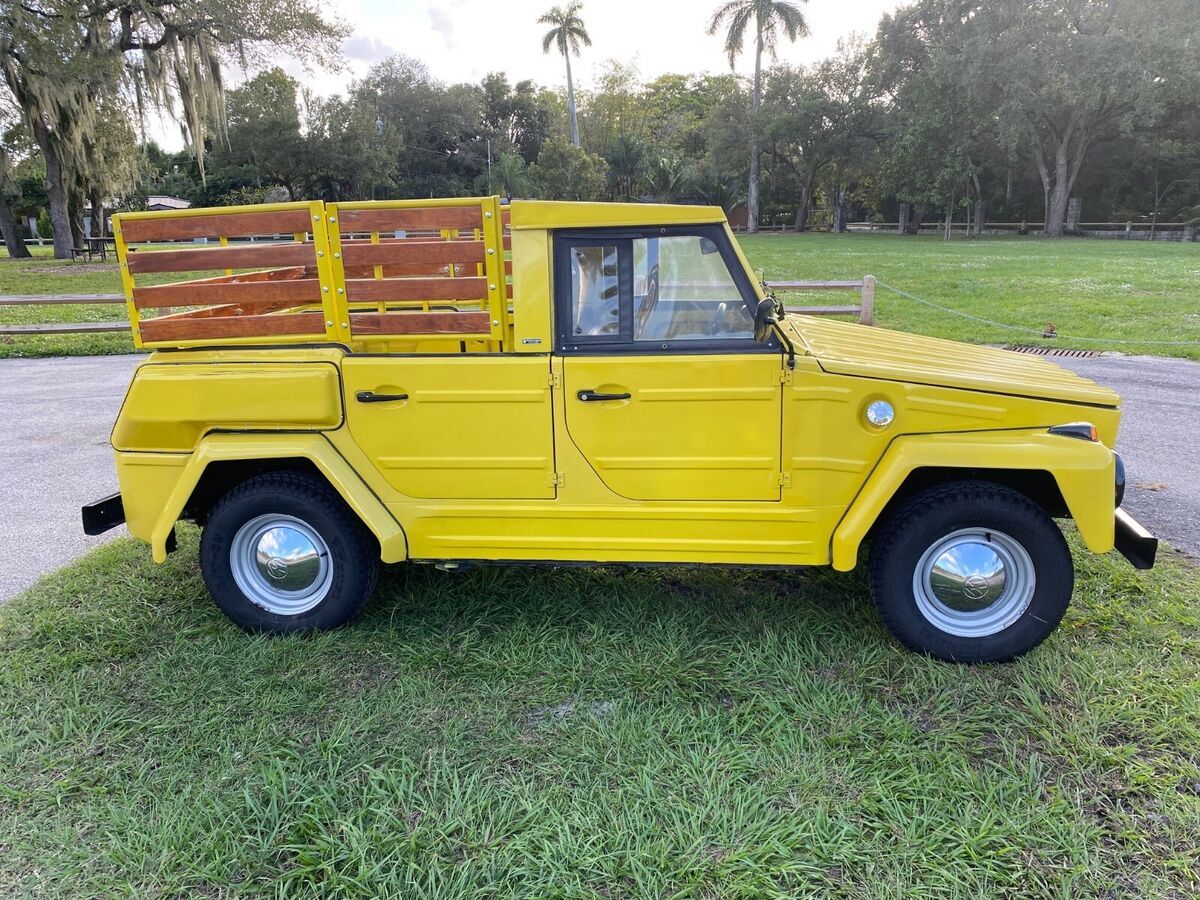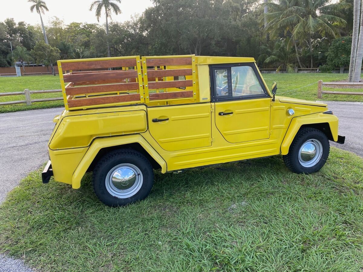 This 1976 Volkswagen Type 181 is a Mexican-market pickup example that is said to have been purchased new by the a state government in Mexico, and it was acquired by me in February 2022 and subsequently imported to the US. Refurbishment work completed under prior ownership included repainting the body in yellow and installing a 1.8-liter flat-four paired with a four-speed manual transaxle. The seats are upholstered in black vinyl, and additional equipment includes black-painted bumpers, 14″ steel wheels, side curtains, three-point seat belts, and steel bed stakes with wood slats. This Type 181 pickup is offered with import documents and a clean Florida title in the seller’s name.