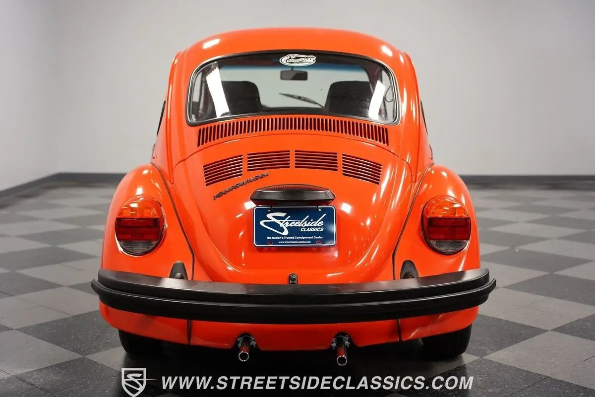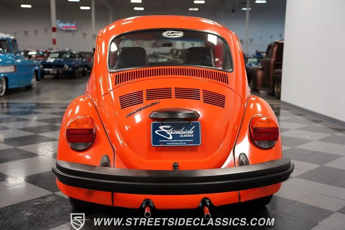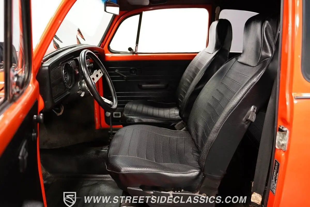 This 1974 Volkswagen Beetle captures your gaze with its vibrant orange hue, evoking images of a sun-kissed Californian coast drive. It embodies a palette of nostalgia and adventure on four wheels, boasting a complete repaint that seamlessly merges classic and contemporary aesthetics. Mounted on 15" wheels enveloped in 165/80R15 tires, the Beetle stands with a modest and bold posture. Adding a brightwork blackout package encompassing the bumpers, trim, handles, and the charming touch of headlight eyelids endows this icon with a distinctive flair. Tinted windows further enhance this ensemble, crafting a visual narrative of mystery and intrigue, a notable departure from its original utilitarian origins.