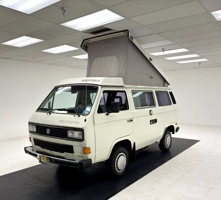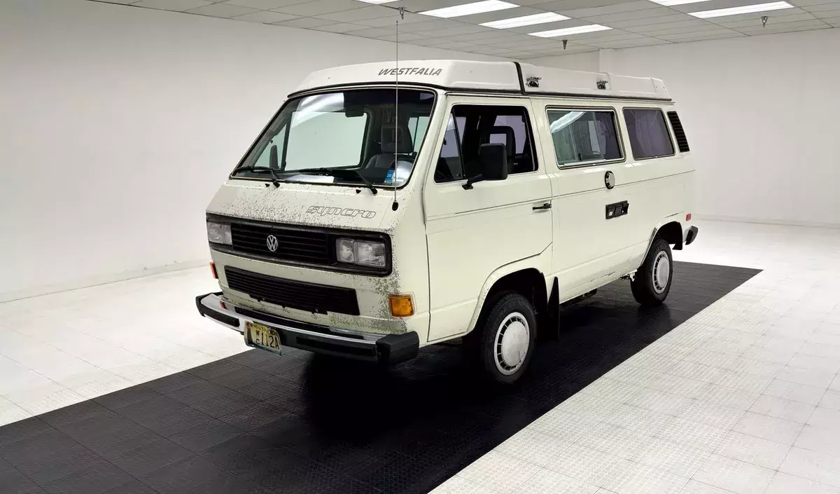 1987 Volkswagen Vanagon GL Syncro Westfalia For consignment, a 1987 Volkswagen GL Syncro Westfalia with a title verified 97,886 actual miles. Purchased from the original owner in 1997, our consignor has put about 13,000 miles on the van with extensive trips through the American Southwest after shipping the van to Utah, as well as jaunts from Colorado to the west coast and back to New Jersey. He states that the engine was refreshed in 1999. Exterior Bathed in single stage Pastel White, and it wears the battle scars of long trips, namely a birdshot pattern of rock chips on the face, and with a billboard flat surface up front, this is not surprising. Beyond that front however, and the paint and body are in very good shape, with an occasional scratch and scuff, and a line of surface rust in a body seam. The cab forward design is unmistakable, and the Syncro sits high on its haunches, poised for some overland treks with all the comforts of home. That includes the roof mounted tent which also provides a pop top roof bed. The sidewalls of the tent are torn but there are aftermarket suppliers with a variety of choices. Vents and hook ups are all in place and intact and the 14inch wheels wear 185R14 tires with a late 2024 date code. Upper panels are populated with windows, tinted in the back and a wide sliding side door allows easy access to the camper section. Interior So much to love here! VW simplicity is found first in the door panels which are based in gray vinyl with a cloth insert and the company's traditional black hardware and all looks clean. The front cloth seats are also patterned in gray with the driver's seat showing some compression and waviness to the side piping, but fully intact with tall, sporty headrests and flip up armrests. For the driver, a simple black steering wheel fronts a no nonsense instrument cluster with speedometer, indicator lights, toggles, and a colorful tachometer showing optimum range and red line. The climate panel and AM/FM/CD radio, (with Aux and USB), blend into the black mid panel under a smooth flat black dash pad. In back, a two seat bench seat in the same gray cloth next to the a swing out table, 2 top burner, sink, refrigerator, and flush door cabinetry. The floor here is rubber and washable and awaits the rug of your choice. In the way back, more cabinets and a flat pad that serves as part of a bed but also provides a storage area and some soundproofing for the rear mounted engine. Interior drapes contribute to the privacy factor. It's all in very good condition, showing a touch of age, but a comfortable little house on wheels. Drivetrain In back, under the floor we find a driver quality 1915cc 4 cylinder engine rated at 95 horsepower and fuel injected. It's mated to a 5-speed manual transmission which sends power to the wheels through 4.09 gears. Power brakes are here as front discs and rear drums. Undercarriage This road warrior has the typical use patina and some surface rust along with chipping paint, but conditions are dry and no invasive rust was found. The single exhaust flows through a stock style muffler and suspension consists of MacPherson strut on front and coil springs on an independent rear set up. Drive-Ability Our consignors drove it to the mall, so we know it runs! And when it was our turn, the van fired right up and we rowed it into gear. Circling the loop, we found a surprisingly eager little engine and the fun experience of sitting very close to the front of the vehicle, and that provides a movie screen view of the road. The van tracks straight, handles well, and stops as it should. Functionally, everything such as lights, horn, and turn signals operate as they should. While Classic Auto Mall represents that these functions were working at the time of our test drive, we cannot guarantee these functions will be working at the time of your purchase. Since Covid, the overlanding phenomenon has exploded. The notion of "staycation" relegated families and individuals to personal trips to parks and backwoods. And while the 4x4 community has embraced it, the Syncro VW Vanagon has been doing it for decades as one of the original small campers that could be driven every day and park in normal sized spots. This well running example has all the amenities for some great staycations, exploring parks and the great outdoors and taking your bedroom and kitchen with you in this now legendary package! Classic Auto Mall is home to more than 1,000 classic and collectible vehicles for sale via consignment in a climate controlled 336,000-square foot showroom (that's more than 8 acres!). The largest single location consignment dealer of classic and collectible vehicles in the country is located in Morgantown, Pennsylvania, just 1-hour west of Philadelphia off Exit 298 of the I-76 Pennsylvania Turnpike. For more information visit or call us at 610-901-3804. Contact us anytime for more information or to come see the vehicle in person. There is no guarantee of mileage. A $299 Dealer Administrative fee is not included in the advertised price. With so many great cars, you know we have a lot to talk about, and we do that each week on the Classic Auto Mall Podcast with host Stewart Howden. Stewart discusses new inventory as well as trends in consignments and car prices, while interviewing celebrities and automotive professionals about amazing cars and their history. Tune in each week to the Classic Auto Mall Podcast wherever you enjoy listening. You can also watch on YouTube!