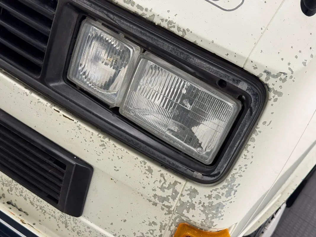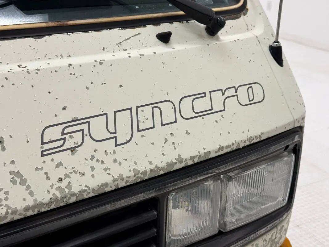 Bathed in single stage Pastel White, and it wears the battle scars of long trips, namely a birdshot pattern of rock chips on the face, and with a billboard flat surface up front, this is not surprising. Beyond that front however, and the paint and body are in very good shape, with an occasional scratch and scuff, and a line of surface rust in a body seam. The cab forward design is unmistakable, and the Syncro sits high on its haunches, poised for some overland treks with all the comforts of home. That includes the roof mounted tent which also provides a pop top roof bed. The sidewalls of the tent are torn but there are aftermarket suppliers with a variety of choices. Vents and hook ups are all in place and intact and the 14inch wheels wear 185R14 tires with a late 2024 date code. Upper panels are populated with windows, tinted in the back and a wide sliding side door allows easy access to the camper section.