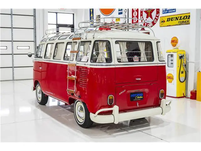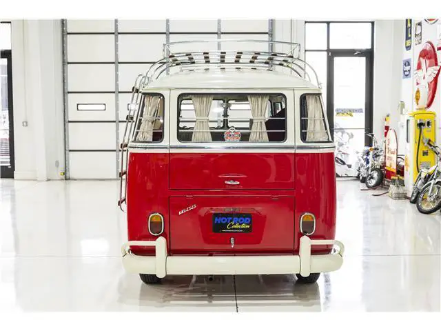 This vehicle can be seen on Hotrodcollection .com Comprehensive rotisserie restoration of a Brazilian-built Volkswagen Bus as a 23-Window Samba replica 1600cc air-cooled flat 4-cylinder engine SP2 4-speed manual transmission with 8x31 gears Air conditioning Mini fridge Faucet 2-burner electric stove Bed 32-inch pop-up TV Retractable outdoor table New safari front windows New electrical system EQUIPMENT LED ceiling lighting Storage compartments throughout the interior Auxiliary battery system connected to an inverter 72 amp alternator capable of charging two batteries with remote control Galvanized hardware throughout Roof rack with ladder Sliding sunroof New steering wheel and speedometer New wheels, tires and hubcaps New brakes