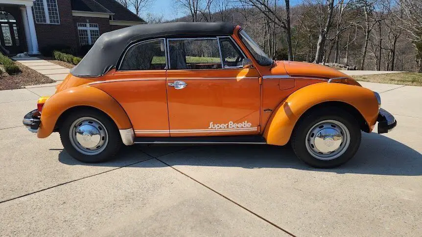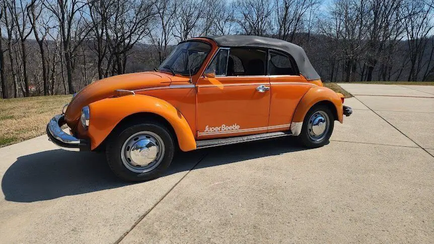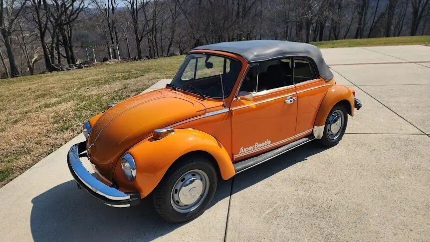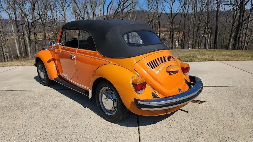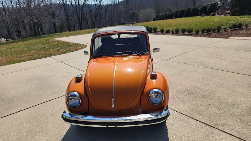 Classic 1975 Volkswagen Beetle convertible. Here she is just in time for convertible season. Finished in orange with a black interior and a black top this little Beetle has new tires and is ready for the road.