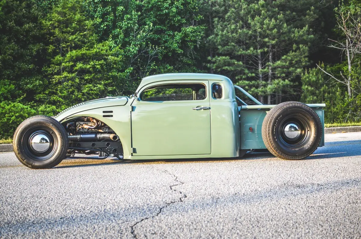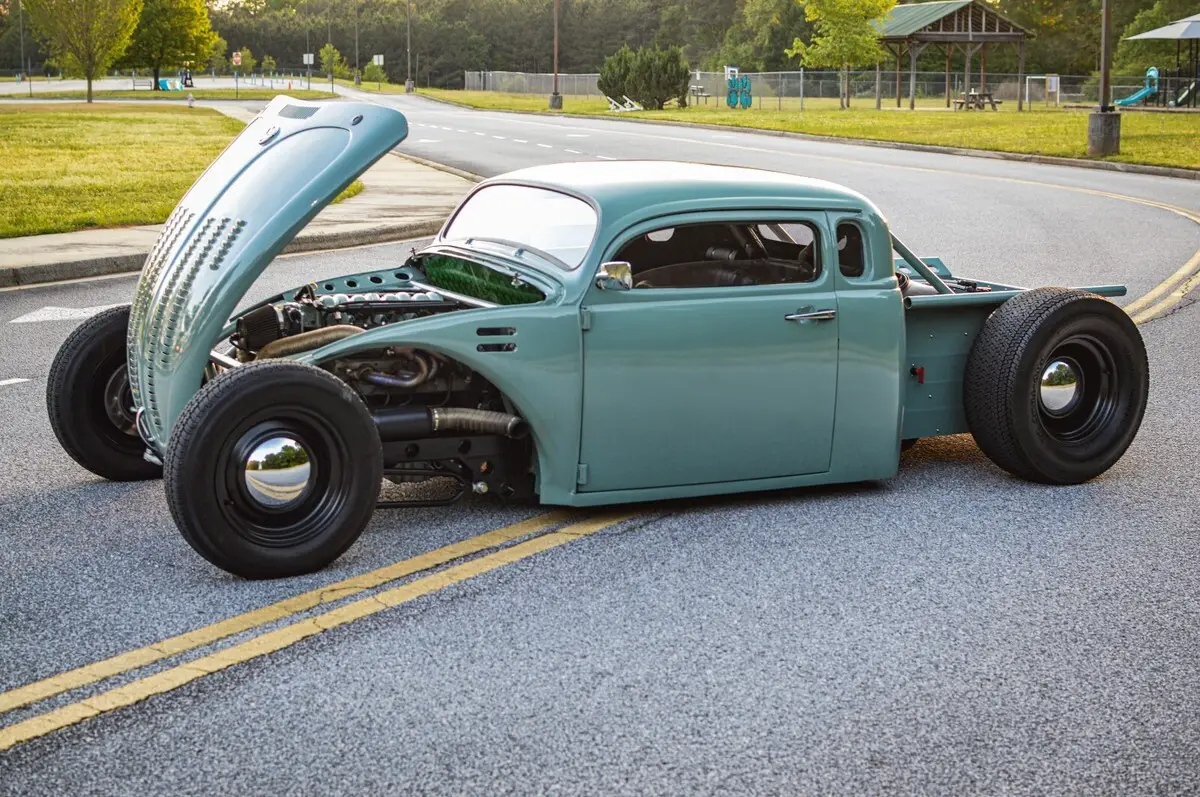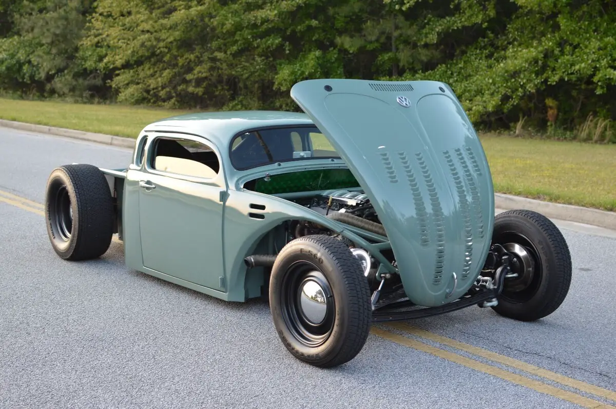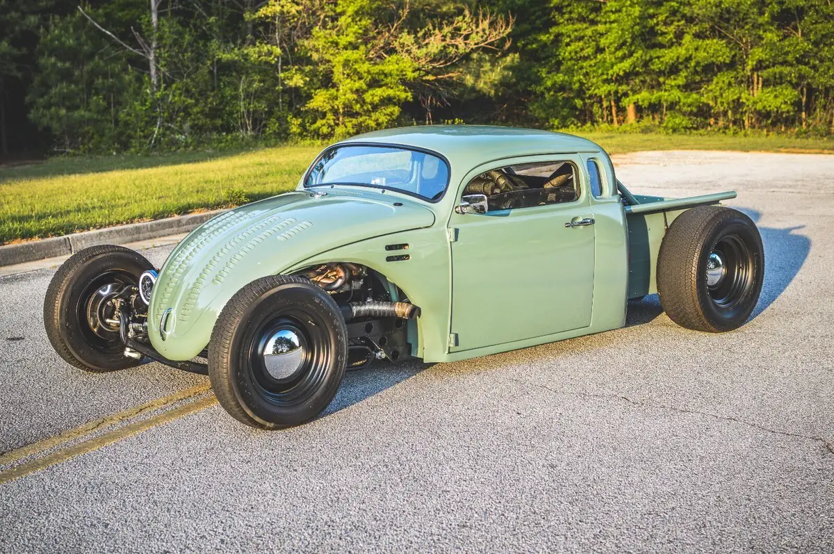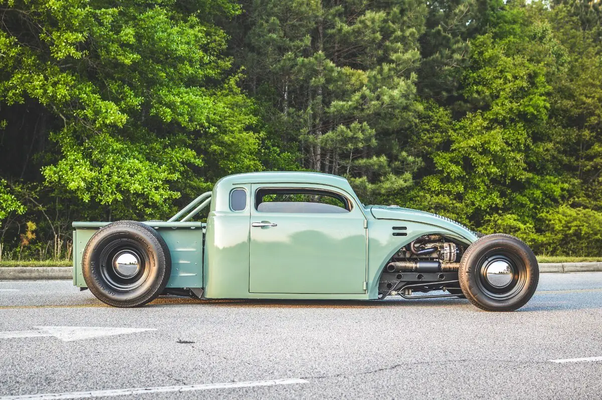 This wild custom started life as a 1969 Volkswagen Beetle and now rides as a chopped, channeled, V8-powered hot rod pickup. It blends a Beetle body with a ’49 Chevy cab, custom built bed, all mounted to a hand-fabricated steel frame with an integrated roll cage.