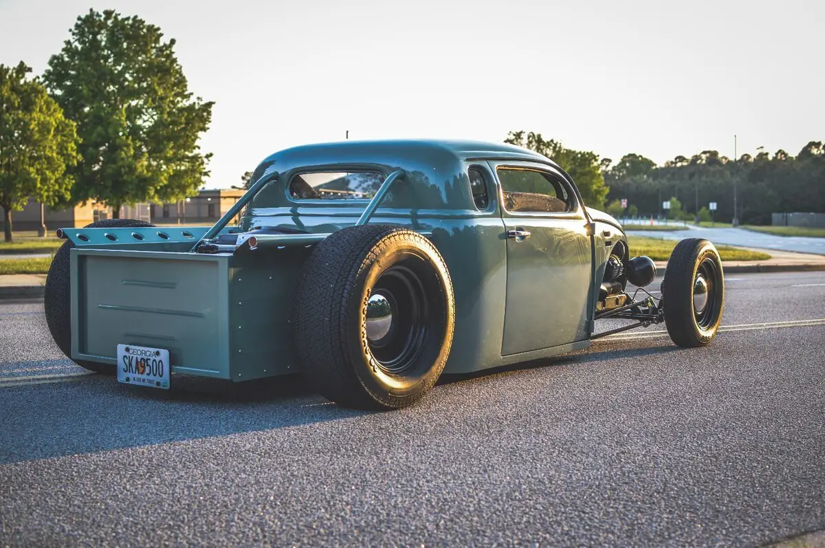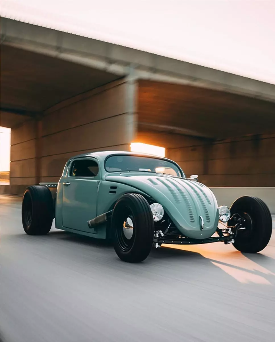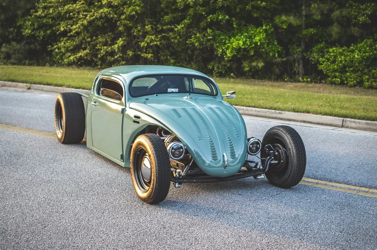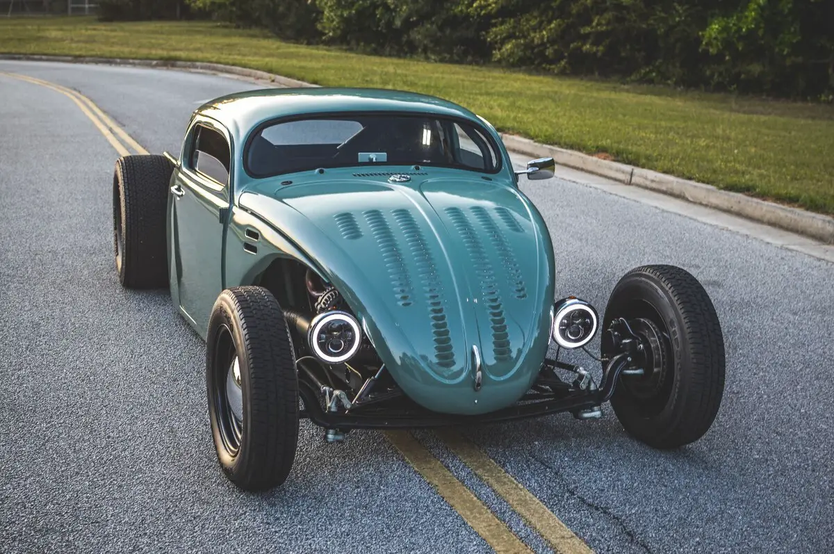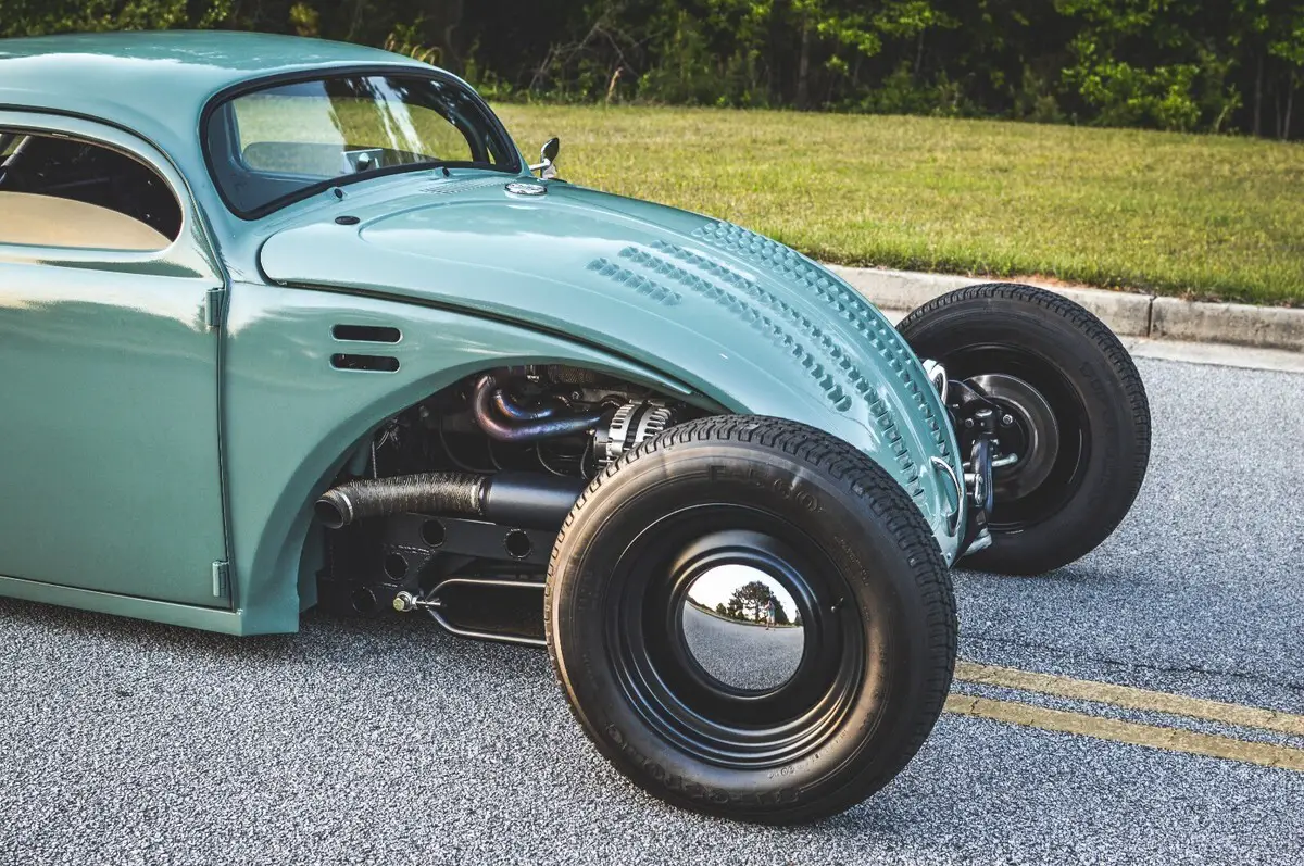 This wild custom started life as a 1969 Volkswagen Beetle and now rides as a chopped, channeled, V8-powered hot rod pickup. It blends a Beetle body with a ’49 Chevy cab, custom built bed, all mounted to a hand-fabricated steel frame with an integrated roll cage.
