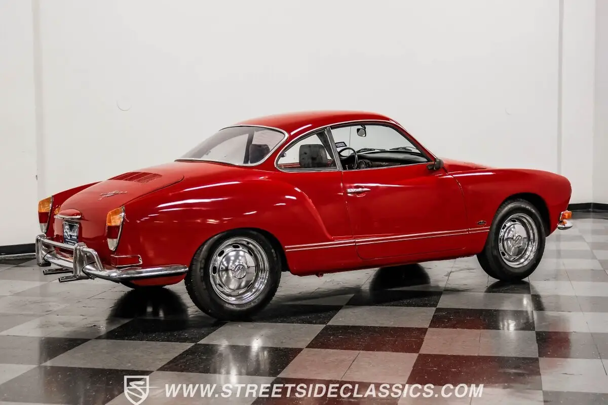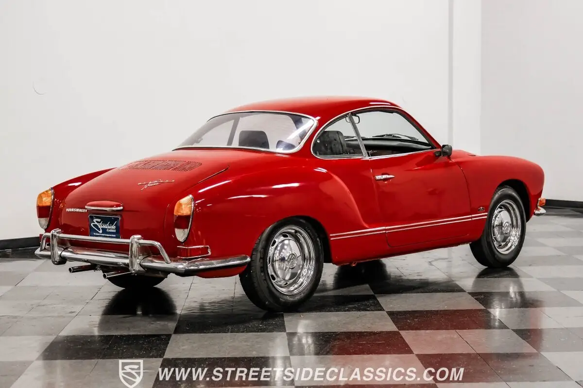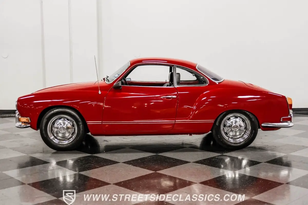 Family-owned since new, this 1970 Volkswagen Karmann Ghia displays vibrant red paint across its distinctive curved bodywork. The unique profile shows off the Italian-influenced German styling that made these vehicles special among their contemporaries. Chrome wheels with substantial dog dish hubcaps add a period-correct appearance while maintaining the stock ride height. The 165/80R15 Nexen tires wrap around the wheels for a balanced look. The front end features a clean look with round headlights flanking the small grille, while the back shows off the subtle taillight design unique to the Karmann Ghia.