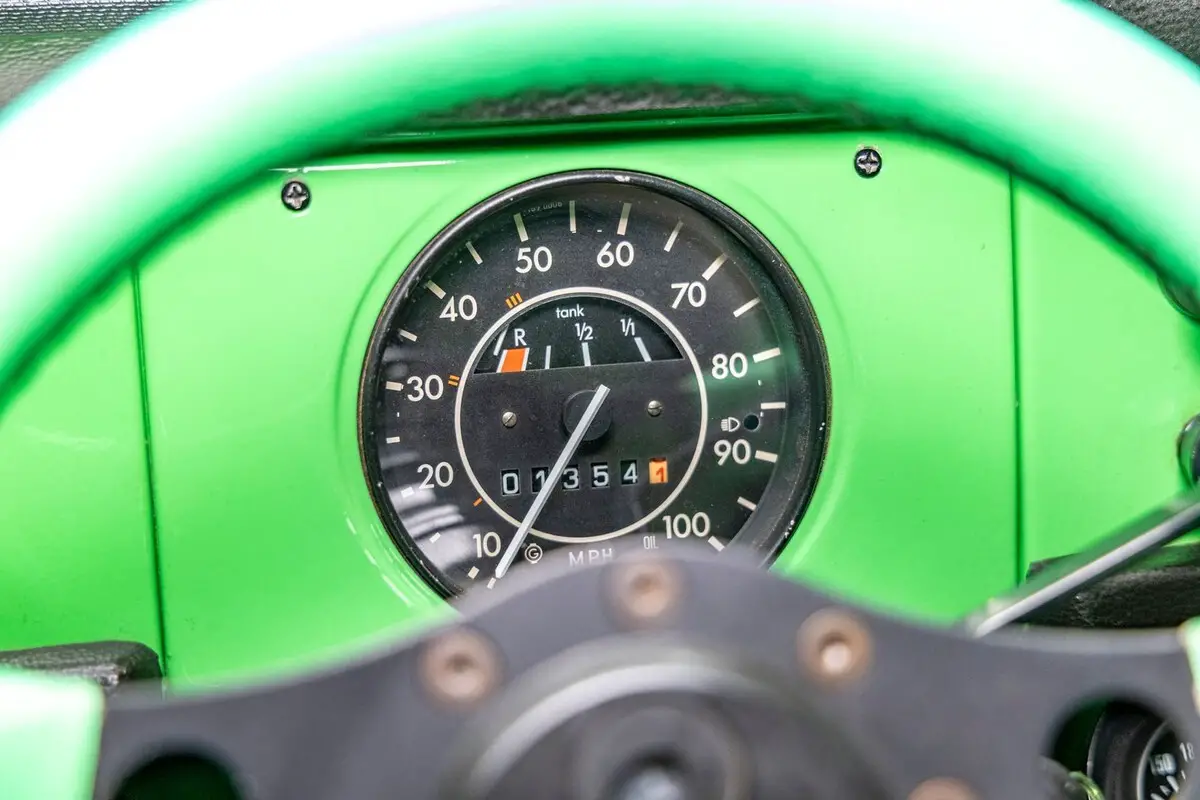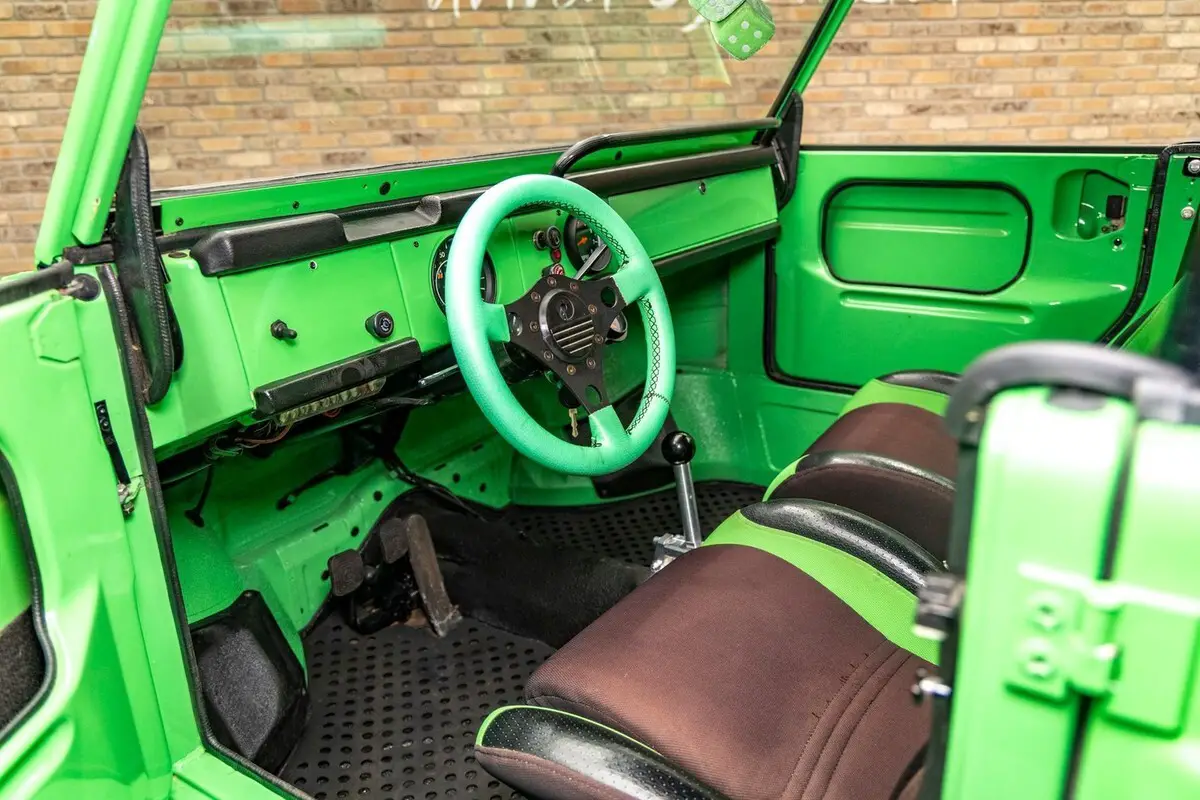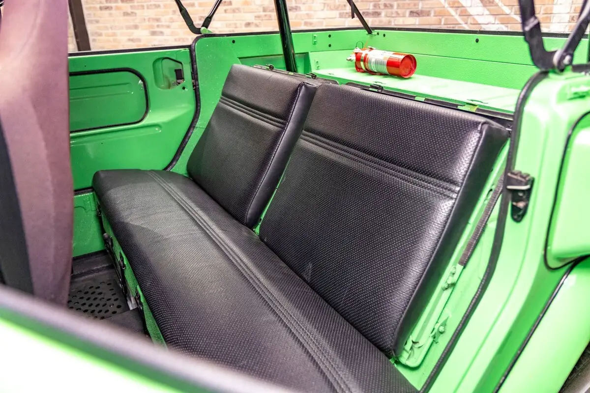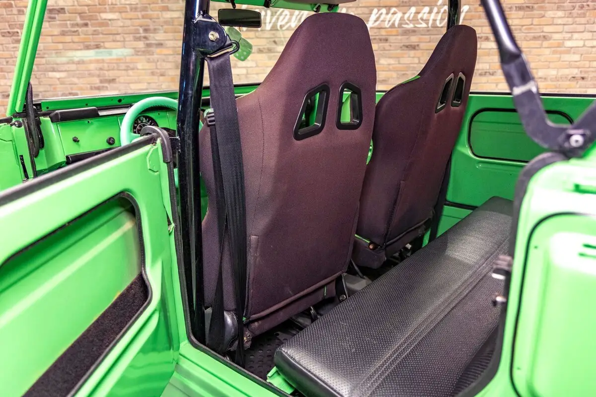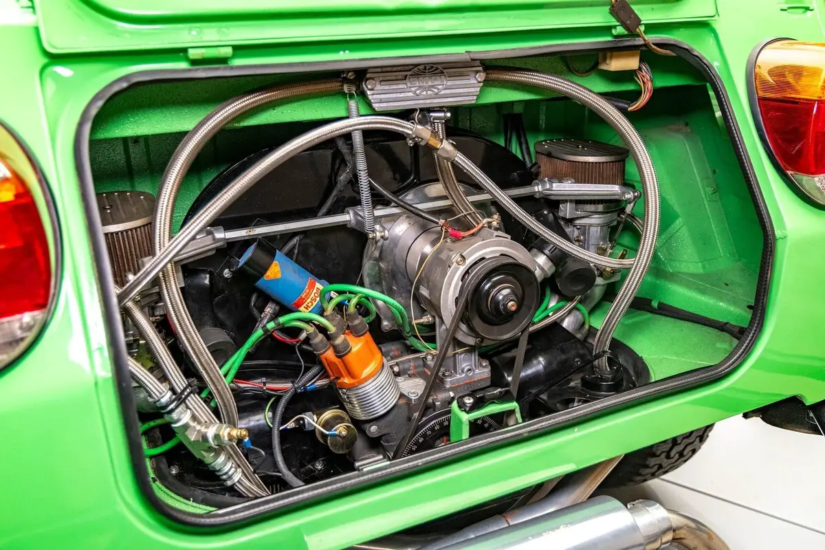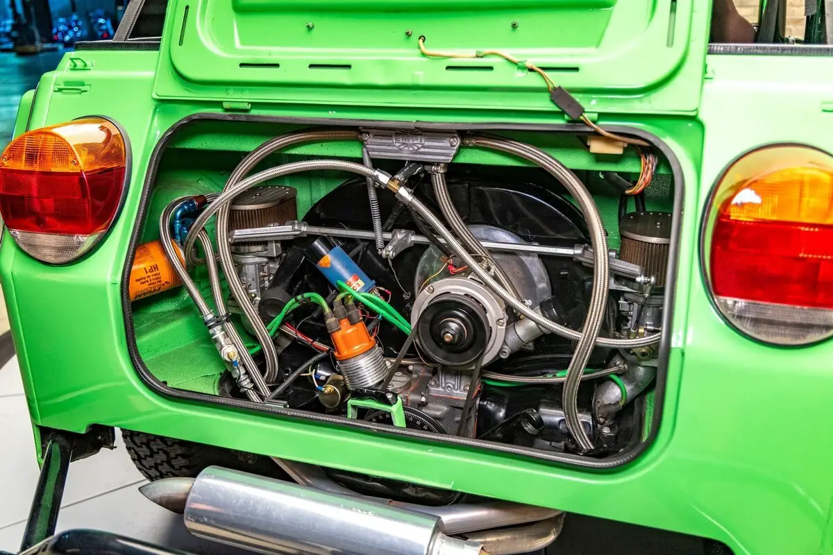 Dual Weber carbs deliver the fuel with classic air-cooled flair, while a rebuilt transaxle keeps everything shifting smoothly. The ride is supported by 15-inch wheels and improved stopping power comes from upgraded front disc brakes. Custom bumpers, a roll bar, and a raised stance give it a subtle off-road attitude that fits its go-anywhere roots.